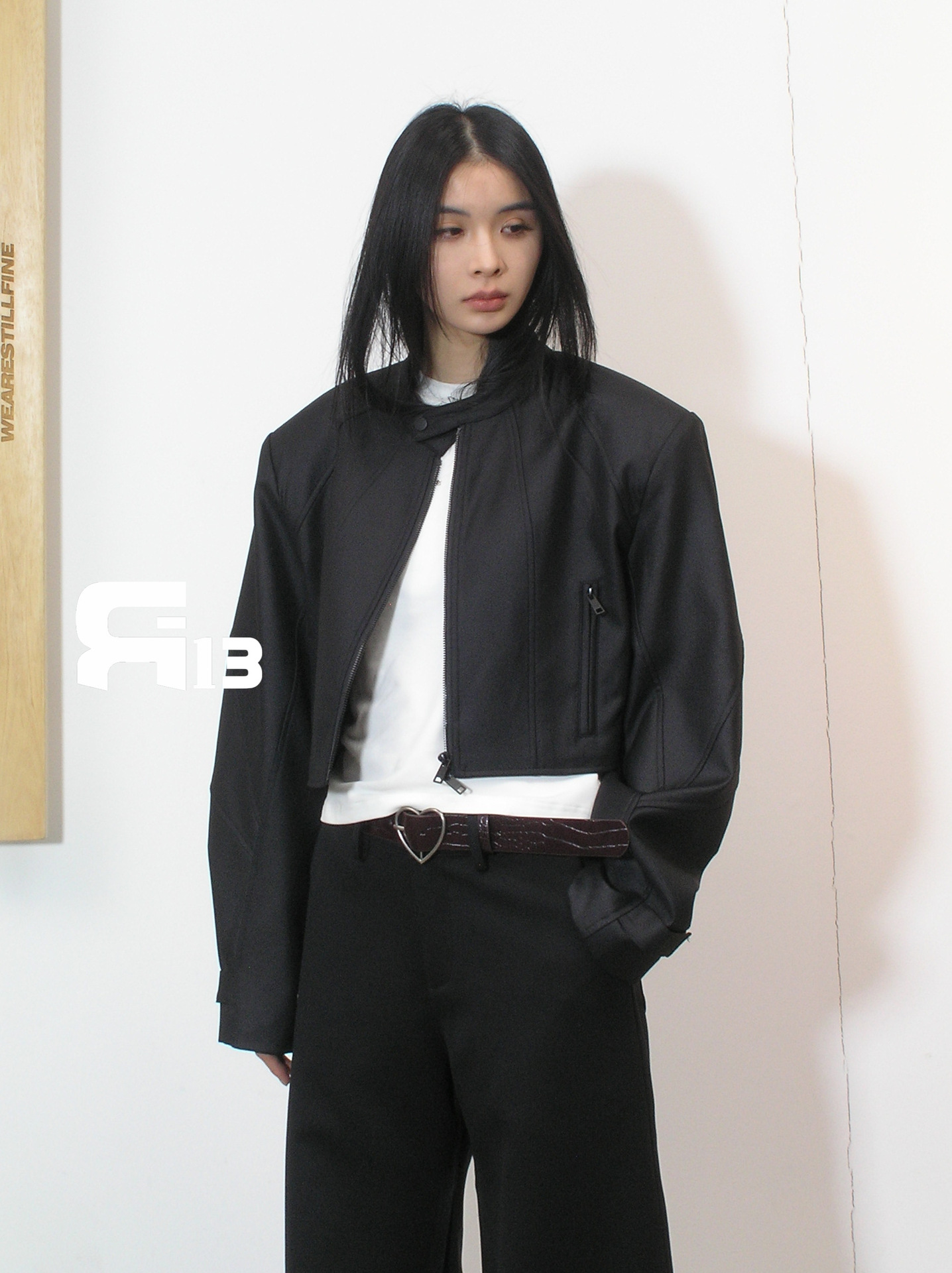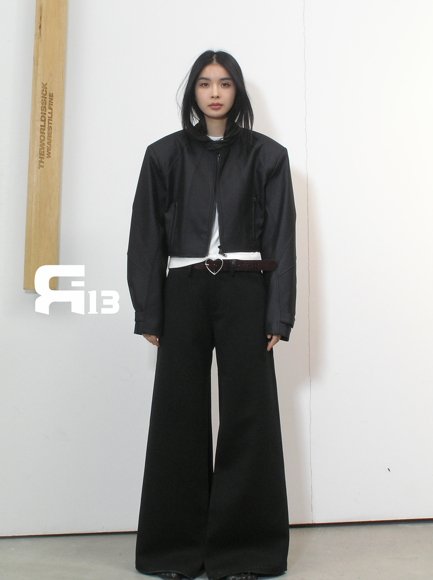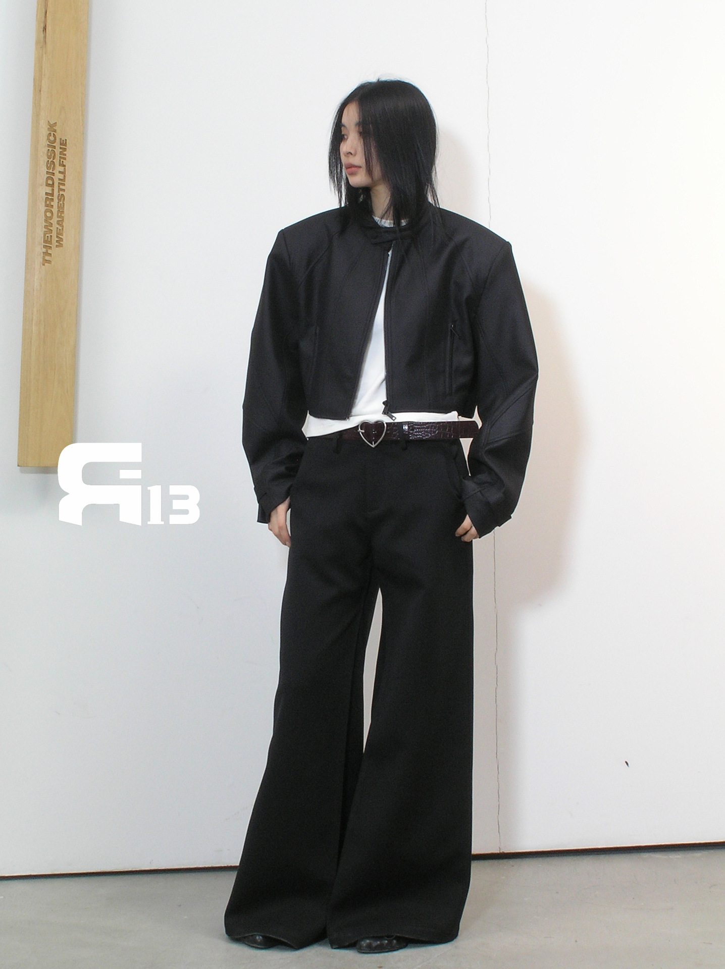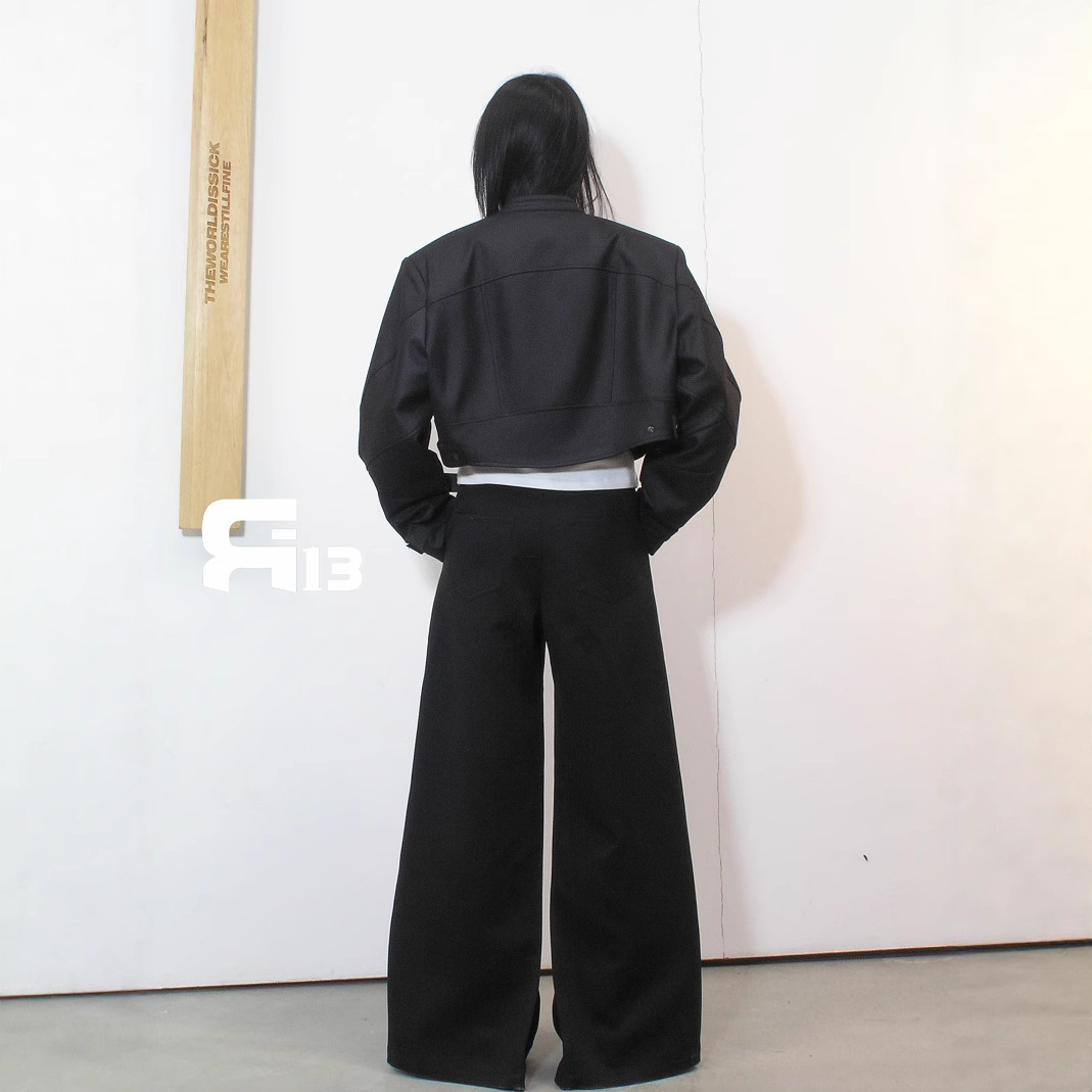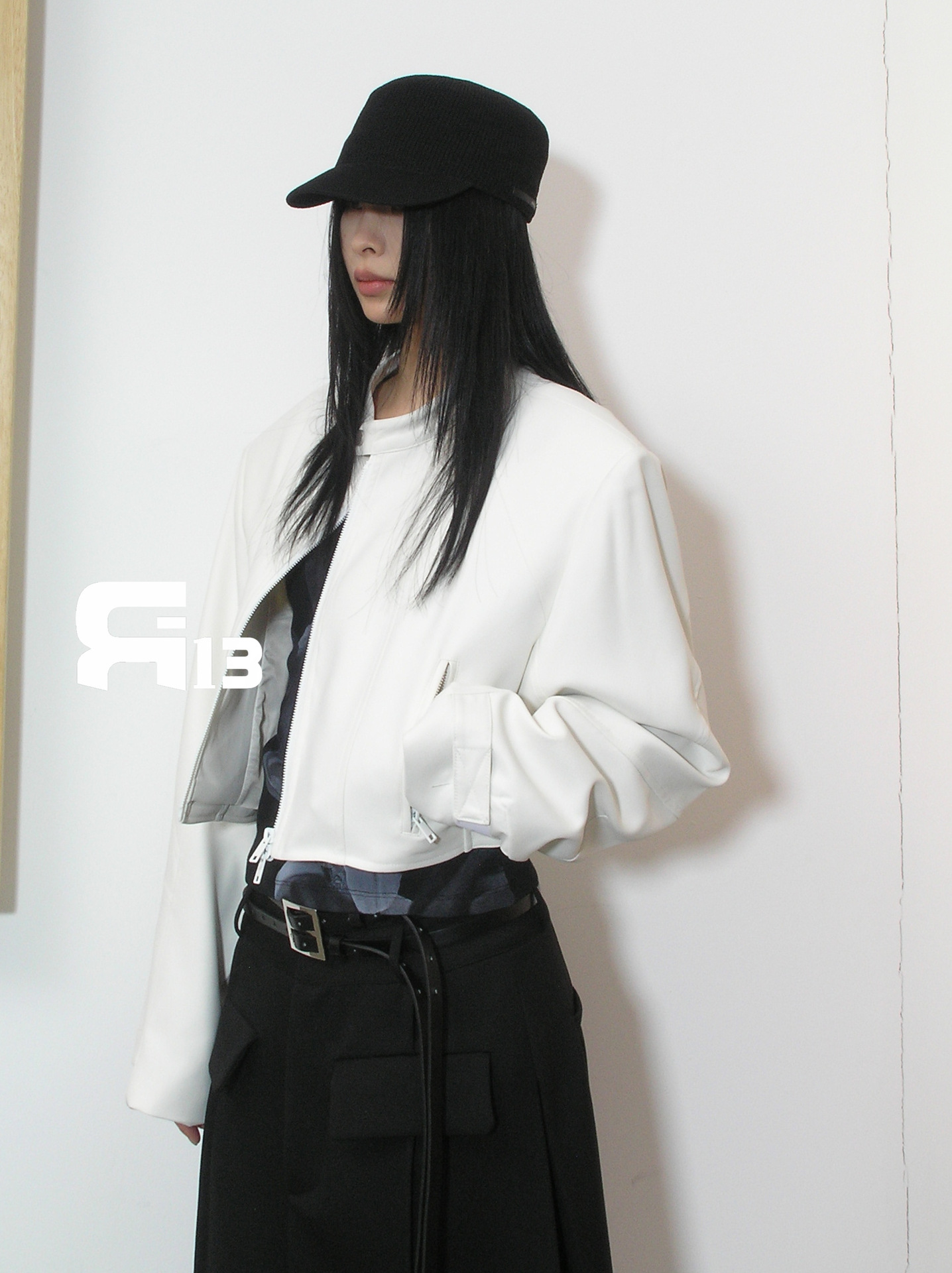 R13 Faux Leather Short Zipper Jacket Jacket Long Sleeve Cardigan Black / White