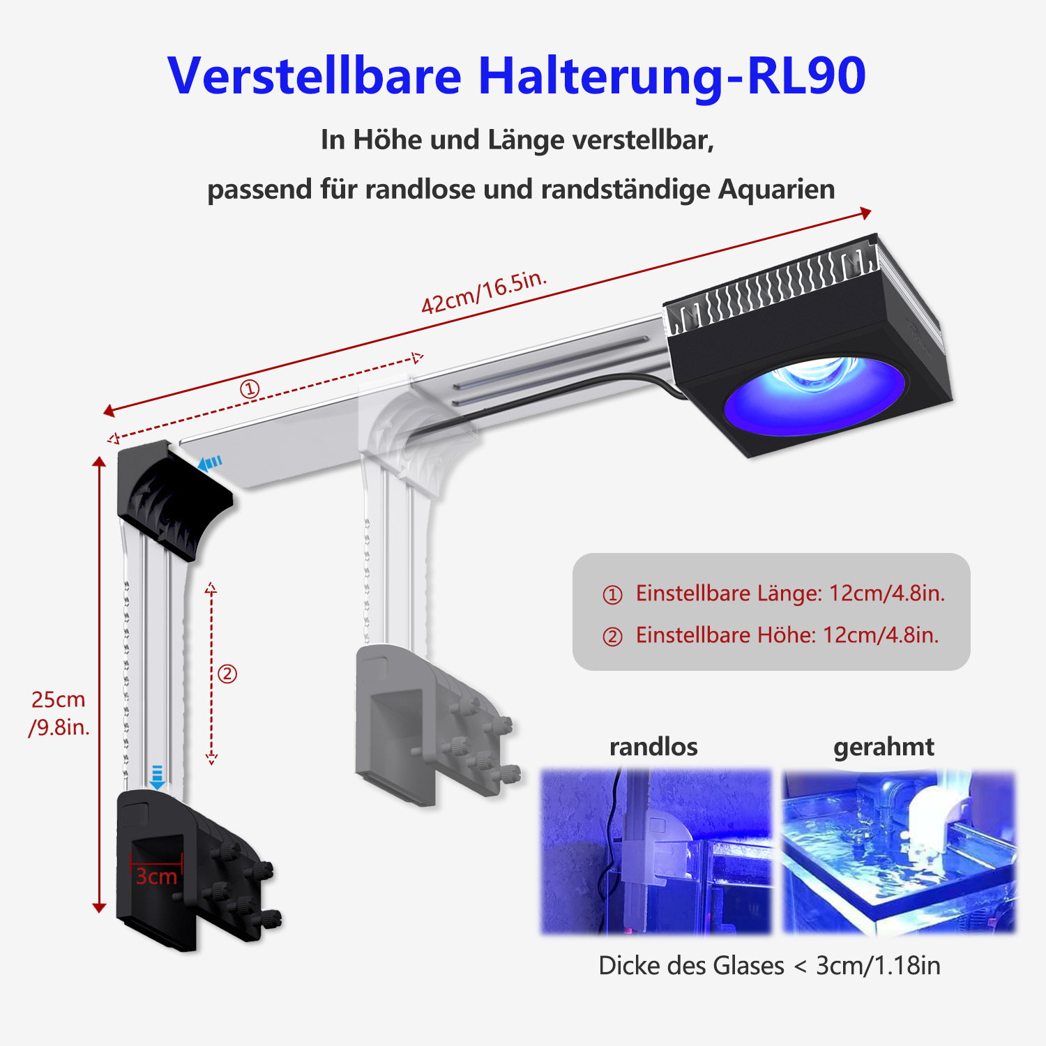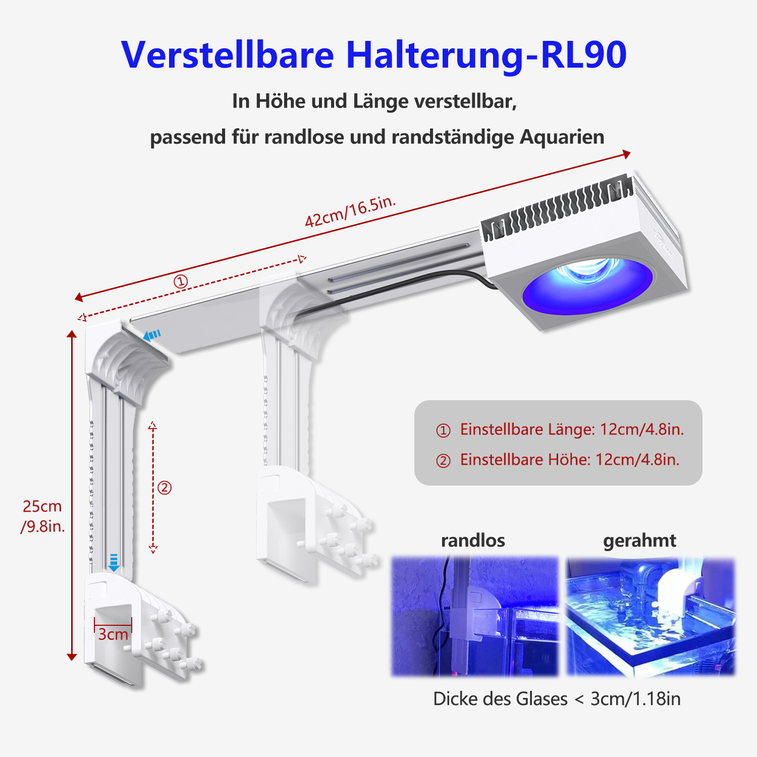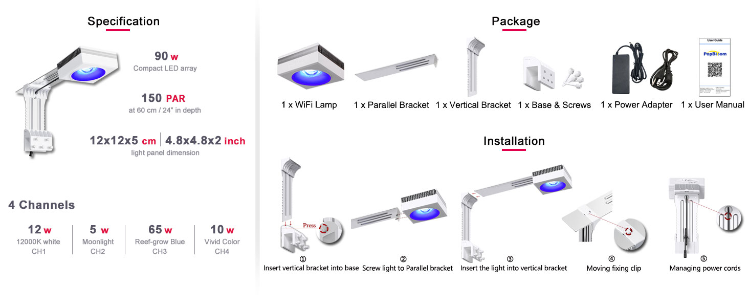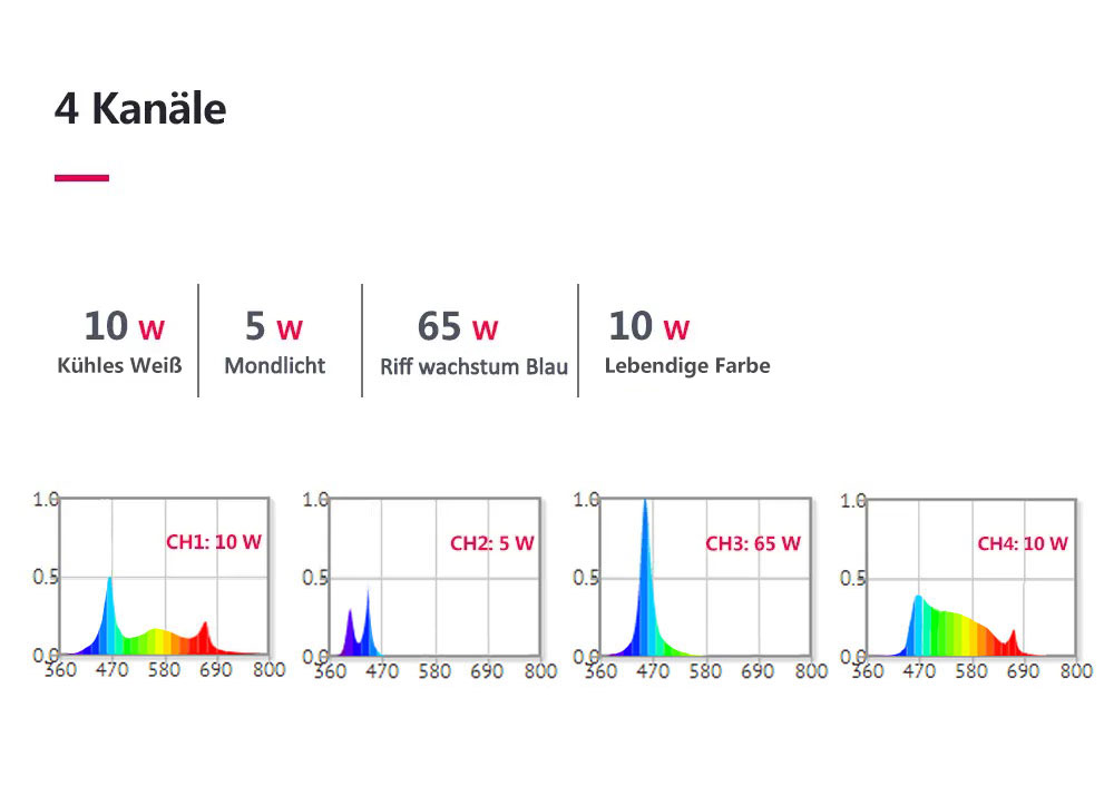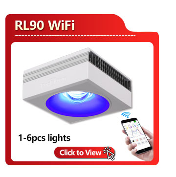 RL90 ist Riff-Spektrum, aber die LED-Auswahl bevorzugt die blauen Kanäle und eine hohe Leistung für die Verwendung mit dem Corallab AB+-Spektrum.
