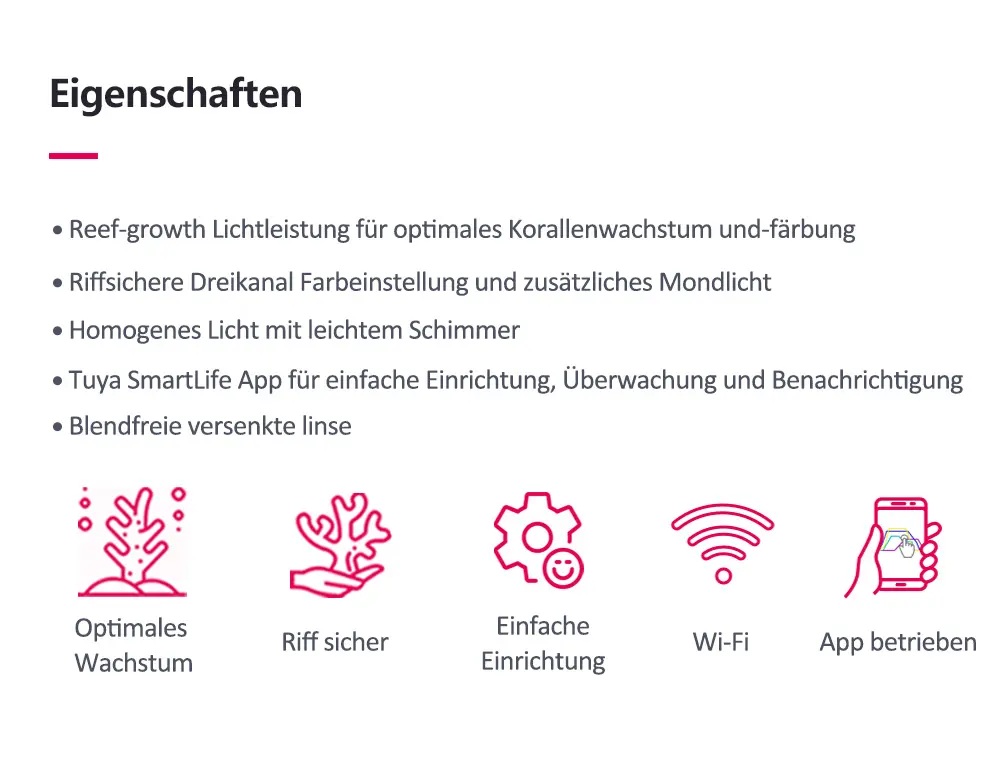 Die neu gestaltete Optik sorgt für eine gleichmäßige Lichtverteilung, die Ihr Aquarium mit einer Abdeckung von bis zu 80 cm abdeckt. Diese gleichmäßige Abdeckung minimiert Hotspots und erzeugt einen Effekt, der dem einer Metallhalogenid/T5-Kombination ähnelt.
