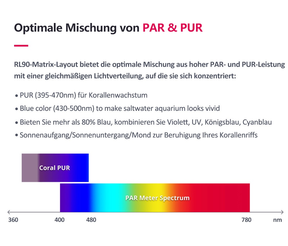 RL90LEDs konzentrieren sich auf diese wesentlichen Wellenlängen und priorisieren Korallenwachstum und -ausbreitung gegenüber überhöhten PAR-Messwerten.
