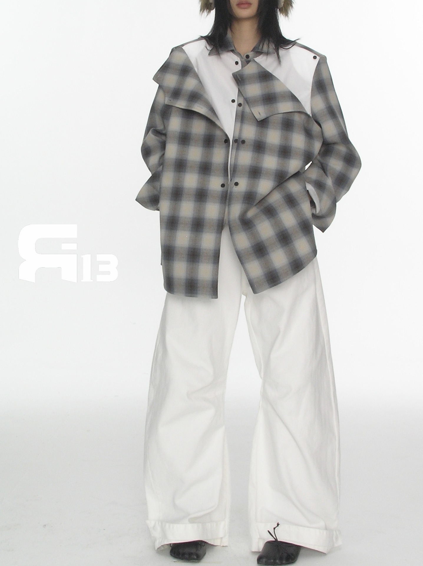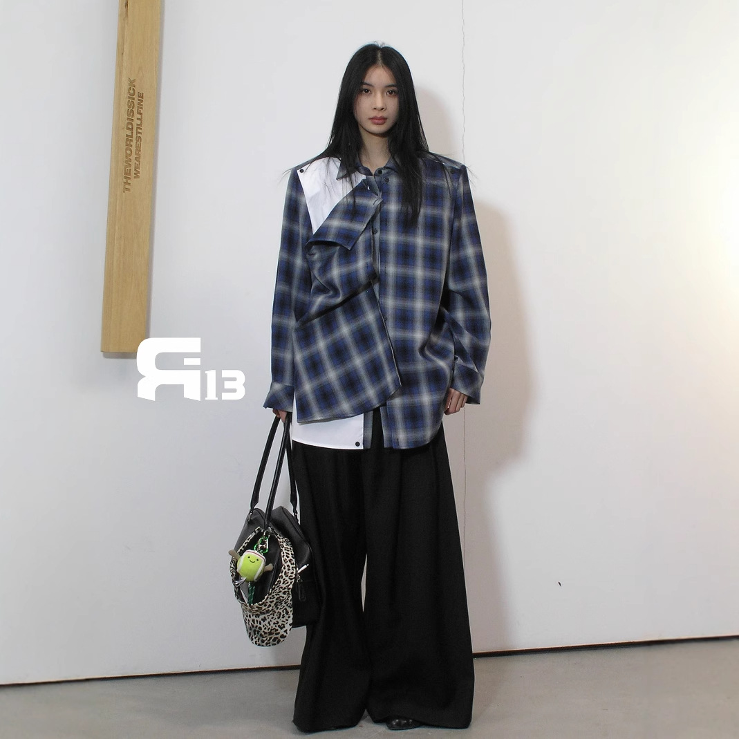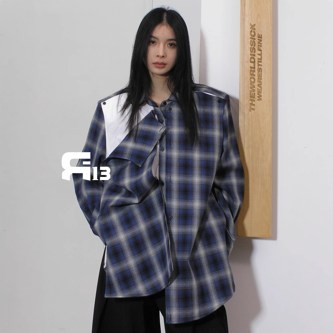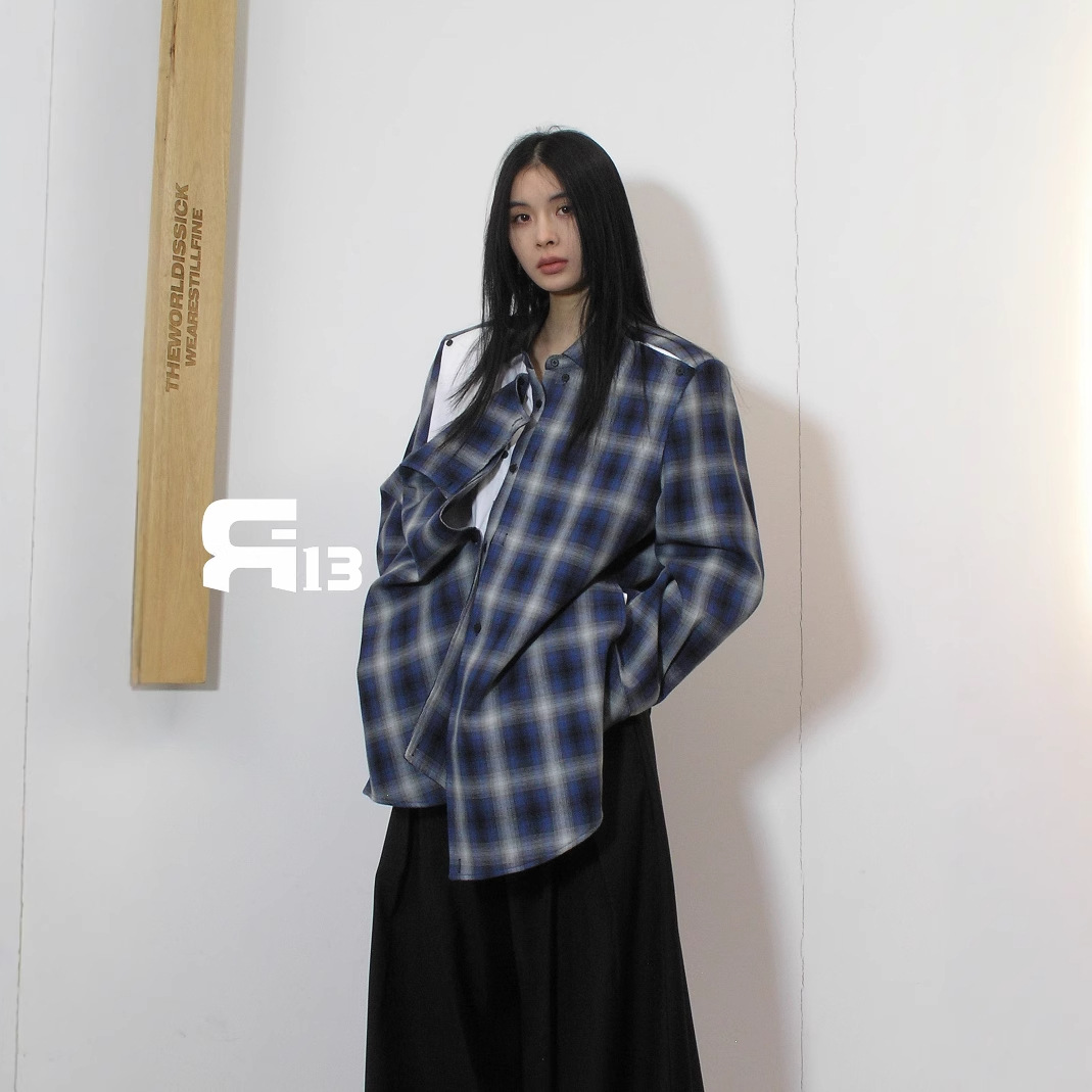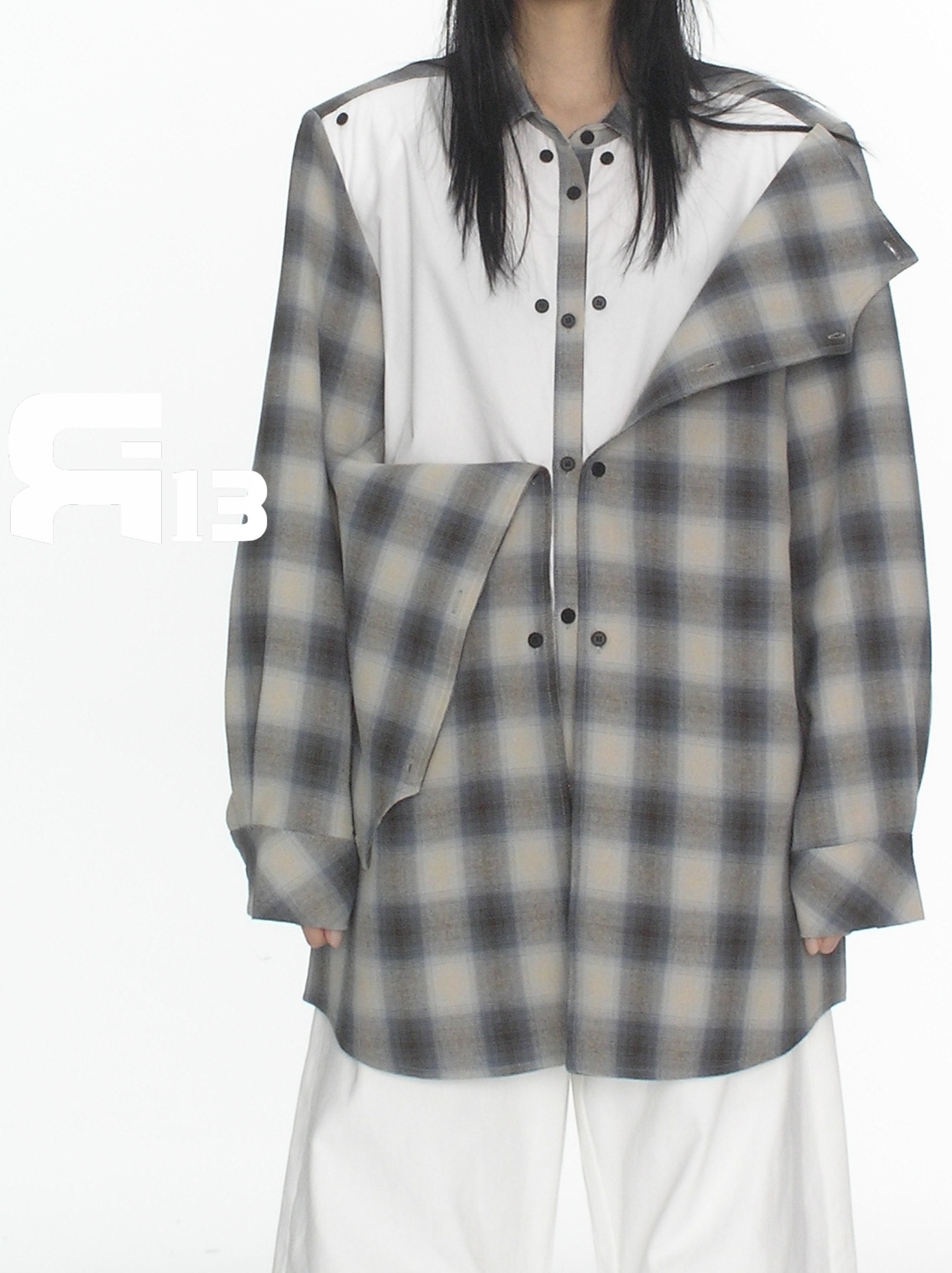R13 Spliced Plaid Shirt, Coat Women's Button-up Top Irregular Button S Loose