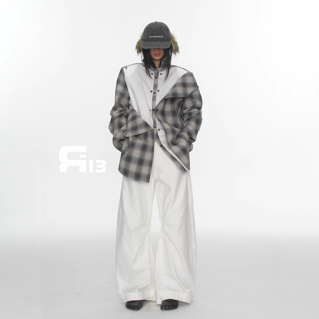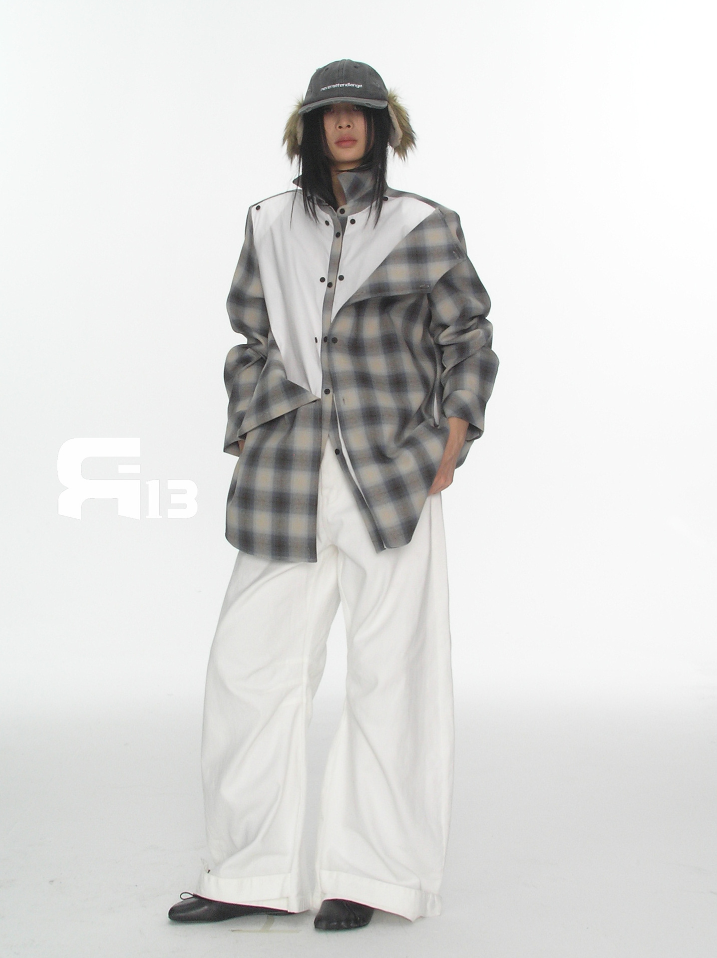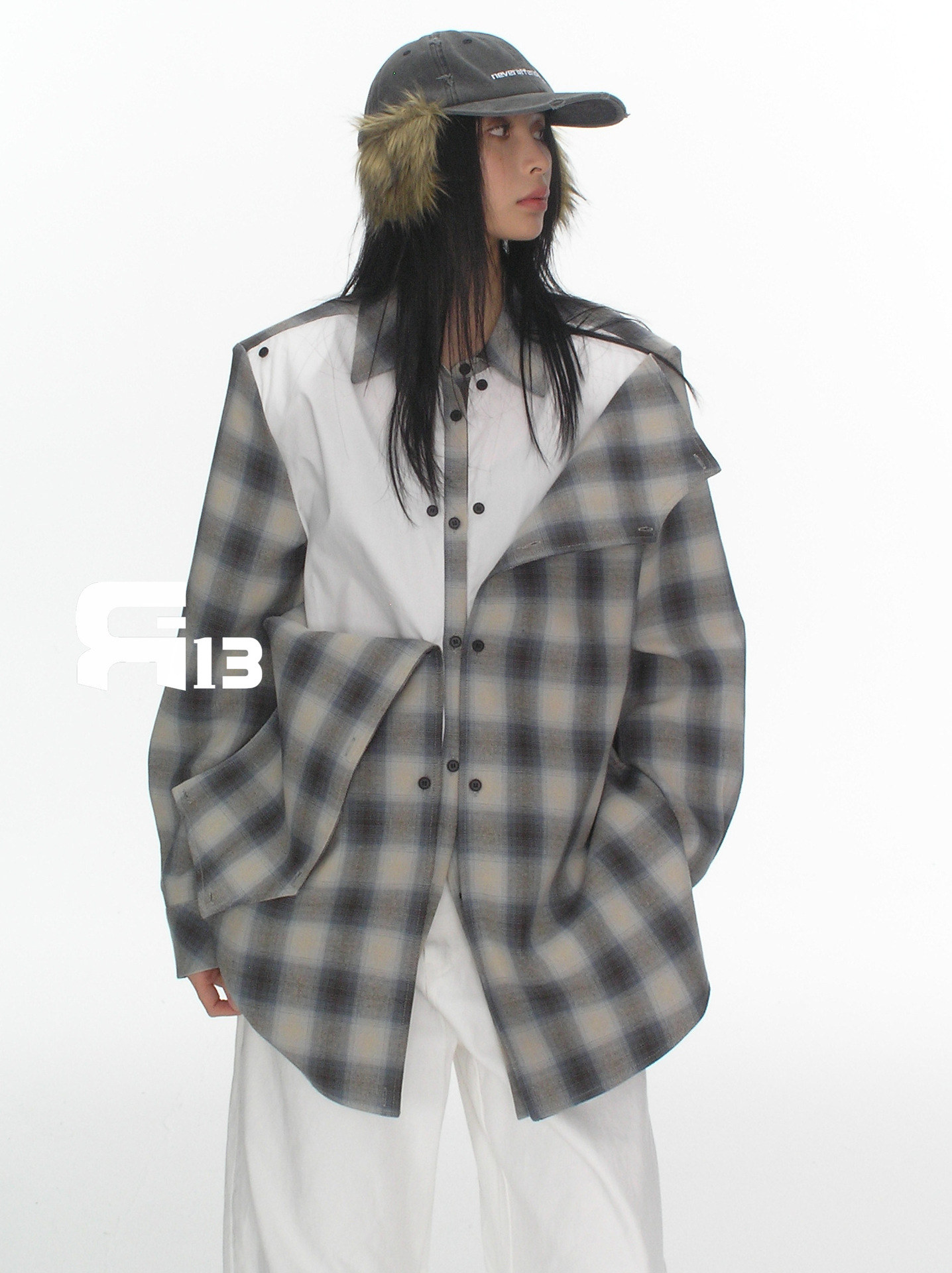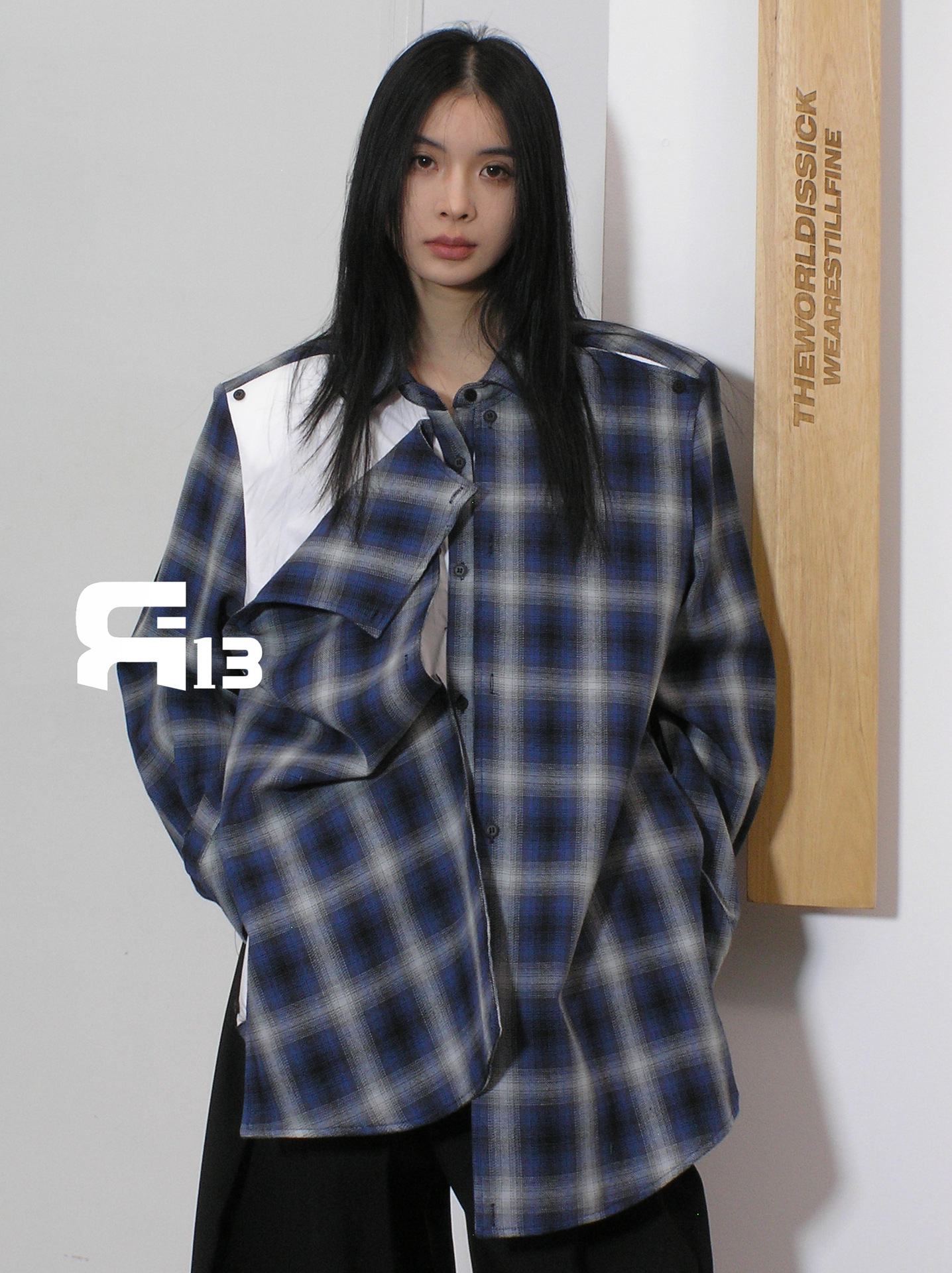 R13 Spliced Plaid Shirt, Coat Women's Button-up Top Irregular Button S Loose