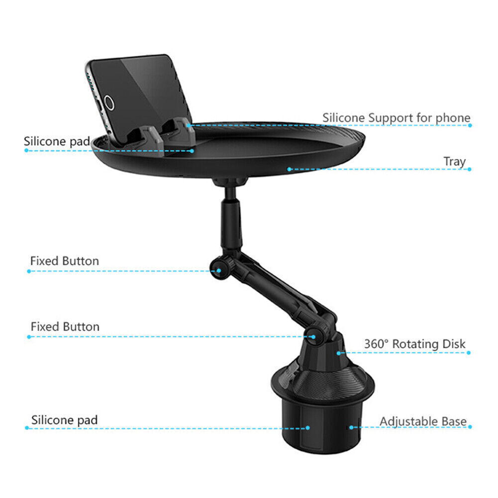 * Extensive adjustability: A 360° swivel arm and an articulated arm provide full adjustability, so you can set the car tray as needed, or rotate it back and forth between the driver and the passenger.