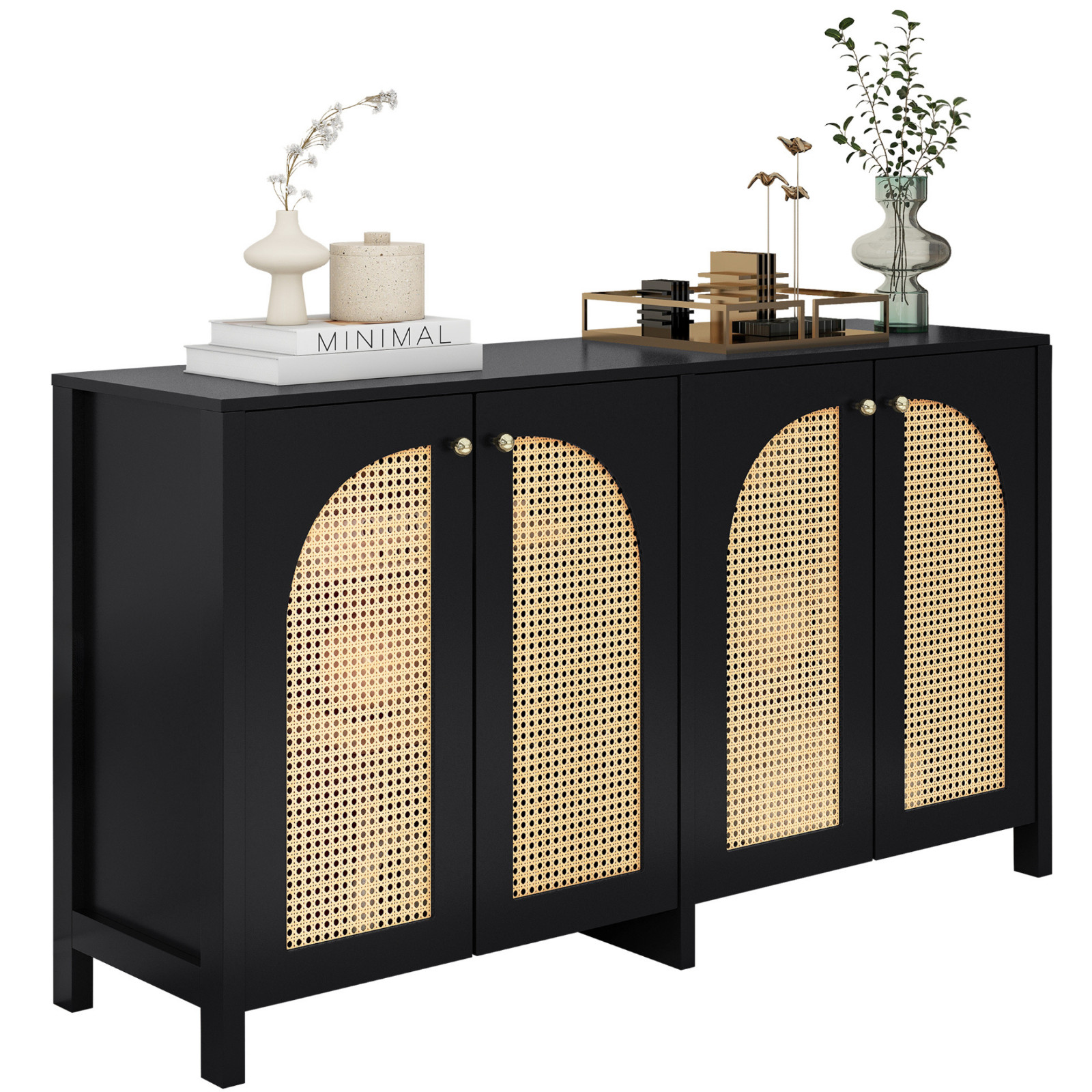 Stilvolles Design mit gebogenen Rattantüren: Das Sideboard besticht durch vier elegant gebogene, ausgehöhlte Türen mit dekorativem Kunst-Rattan-Einsatz. Diese sorgen nicht nur für eine natürliche Optik, sondern bringen auch Leichtigkeit und Struktur in den Raum. Die geschwungene Form verleiht dem Möbelstück eine moderne und organische Ausstrahlung, die sich harmonisch in verschiedenste Wohnstile einfügt – ob Boho, Scandi oder modern minimalistisch.