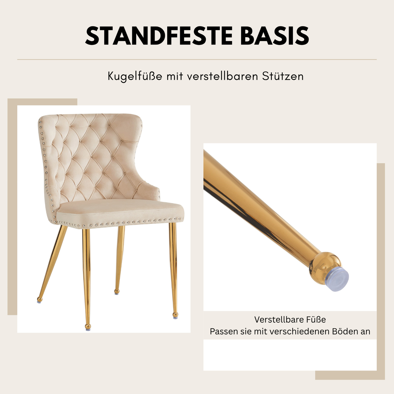 Dieses 2-teilige Esszimmerstuhl-Set überzeugt mit einer Kombination aus Komfort und Eleganz. Die Sitzfläche und Rückenlehne sind mit einem 8 cm dicken, hochelastischen Schwamm gepolstert und mit weichem Samt bezogen. Eine dekorative Rautensteppung sowie stilvolle Ziernägel am Rand verleihen den Stühlen einen edlen, klassischen Look. Die stabilen Metallfüße mit kugelförmigem Abschluss bieten nicht nur Standfestigkeit, sondern setzen auch ein modernes Design-Statement. Dank der verstellbaren Stützfüße stehen die Stühle selbst auf unebenen Böden jederzeit sicher und wackelfrei.