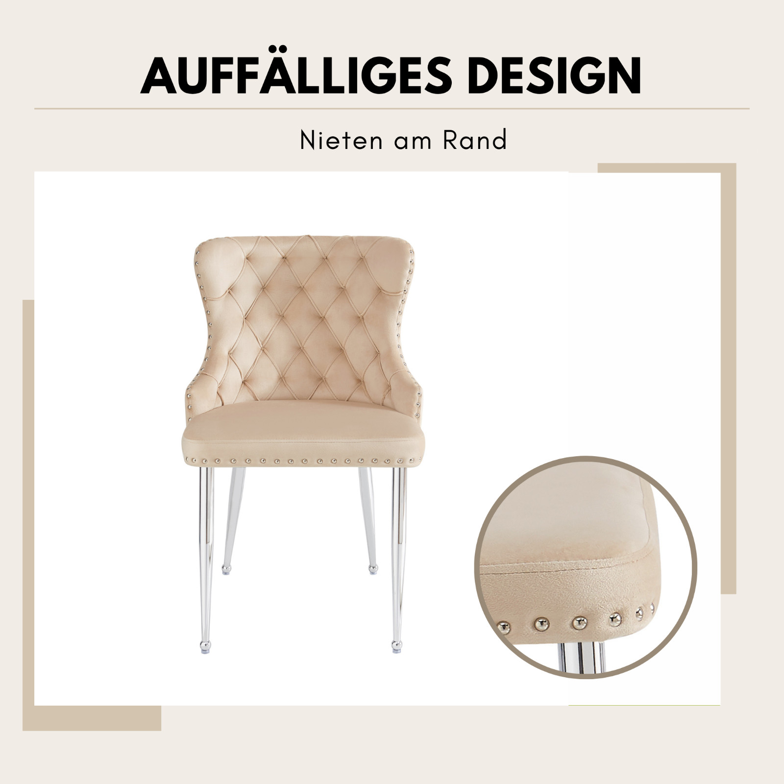 Nietenverzierung für einen klassischen Akzent: Ein umlaufender Rand mit dekorativen Nieten unterstreicht das edle Erscheinungsbild der Stühle. Die Kombination aus traditioneller Verzierung und modernem Stoffbezug sorgt für eine harmonische Balance zwischen Vintage-Charme und zeitgenössischer Eleganz.