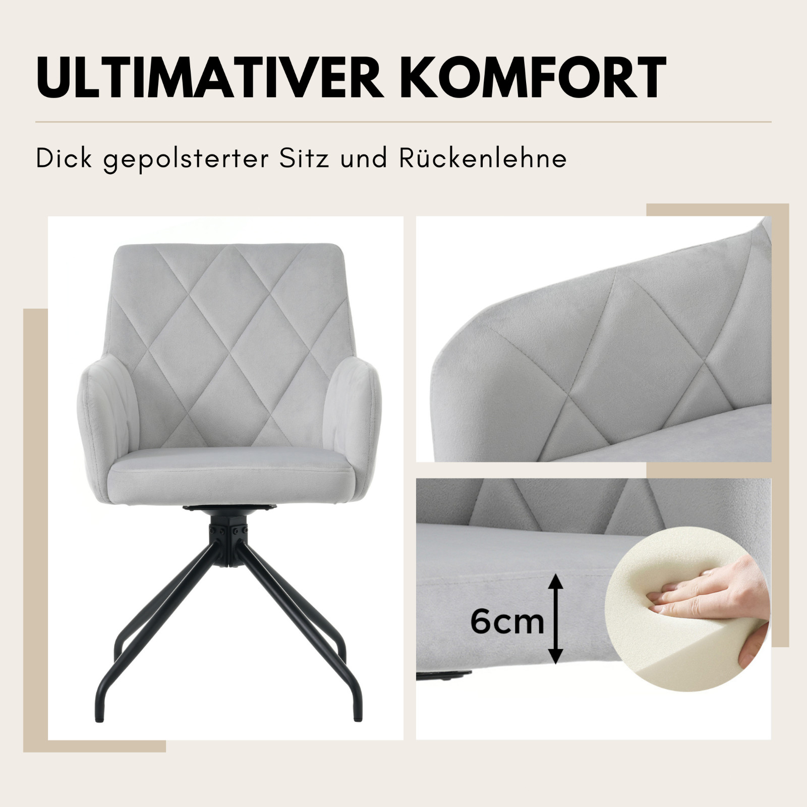 Bringen Sie einen Hauch von Eleganz in Ihr Esszimmer mit dem Velvet Drehstuhl-Set aus 2 Stühlen. Diese Armlehnstühle verbinden Luxus mit Praktikabilität und verfügen über ein edles, diamantgestepptes Design, das zeitlose Eleganz ausstrahlt. Die vielseitige 360-Grad-Drehfunktion ermöglicht mühelose Bewegungen, ideal für gesellige Zusammenkünfte oder entspanntes Essen. Bezogen mit weichem Samt, bieten diese Stühle unvergleichlichen Komfort durch großzügig gepolsterte Arm- und Rückenlehnen. Gefertigt mit einem stabilen Rahmen aus Sperrholz und Metall, bieten sie bemerkenswerte Haltbarkeit und Unterstützung mit einer Tragfähigkeit von bis zu 150 kg. Die Montage ist kinderleicht und dauert nur 10 Minuten, sodass Sie schnell die Schönheit und den Komfort dieser Stühle genießen können.