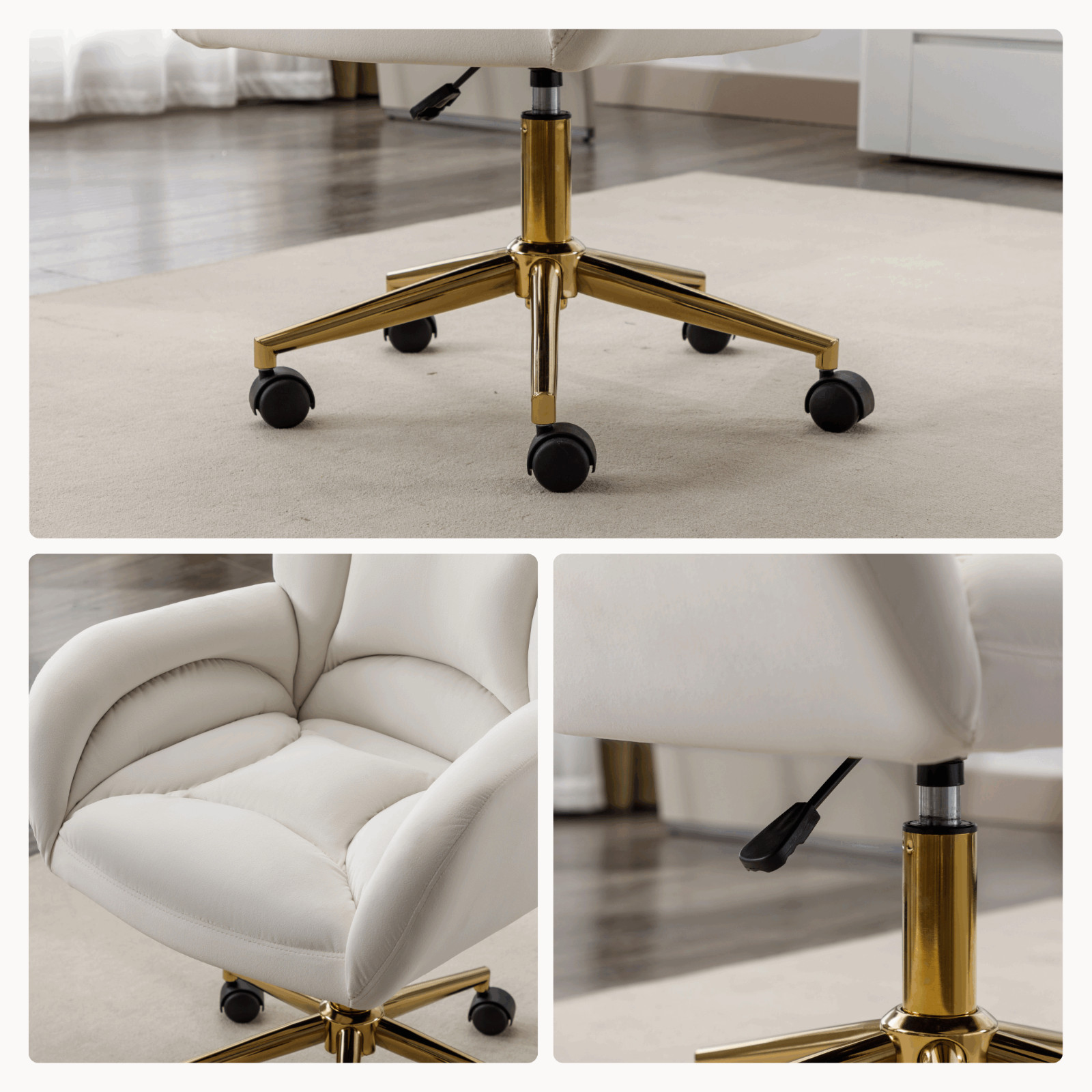 Dieser Stuhl besteht aus weichem Samtmaterial mit eleganter Glanzoberfläche, das das Raumgefühl aufwertet. Das zonale Unterstützungdesign bietet präzisen Komfort, während die dicke Schaumstoffpolsterung ein wolkenähnlich weiches Erlebnis vermittelt. Der Stuhl unterstützt eine Höhenverstellung von 10 cm und eine 360°-Drehfunktion, ausgestattet mit Rollen für Flexibilität und Bequemlichkeit. Die goldene Metallbasis trägt bis zu 100 kg, bietet stabile Sicherheit und ein modernes, luxuriöses Design.