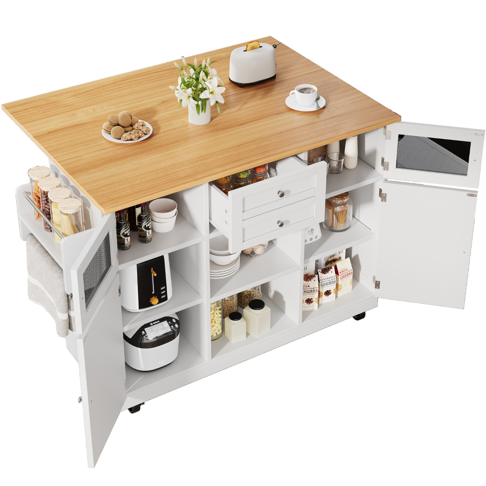 Diese vielseitige Kücheninsel bringt Funktionalität und Stil in Ihre Küche. Die klappbare Tischplatte in natürlicher Holzoptik lässt sich je nach Platzbedarf flexibel anpassen. Im Zentrum sorgen eine Schublade, offene Fächer sowie zwei Gittertür-Fächer für geordneten Stauraum. Zusätzlich bieten die beiden Seitenschränke mit verstellbaren Einlegeböden reichlich Platz für Ihre Küchenutensilien. Das seitliche Gewürzboard sowie zwei Handtuchhalter ergänzen die praktische Ausstattung. Durch fünf 360°-Rollen – davon zwei feststellbar – ist die Insel mobil einsetzbar und bietet sowohl Stabilität als auch Flexibilität im Alltag. Ideal als Arbeitsfläche, Stauraum oder Servierhilfe.