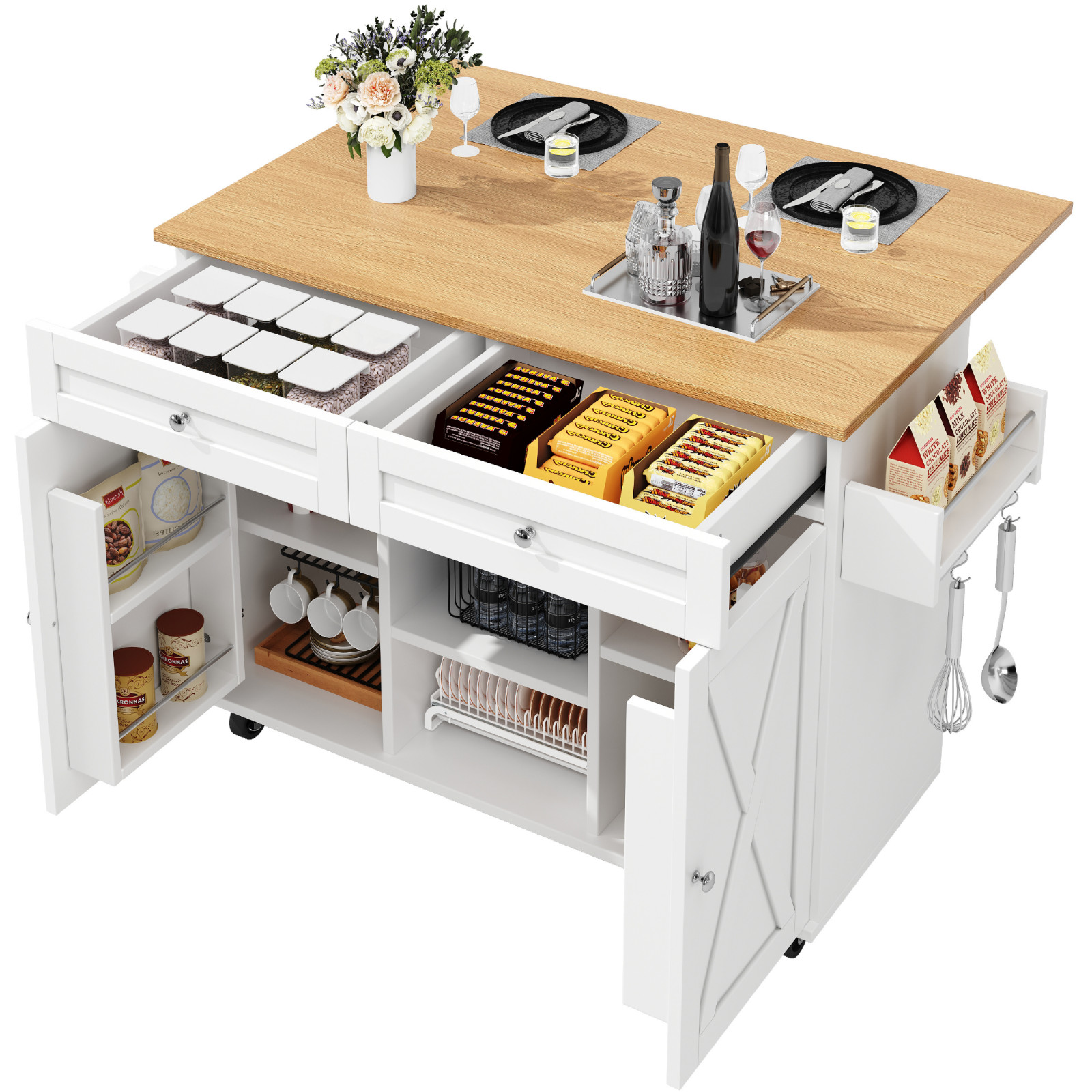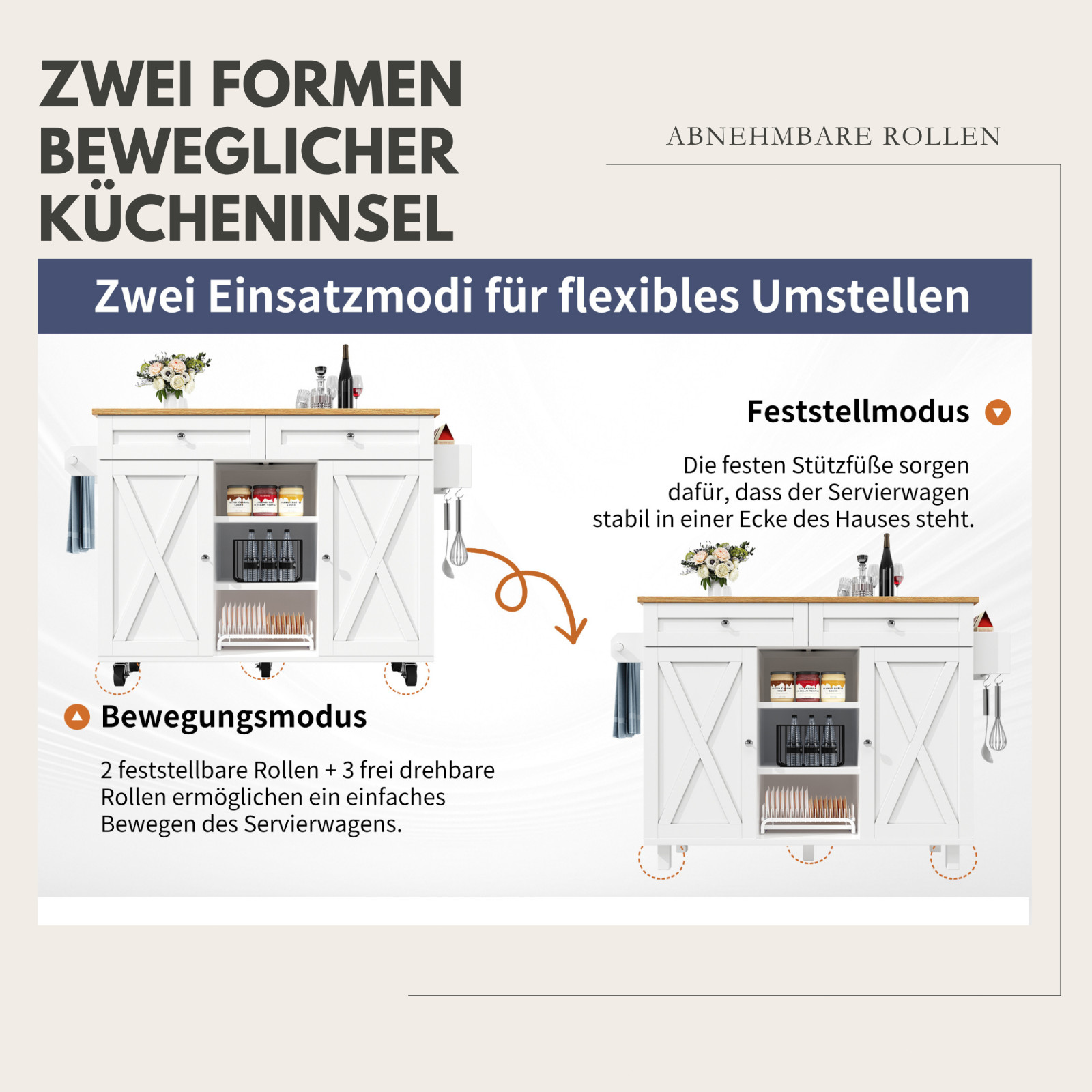 Diese durchdachte Kücheninsel ist die perfekte Lösung für mehr Arbeitsfläche und Stauraum in Ihrer Küche. Die klappbare Tischplatte in natürlicher Holzoptik sorgt für Flexibilität und Stil, während das clevere Stauraumkonzept mit Schubladen, offenen und geschlossenen Fächern samt Einlegeböden alles ordentlich organisiert hält. Zusätzlich bieten vier Türregale mit Schutzgeländern praktischen Platz für Gewürze und Küchenhelfer. Besonders funktional: Auf einer Seite befinden sich ein Halter mit zwei Haken und ein Gewürzboard – auf der anderen ein Handtuchhalter. Dank fünf mobiler Rollen (zwei mit Feststellbremse) ist die Insel überall einsatzbereit, kann bei Bedarf aber auch fest positioniert werden. Ein echtes Allround-Talent für jede Küche!
