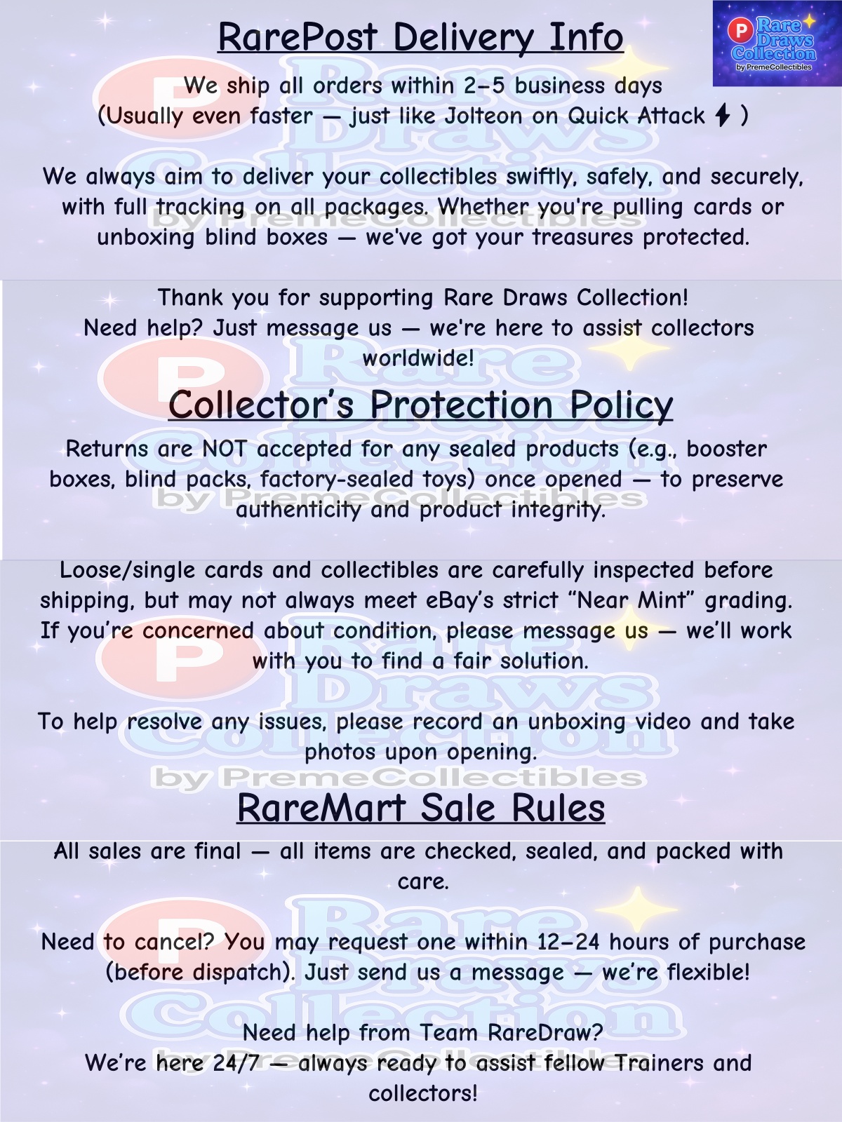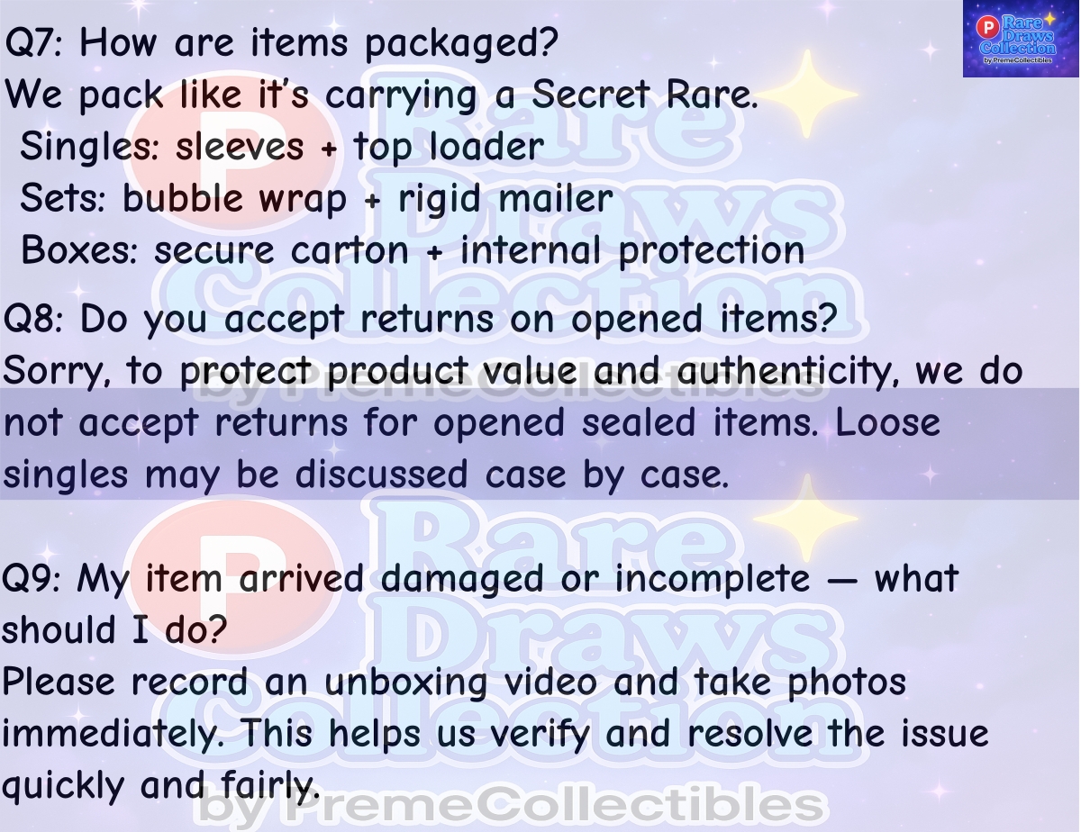 Whether you're a seasoned collector or just starting your vault, this section covers all the essentials — from shipping timelines and returns to product authenticity.