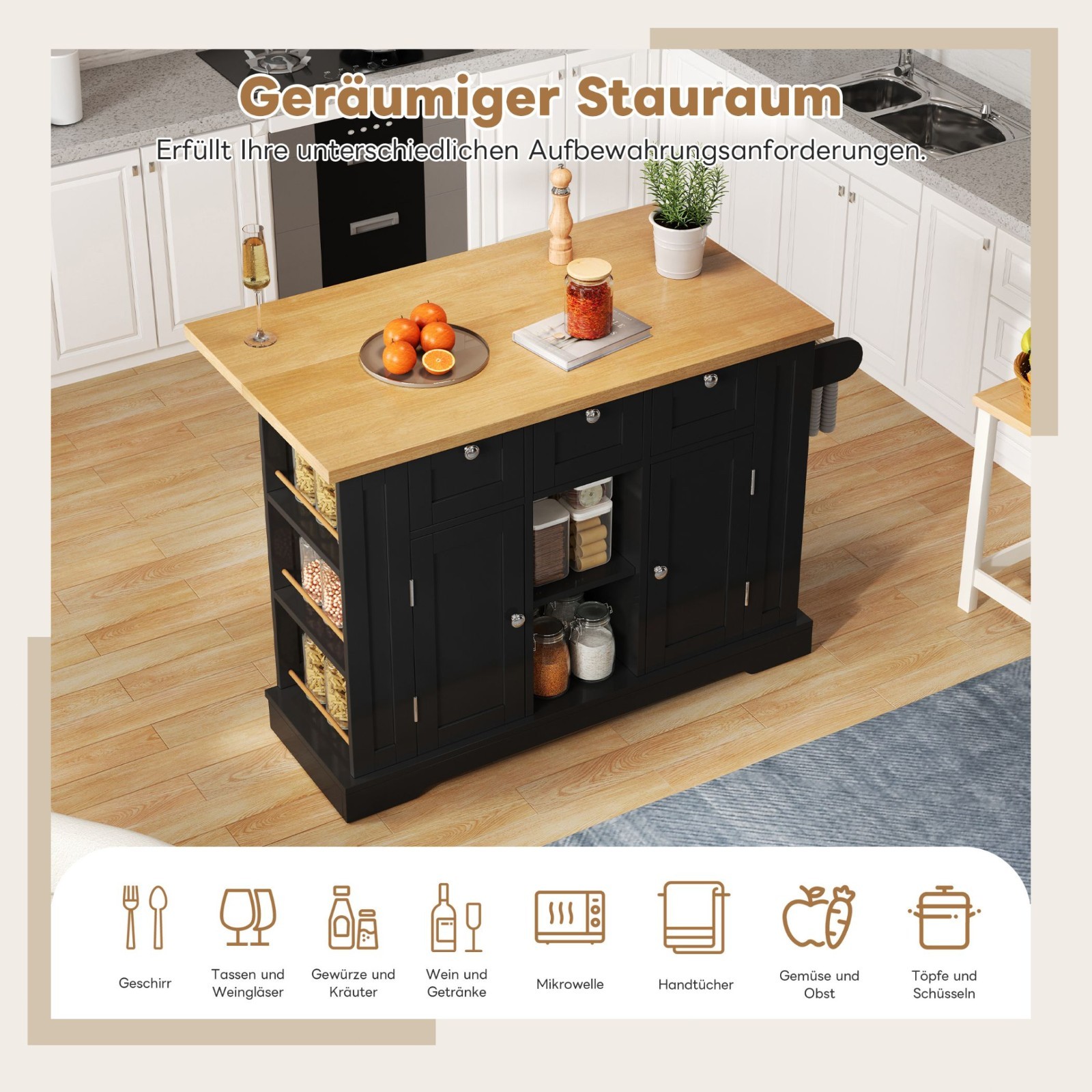 Erweitern Sie Ihre Küche mit dieser vielseitigen Insel: 70 cm klappbare Arbeitsplatte, integrierte EU-Steckdose und USB. Clevere doppelseitige Ablagen, drei geräumige Schubladen sowie eine Kombination aus Schränken und offenen Regalen sorgen für Ordnung. Dank leichtgängiger Rollen mit Feststellfunktion lässt sich die Insel flexibel bewegen und sicher fixieren. Ideal für die Essensvorbereitung oder kleine Treffen im Wohnzimmer.
