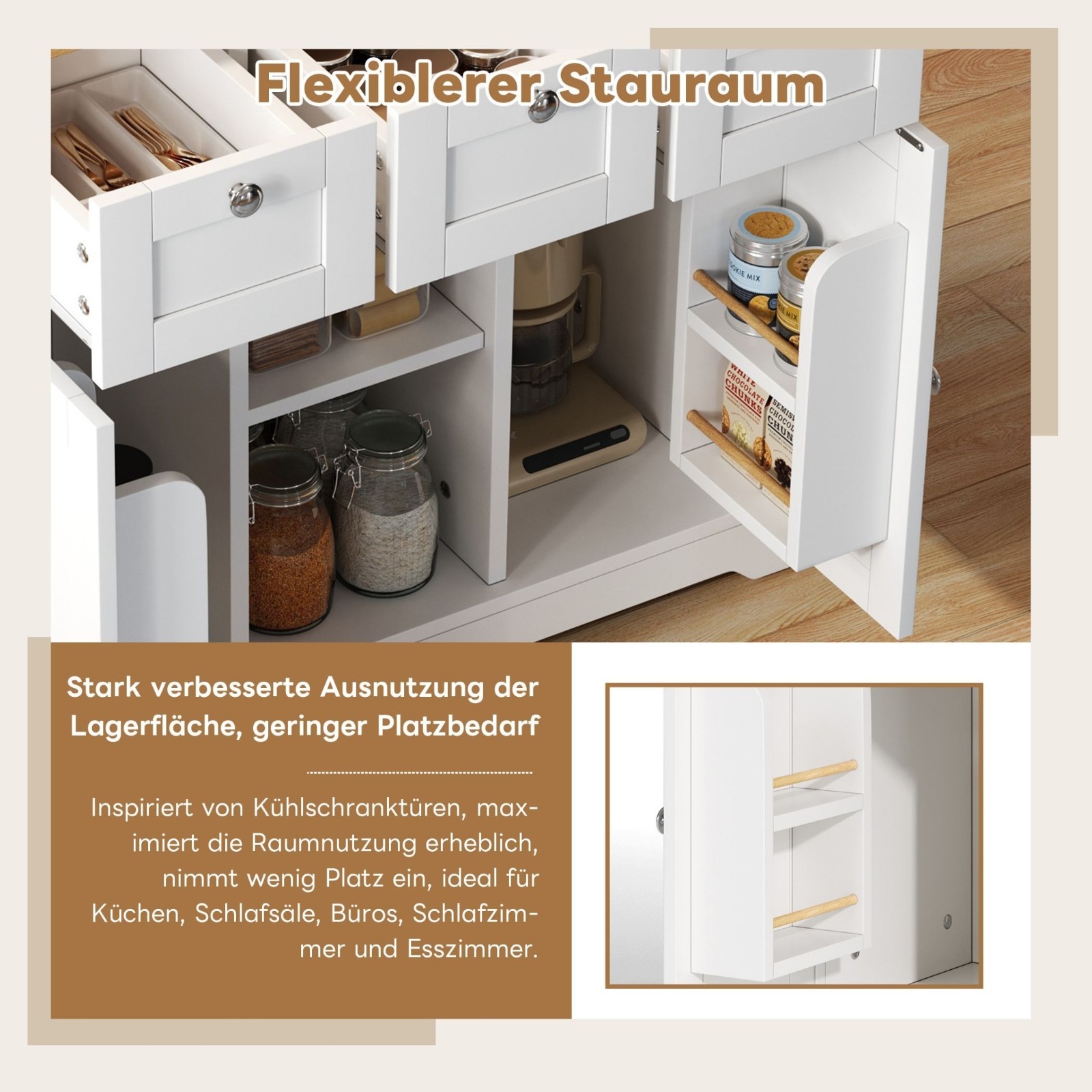 Drei Geräumige Schubladen für optimale Ordnung: Mit drei großen Schubladen bringen Sie Gewürze, Besteck und Küchenutensilien perfekt unter. Nie wieder Chaos auf der Arbeitsfläche – alles hat seinen festen Platz und Sie kochen schneller und entspannter.