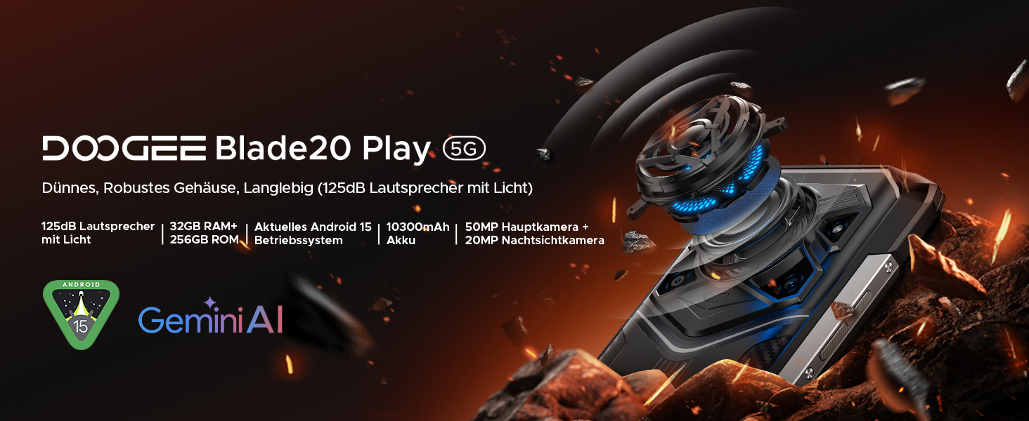 3,5W 125dB Lautsprecher & LED Lichteffekte & Gemini AI & 6,6" 90Hz Display: Dieses Outdoor Handy Blade 20 Play ist mit einem 36 mm großen 3,5 W Hochleistungslautsprecher mit einer maximalen Lautstärke von 125dB ausgestattet und eingebaute Gemini AI. Die dynamischen LED Beleuchtungseffekte synchronisieren sich mit Audio oder Benachrichtigungen und sorgen für ein lebendiges, individuell anpassbares visuelles Flair. Dieses outdoodr smartphone verfügt außerdem über ein helles 6,6 Zoll HD+ Display mit einer Auflösung von 90Hz.