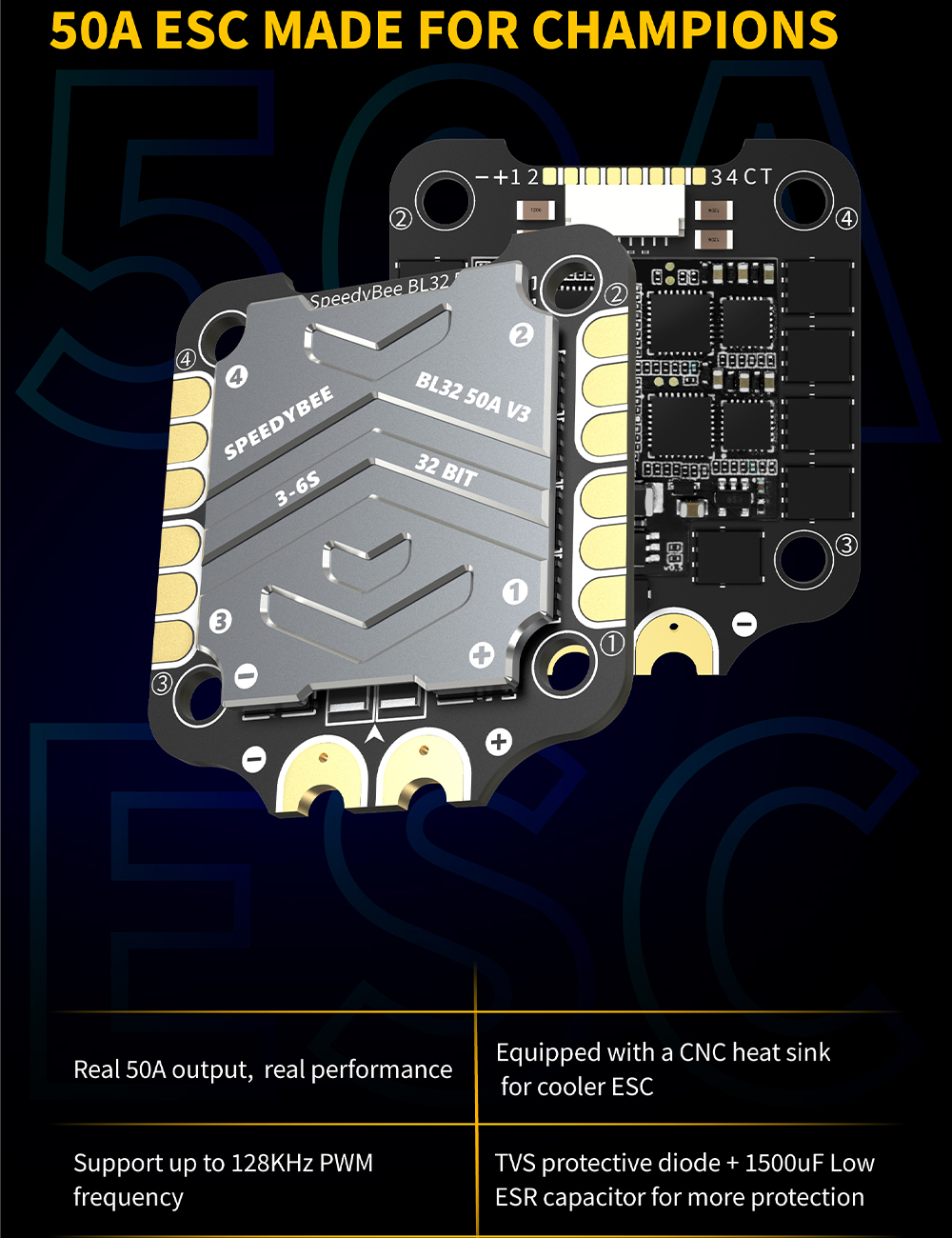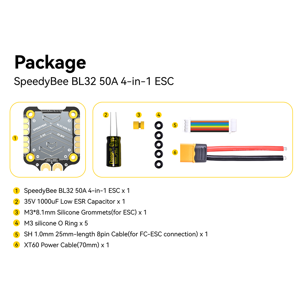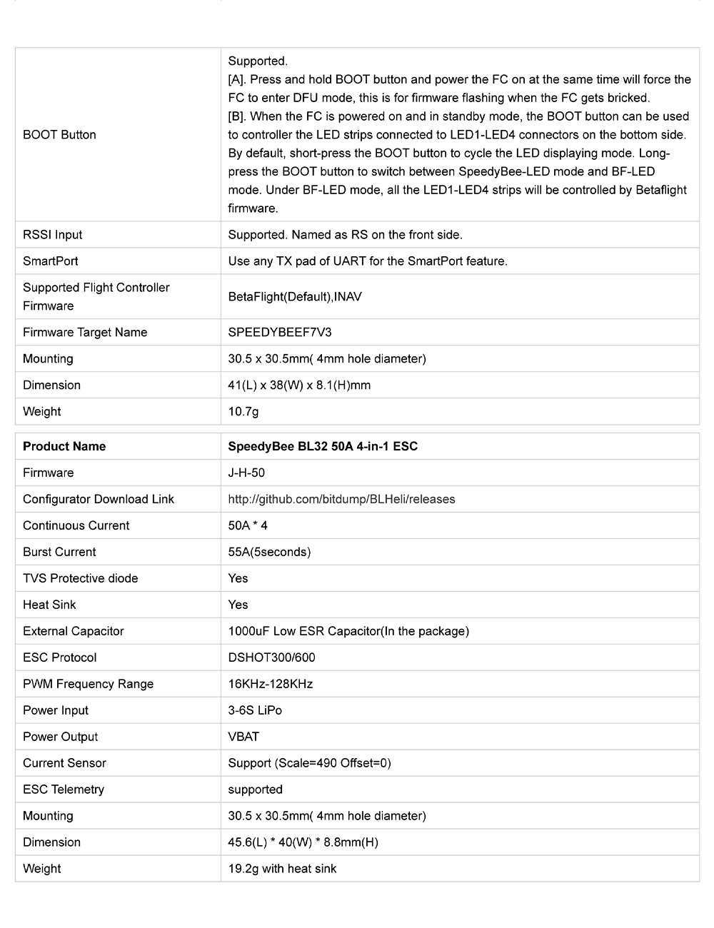 BL32 50A 4-in-1 ESC Specifications: Firmware: J-H-50 Continuous Current: 50A*4 Burst Current: 55A(5seconds) TVS Protective diode: Yes Heat Sink: Yes External Capacitor: 1000uF Low ESR Capacitor(In the package) ESC Protocol: DSHOT300/600 PWM Frequency Range: 16KHZ-128KHZ Power Input: 3-6S LiPo Power Output: VBAT Mounting: 30.5 x 30.5mm( 4mm hole diameter) Dimension: 45.6(L)* 40(W)*8.8mm(H) Weight: 19.2g with heat sink