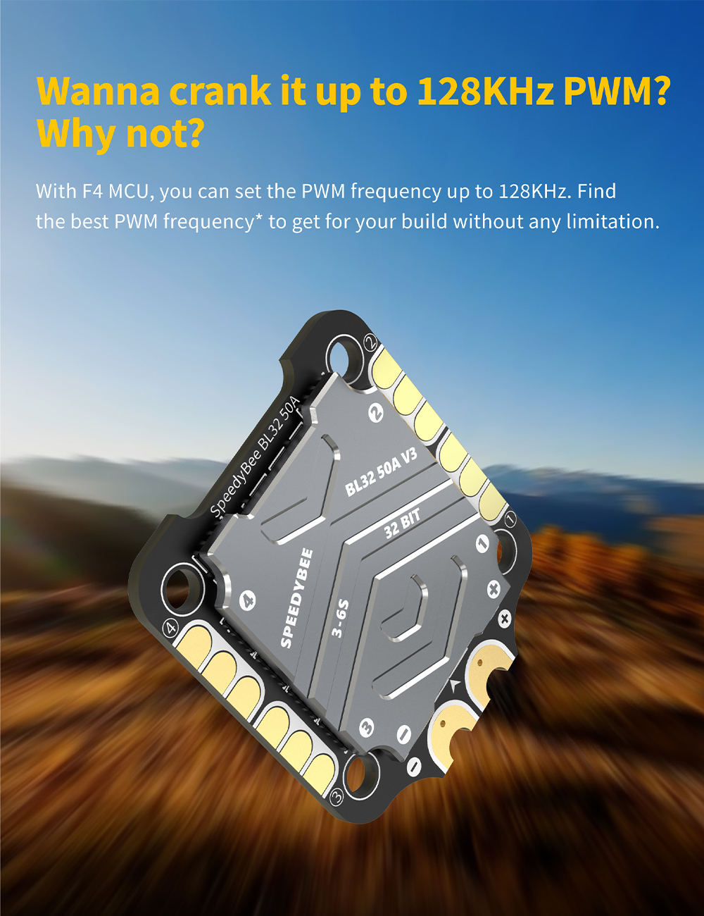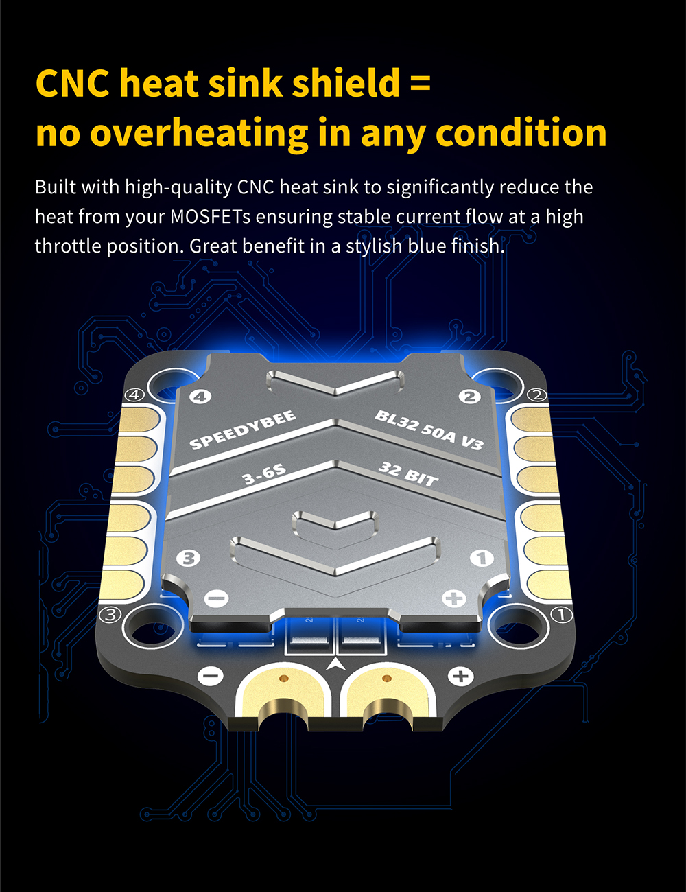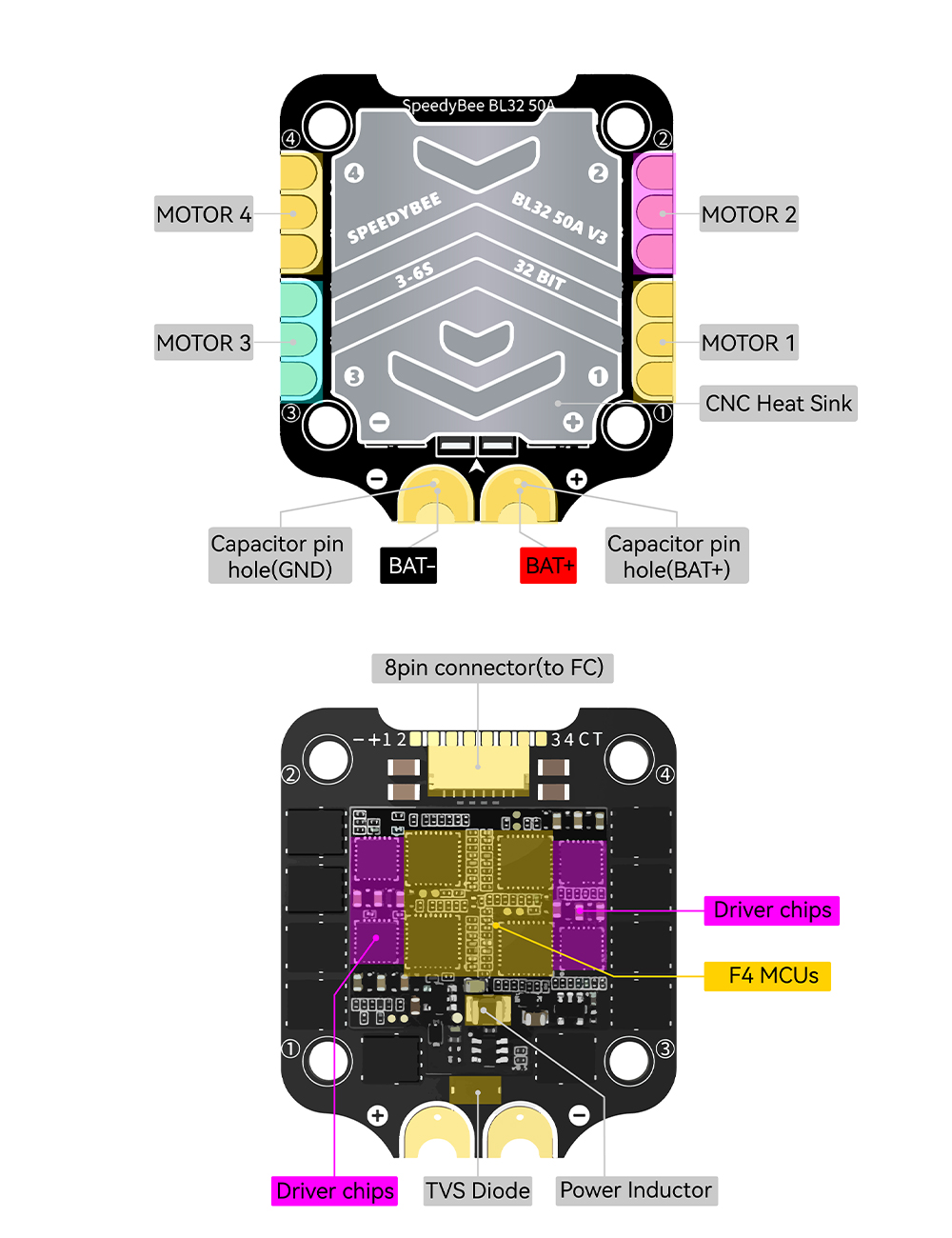 BL32 50A 4-in-1 ESC Specifications: Firmware: J-H-50 Continuous Current: 50A*4 Burst Current: 55A(5seconds) TVS Protective diode: Yes Heat Sink: Yes External Capacitor: 1000uF Low ESR Capacitor(In the package) ESC Protocol: DSHOT300/600 PWM Frequency Range: 16KHZ-128KHZ Power Input: 3-6S LiPo Power Output: VBAT Mounting: 30.5 x 30.5mm( 4mm hole diameter) Dimension: 45.6(L)* 40(W)*8.8mm(H) Weight: 19.2g with heat sink