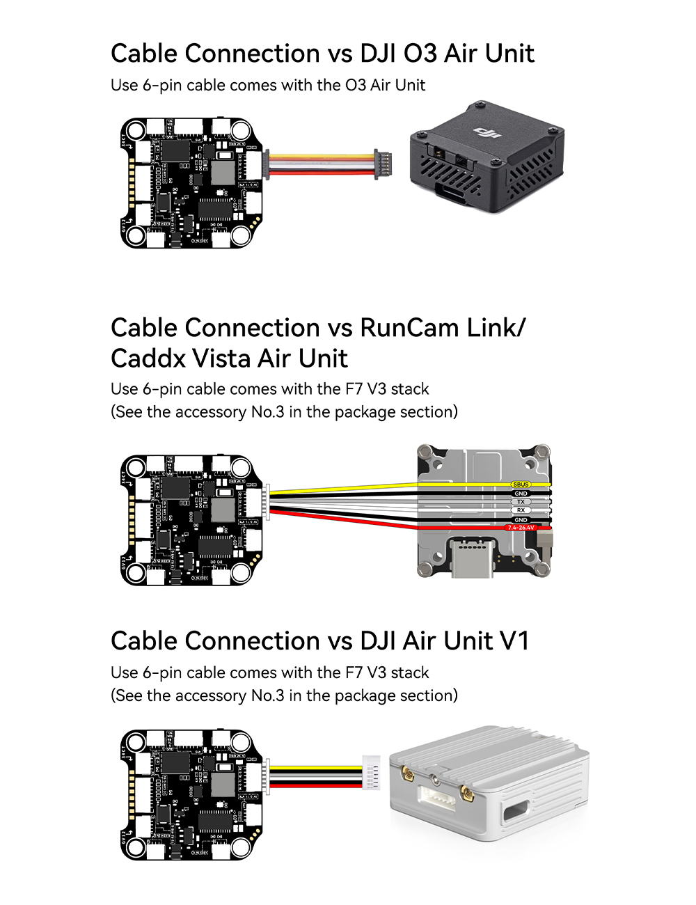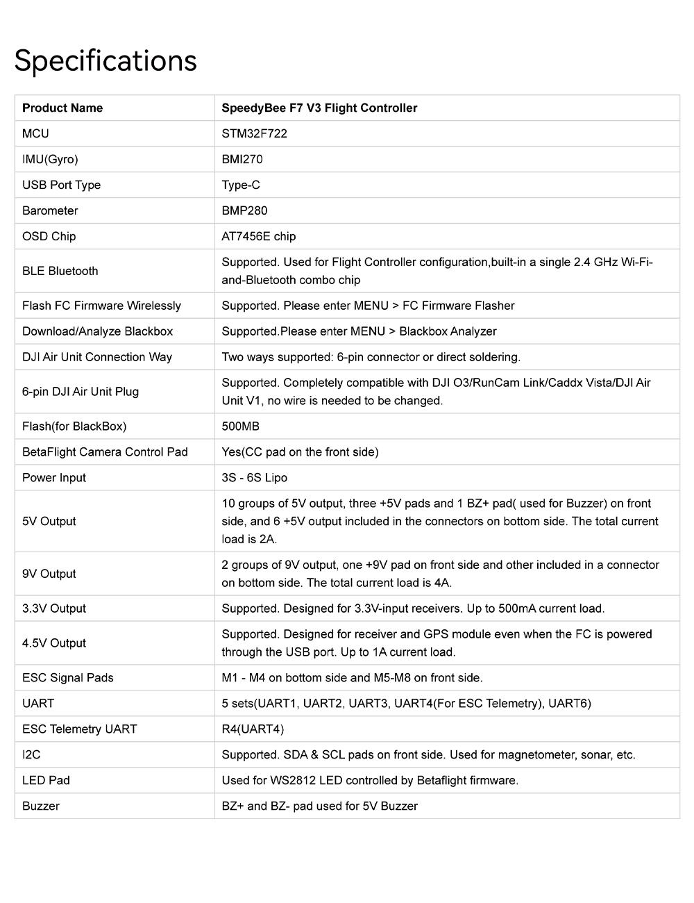 F7 V3 Flight Controller Specifications: MCU: STM32F722 IMU(Gyro): BMI270 USB Port Type: Type-C Barometer: BMP280 OSD Chip: AT7456E chip Flash(for BlackBox): 500MB Beta Flight Camera Control Pad: Yes(CC pad on the front side) Power Input: 3S -6S Lipo ESC Signal Pads: M1 -M4 on bottom side and M5-M8 on front side. Firmware: BetaFlight(Default),INAV Mounting: 30.5 x 30.5mm( 4mm hole diameter) Dimension: 41(L)x 38(W)x 8.1(H)mm Weight: 10.7g