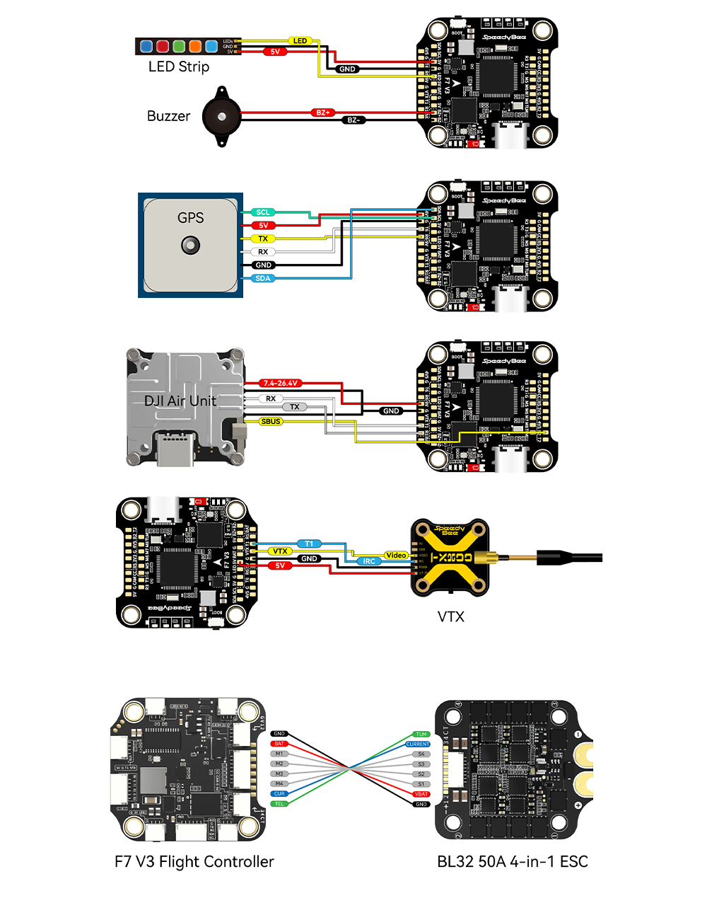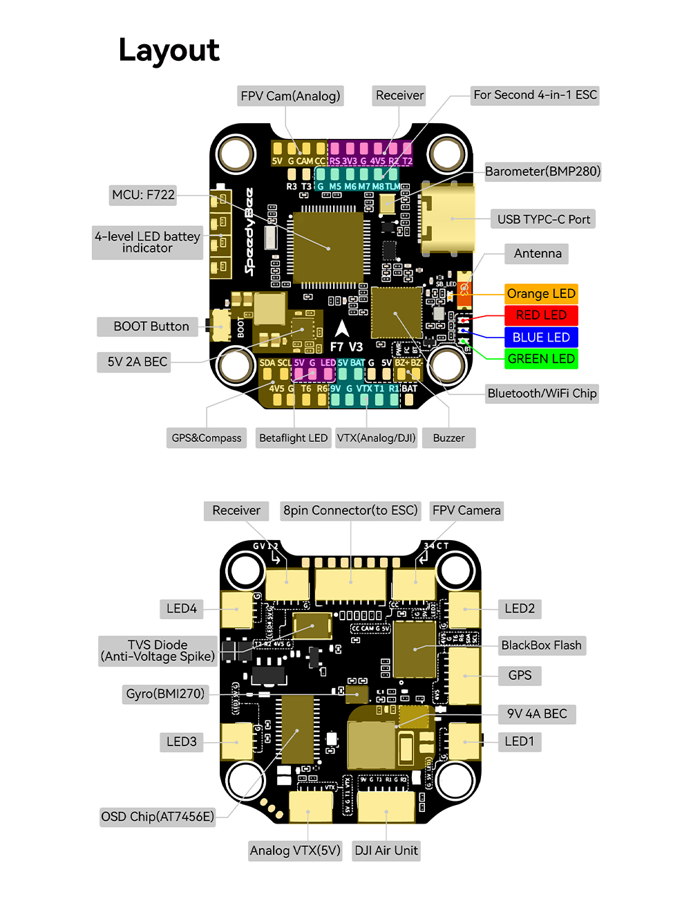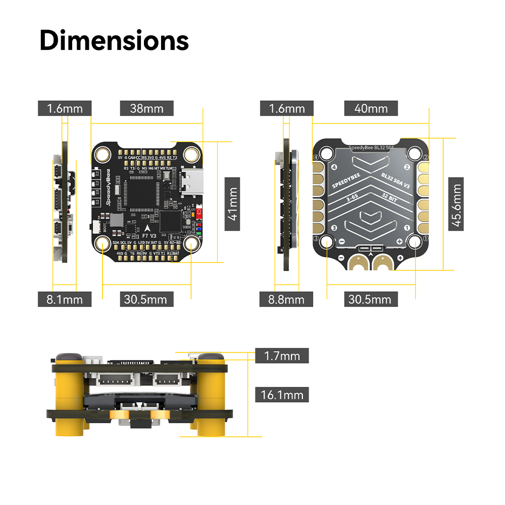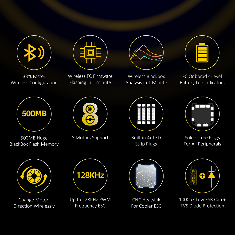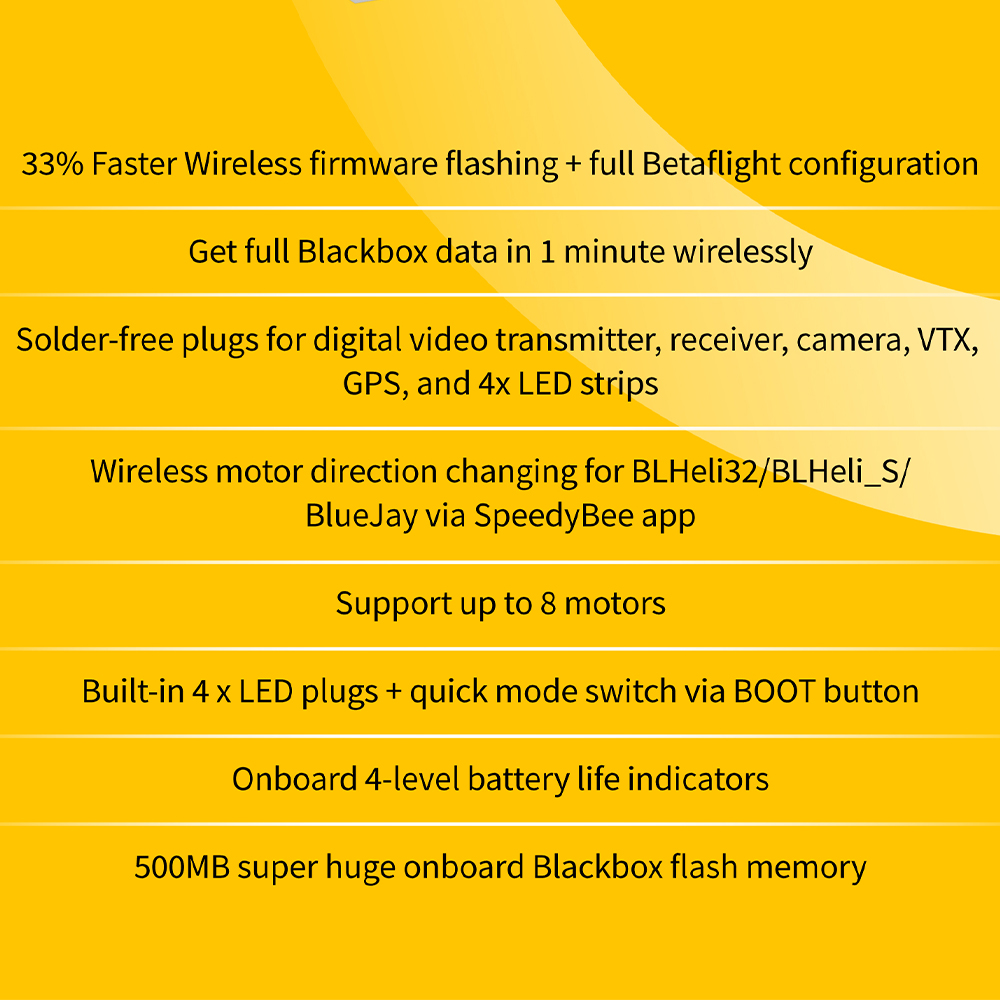 Features: 1. Up to 128KHz PWM Frequency ESC. 2. Built-in 4x LED Strip Plugs. 3. Support up to 8 motors. 4. 33% Faster Wireless firmware flashing+ full Betaflight configuration. 5. Get full Blackbox data in 1 minute wirelessly. 6. Wireless motor direction changing for BLHeli32/BLHeli_SBlueJay via SpeedyBee app. 7. Onboard 4-level battery life indicators. 8. 500MB super huge onboard Blackbox flash memory. 9. Solder-free plugs for digital video transmitter, receiver, camera, VTX.GPS, and 4x LED strips.