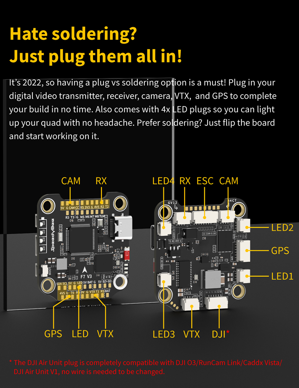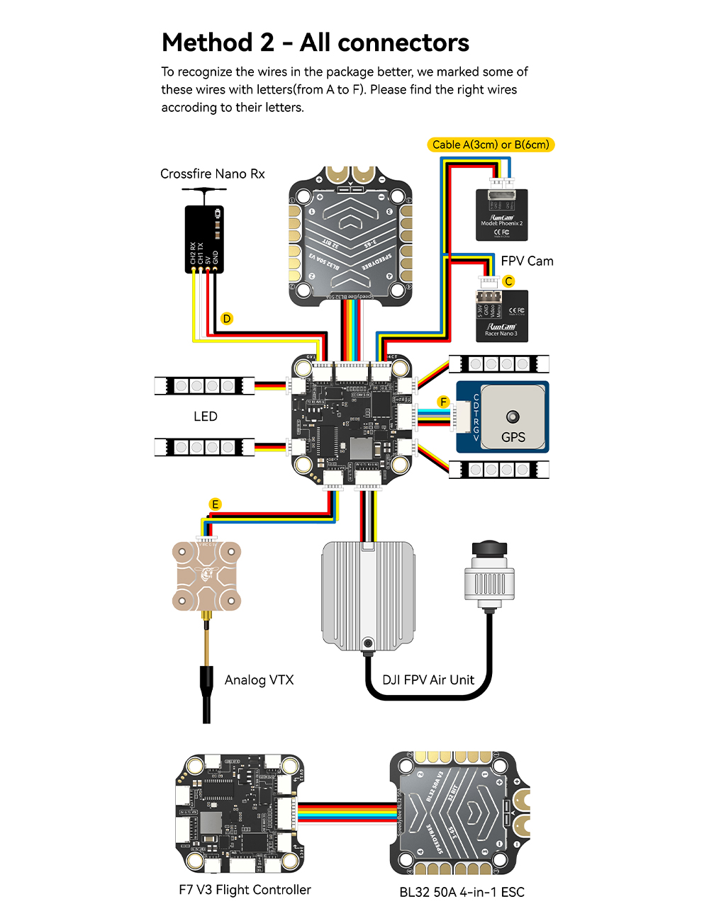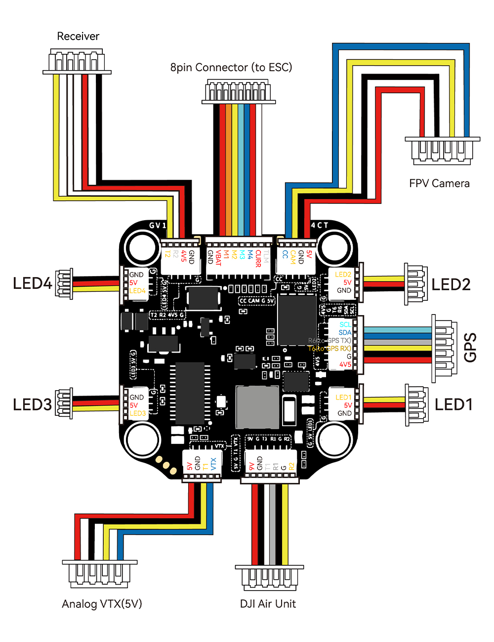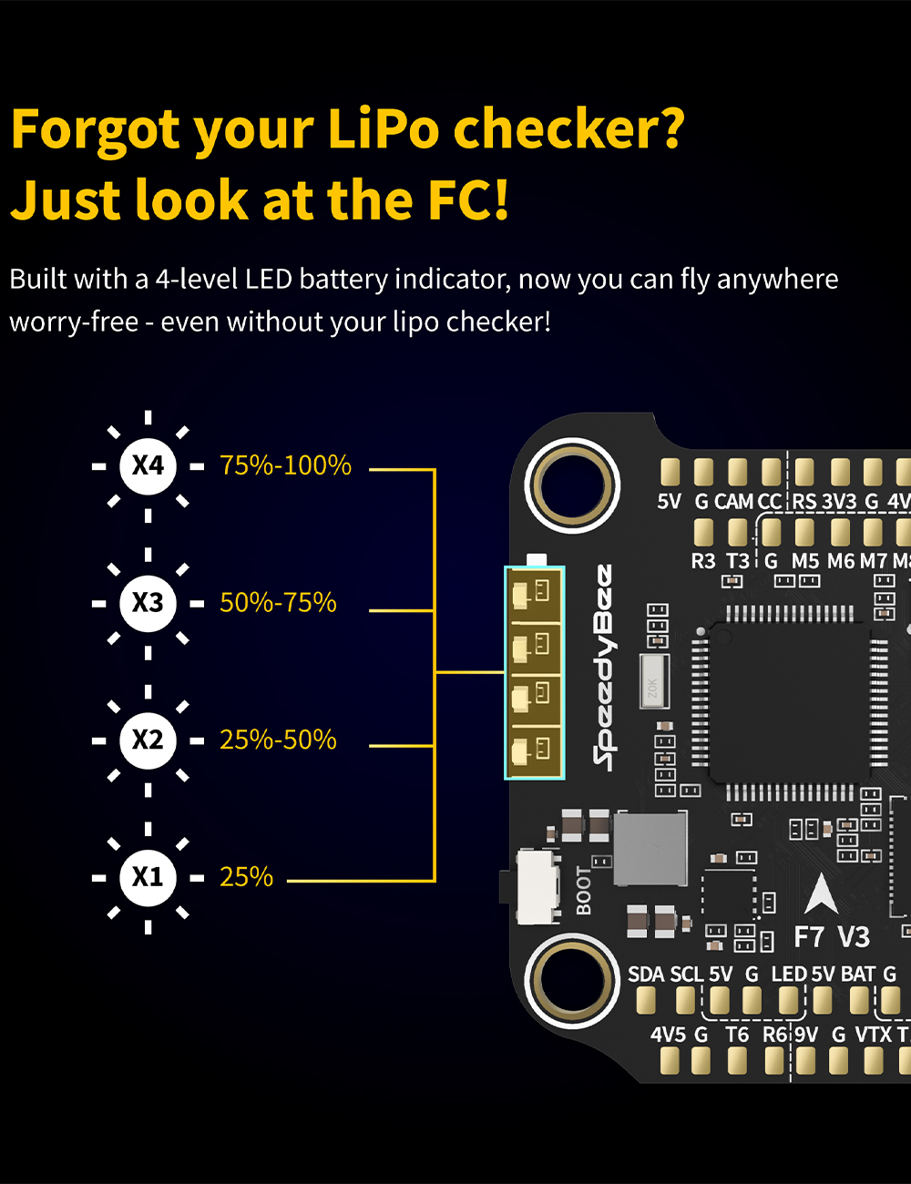 Features: 1. Up to 128KHz PWM Frequency ESC. 2. Built-in 4x LED Strip Plugs. 3. Support up to 8 motors. 4. 33% Faster Wireless firmware flashing+ full Betaflight configuration. 5. Get full Blackbox data in 1 minute wirelessly. 6. Wireless motor direction changing for BLHeli32/BLHeli_SBlueJay via SpeedyBee app. 7. Onboard 4-level battery life indicators. 8. 500MB super huge onboard Blackbox flash memory. 9. Solder-free plugs for digital video transmitter, receiver, camera, VTX.GPS, and 4x LED strips.
