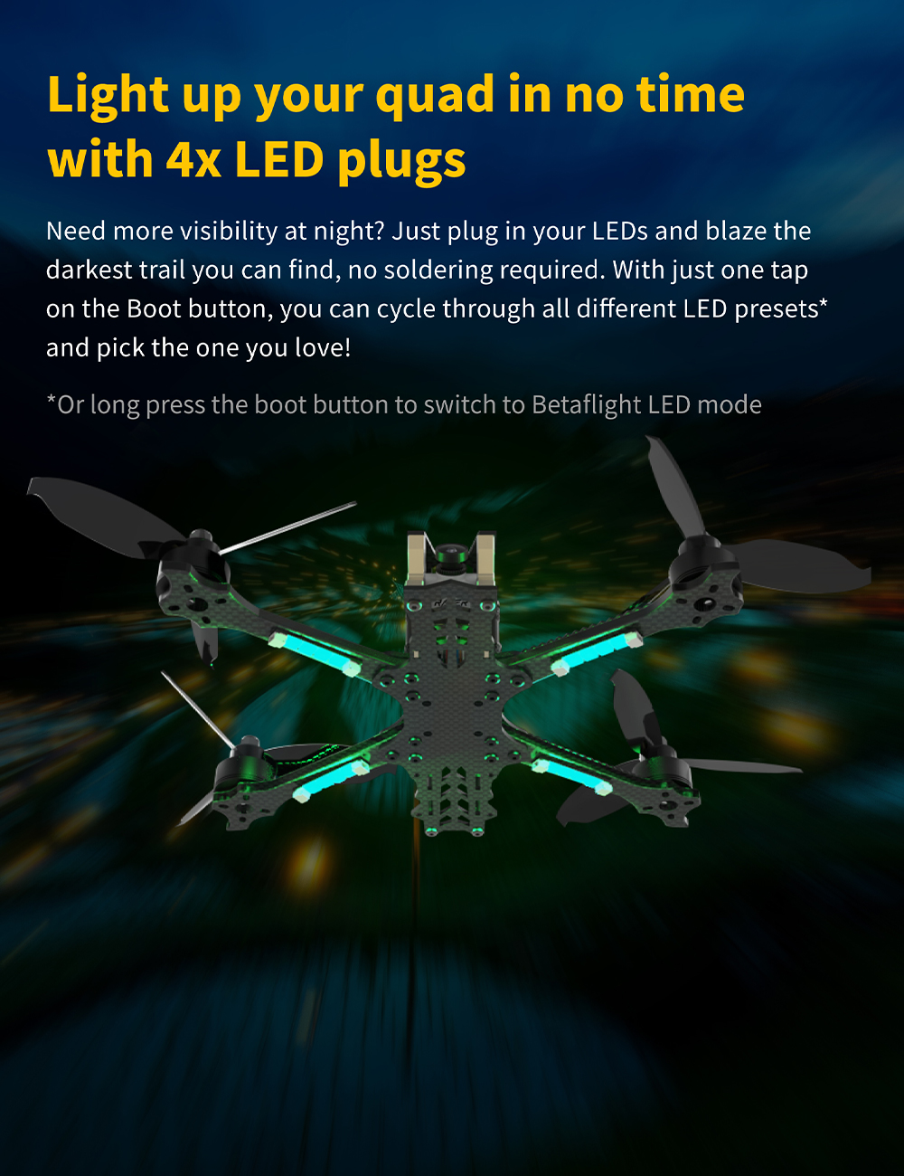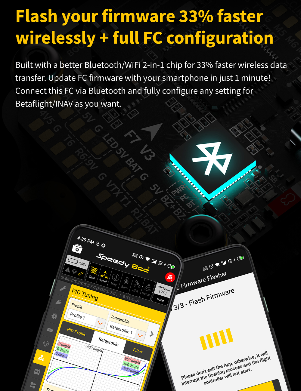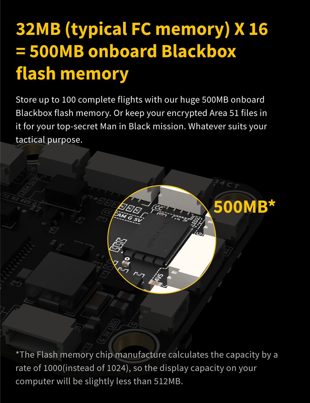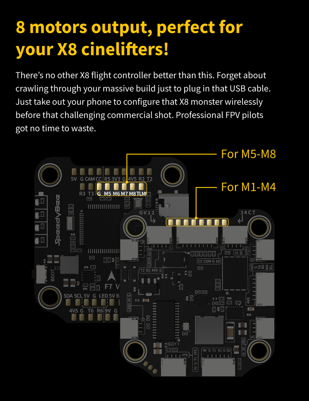 Features: 1. Up to 128KHz PWM Frequency ESC. 2. Built-in 4x LED Strip Plugs. 3. Support up to 8 motors. 4. 33% Faster Wireless firmware flashing+ full Betaflight configuration. 5. Get full Blackbox data in 1 minute wirelessly. 6. Wireless motor direction changing for BLHeli32/BLHeli_SBlueJay via SpeedyBee app. 7. Onboard 4-level battery life indicators. 8. 500MB super huge onboard Blackbox flash memory. 9. Solder-free plugs for digital video transmitter, receiver, camera, VTX.GPS, and 4x LED strips.