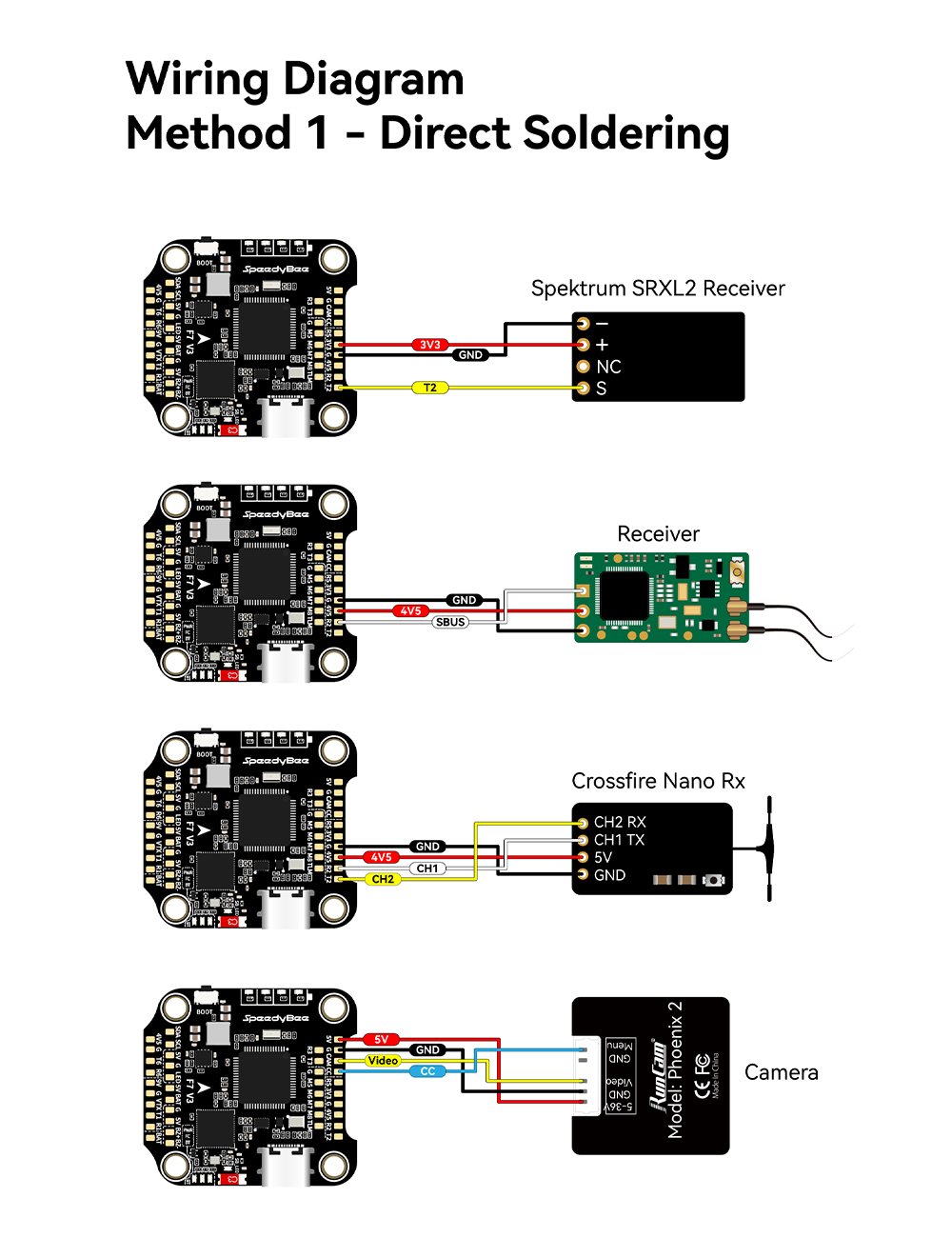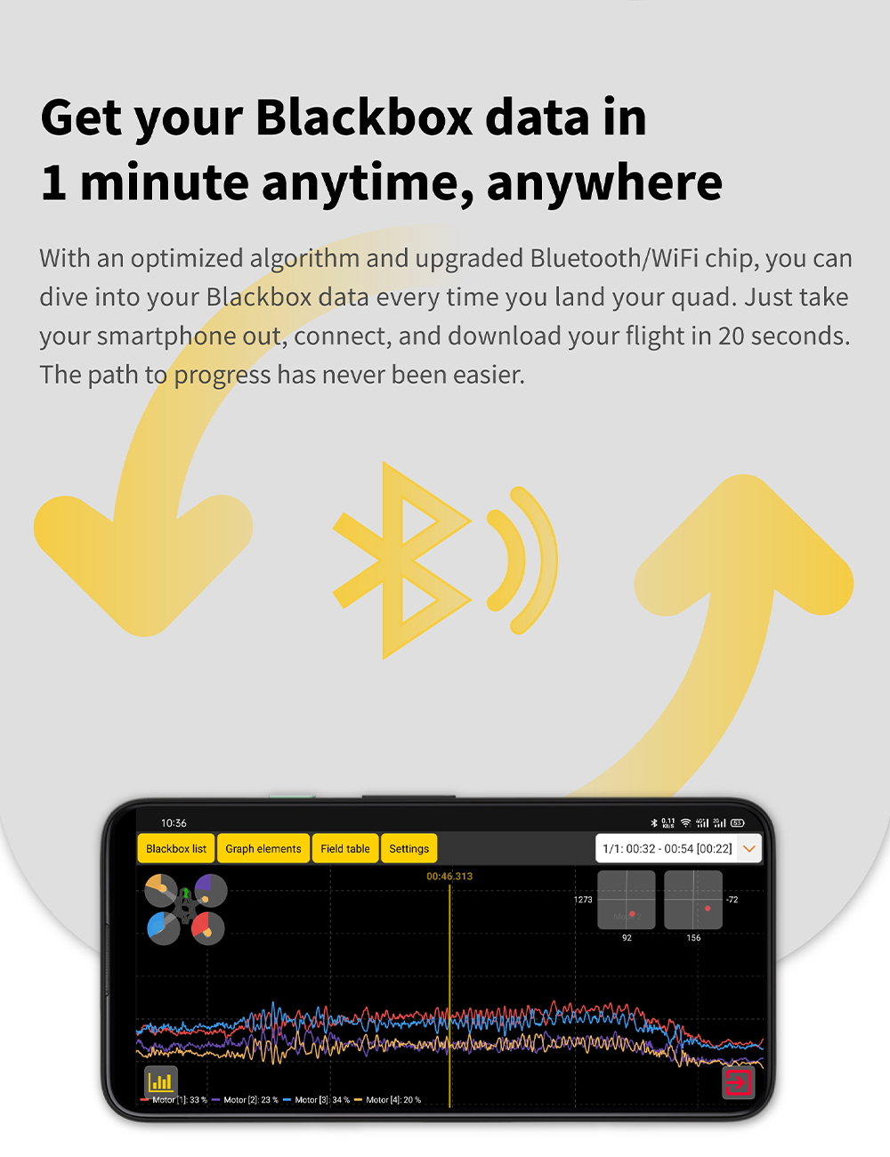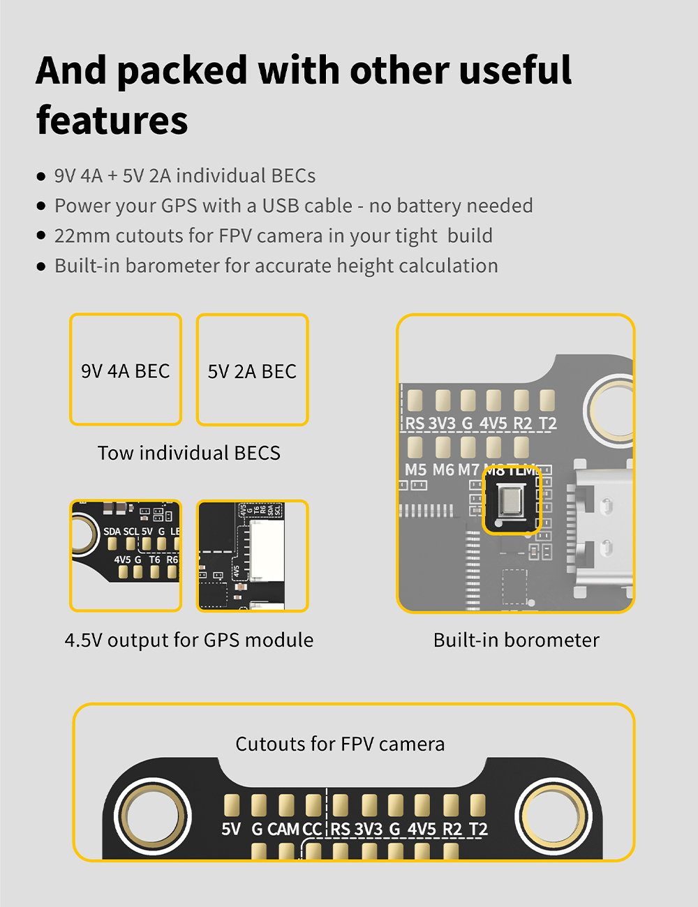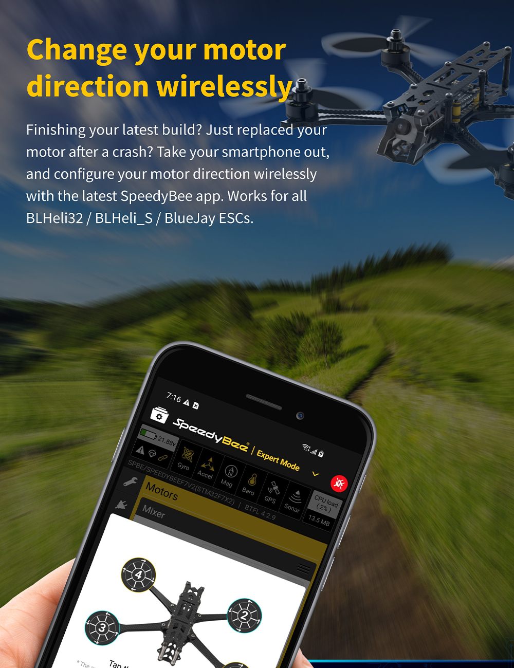 Features: 1. Up to 128KHz PWM Frequency ESC. 2. Built-in 4x LED Strip Plugs. 3. Support up to 8 motors. 4. 33% Faster Wireless firmware flashing+ full Betaflight configuration. 5. Get full Blackbox data in 1 minute wirelessly. 6. Wireless motor direction changing for BLHeli32/BLHeli_SBlueJay via SpeedyBee app. 7. Onboard 4-level battery life indicators. 8. 500MB super huge onboard Blackbox flash memory. 9. Solder-free plugs for digital video transmitter, receiver, camera, VTX.GPS, and 4x LED strips.