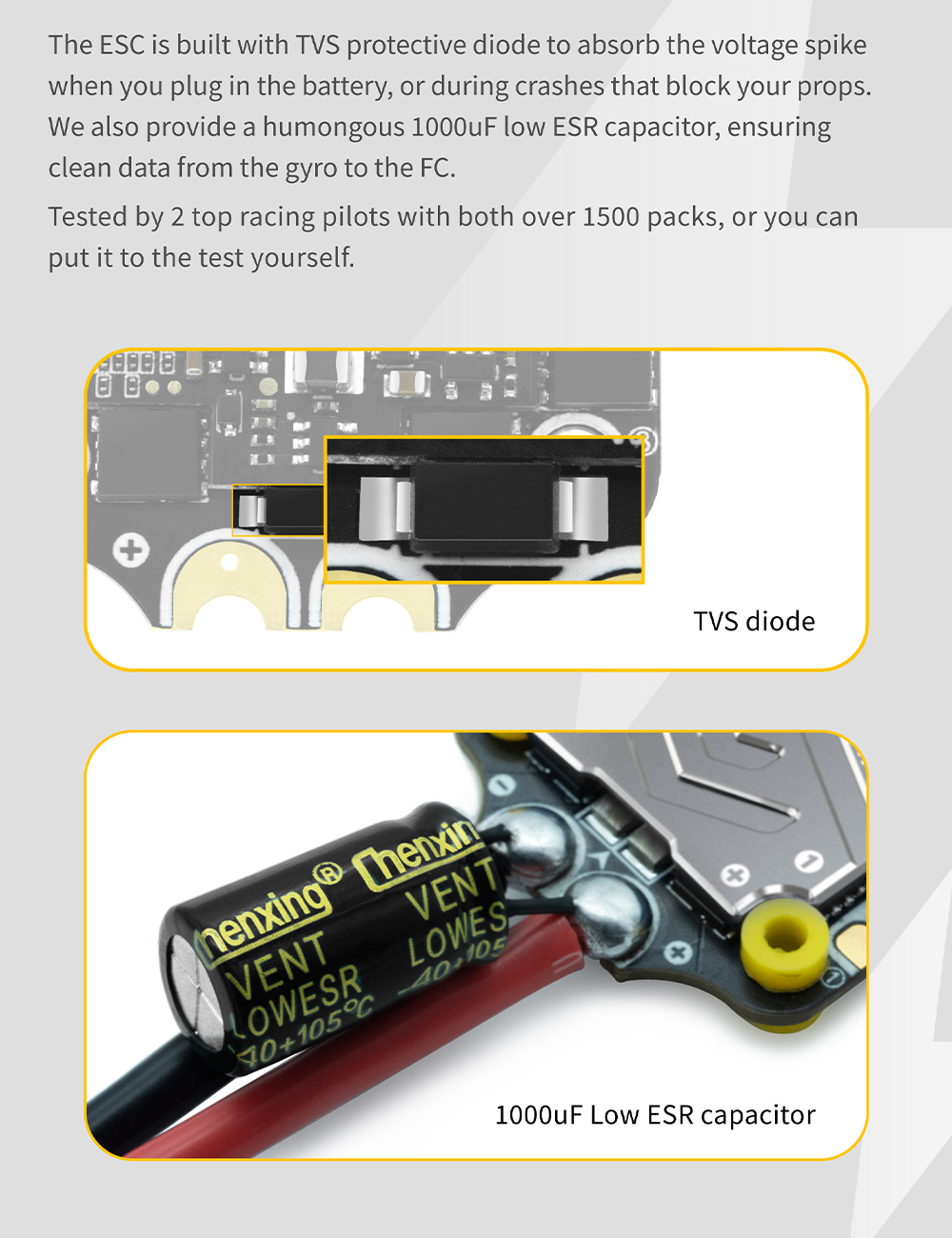 Description: The ESC has been upgraded from the 45A of V22 to the actual 50A, and heat sinks and TVS surge diodes have been added The F7 V3 flight control supports 8 motors, wirelessly flashing flight control firmware and black box analysis, with a speed increase of 33%. It also supports welding free full socket connection to all peripherals.