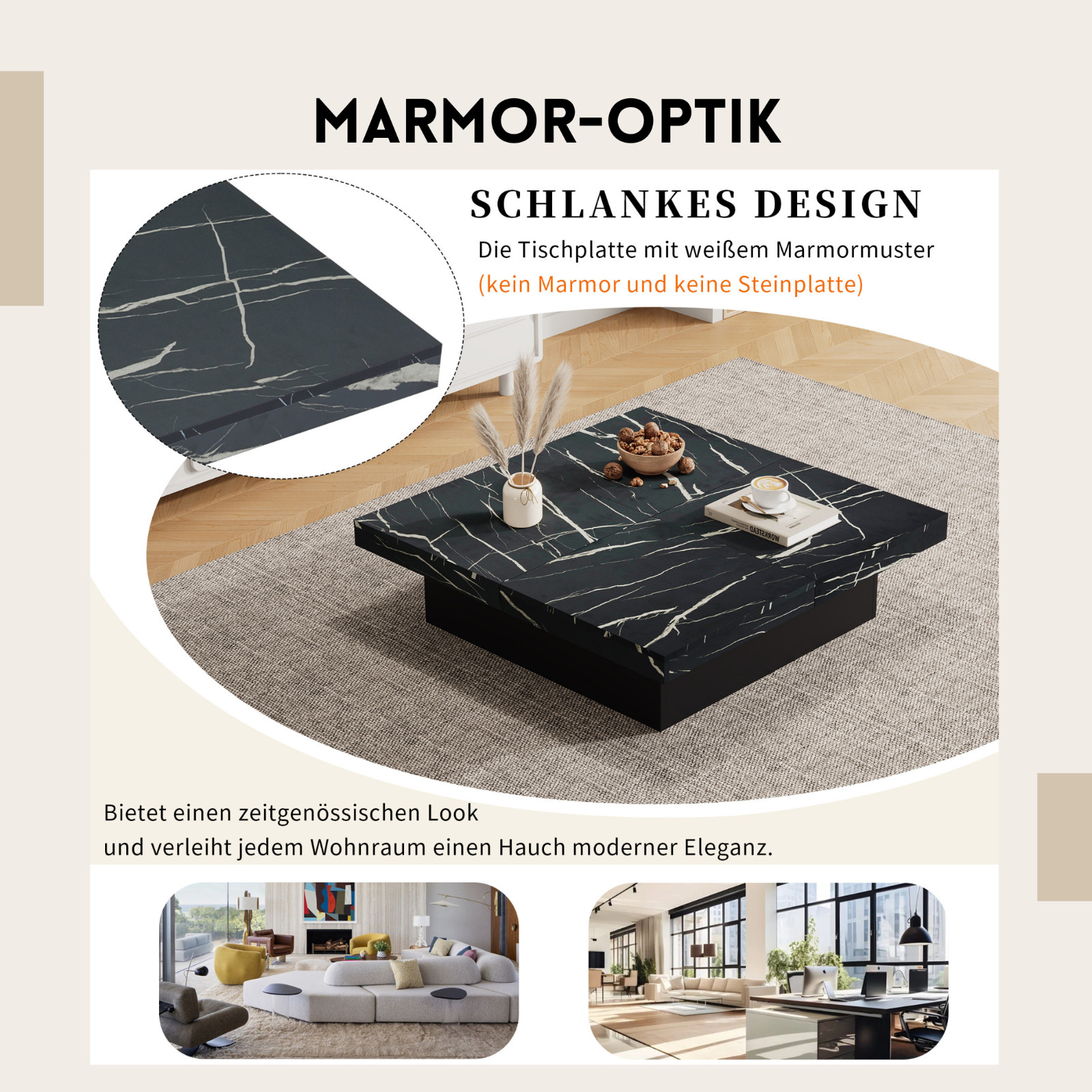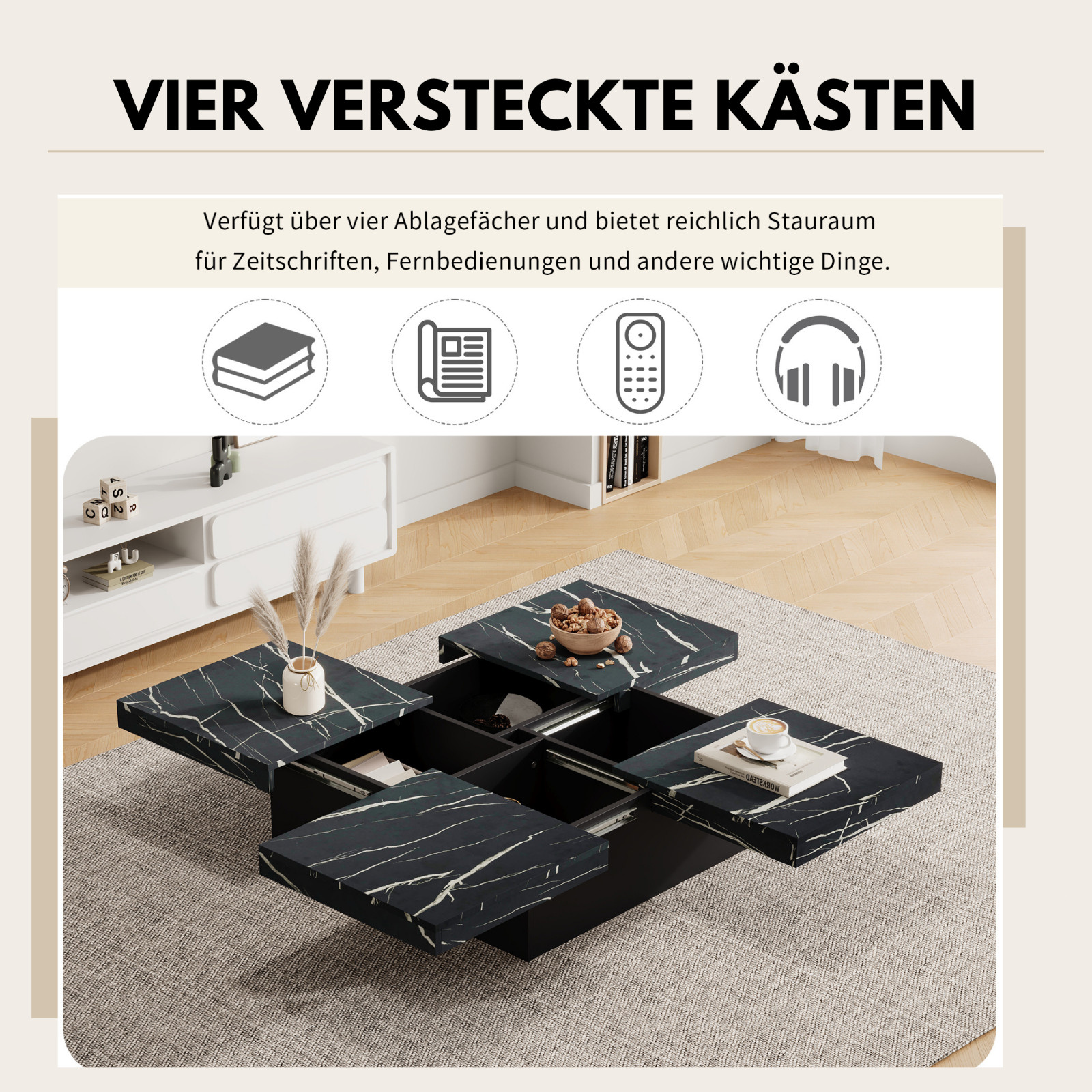 Verwandeln Sie Ihr Wohnzimmer in eine stilvolle Wohlfühloase: Dieser multifunktionale Couchtisch vereint luxuriöse Marmor‑Ästhetik mit cleverem Stauraumkonzept. Die in vier Segmente unterteilte Tischplatte gleitet auf hochwertigen Schienen heraus und wird zum praktischen Servier‑ oder Arbeitsbereich, während darunter geräumige, unsichtbare Aufbewahrungskästen Ordnung schaffen. Das bodentiefe Sockeldesign sorgt für außergewöhnliche Stabilität und schützt gleichzeitig Ihren Fußboden. Robuste, emissionsarme Materialien und eine pflegeleichte Beschichtung garantieren langanhaltende Freude. Ob gemütlicher Serienabend, spontane Spielrunde oder stilvolles Dekor – dieser Couchtisch passt sich Ihrem Alltag an und setzt dabei ein elegantes Statement.