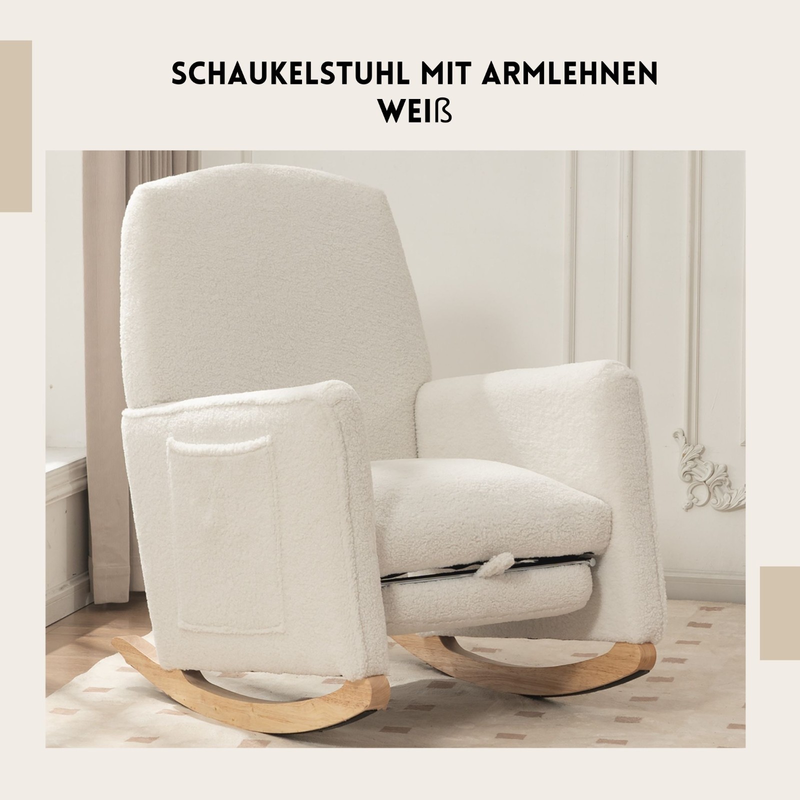 Genießen Sie entspannte Momente mit dem SeedWave Schaukelstuhl, der Komfort und Haltbarkeit vereint. Mit kuscheligem Teddy-Velours, integrierter Fußstütze und sicherem Kipp-Design bietet er ultimativen Komfort. Die robusten Gummibaumholzbeine garantieren Langlebigkeit, während die Seitentasche Platz für wichtige Dinge bietet. Ideal für jedes Wohnzimmer, verbindet dieser Stuhl Eleganz und Funktionalität.