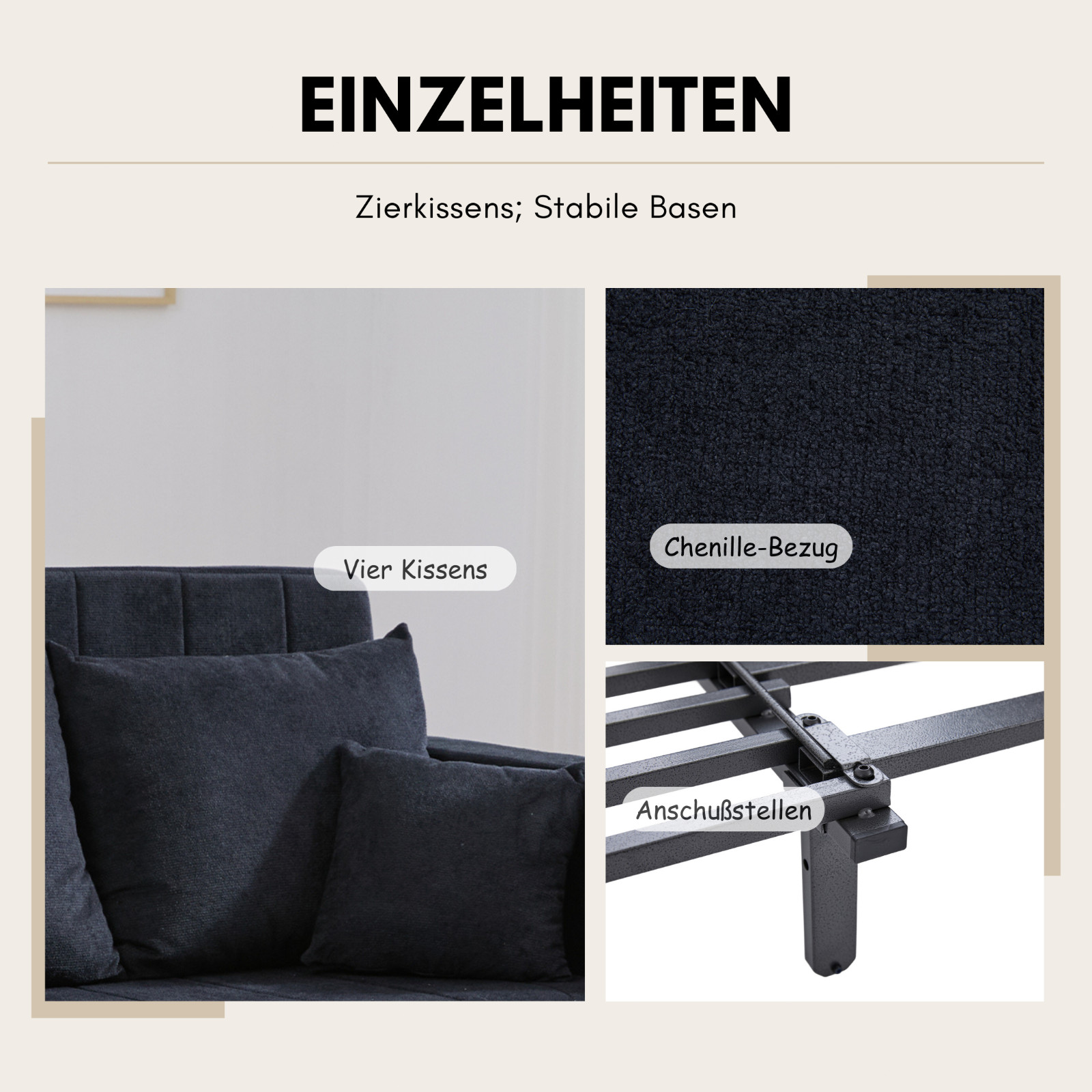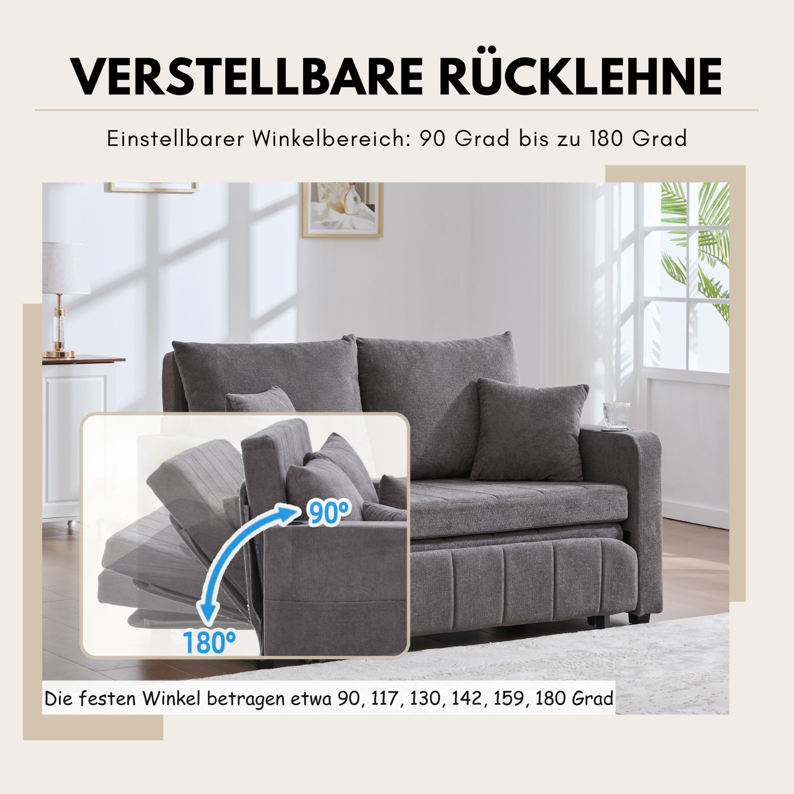 Dieses moderne 2-Sitzer Sofa vereint Komfort, Funktionalität und stilvolles Design in einem Möbelstück. Der hochwertige Chenille-Bezug sorgt für ein angenehm weiches Sitzgefühl, während die Polsterung mit hochelastischem Schwamm für langanhaltende Bequemlichkeit steht. Die verstellbare Rückenlehne ermöglicht es Ihnen, zwischen aufrechter Sitzposition und einer flachen Liegefläche zu variieren. Dank der praktischen Ausziehfunktion wird das Sofa im Handumdrehen zu einer Schlafgelegenheit. Besonders praktisch sind die integrierten Extras: Zwei Aufbewahrungstaschen an der Armlehne bieten Platz für kleine Dinge, während USB-Anschlüsse für bequemes Aufladen Ihrer Geräte sorgen. Becherhalter auf beiden Seiten runden den Komfort ab. Mit zwei großen Kissen und zwei kleineren Zierkissen – alle mit abnehmbaren, waschbaren Bezügen – ist dieses Sofa nicht nur gemütlich, sondern auch pflegeleicht. Eine ideale Wahl für alle, die modernes Wohnen mit praktischen Funktionen verbinden möchten.