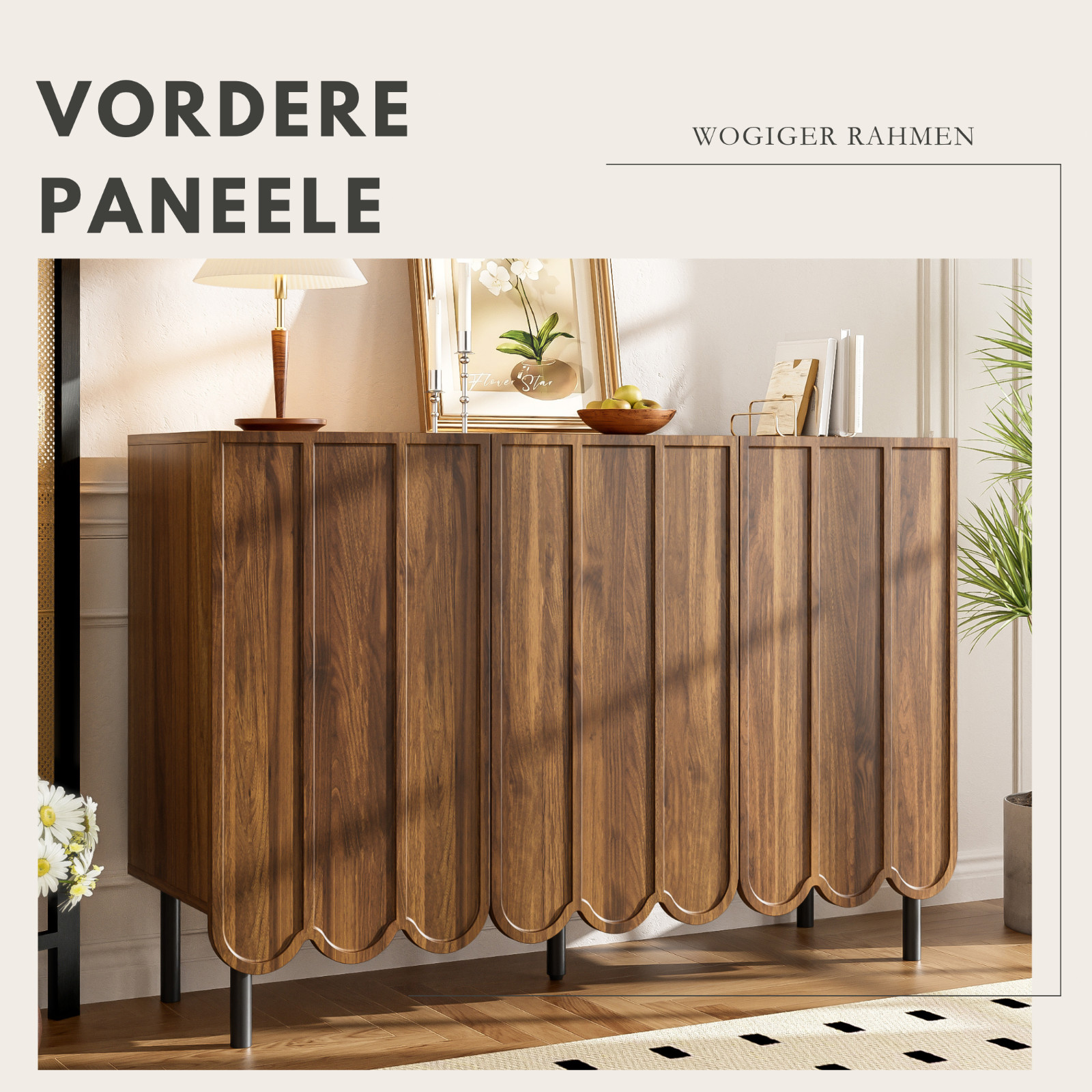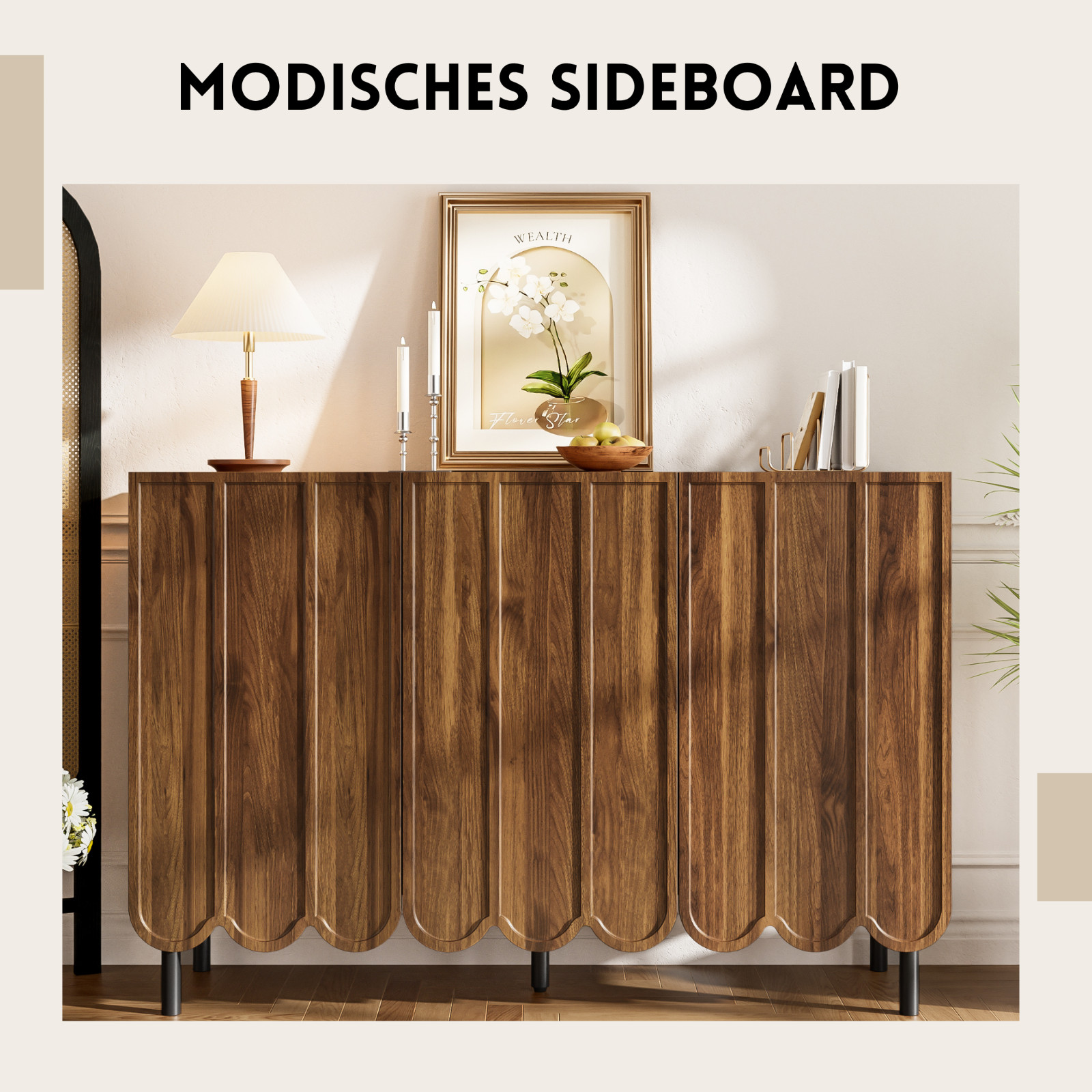 Elegantes Design mit wellenförmigem Unterrahmen: Das Sideboard besticht durch seinen markanten unteren Rahmen mit Wogig-Design, das dem Möbelstück eine stilvolle und moderne Optik verleiht. Die sanfte Wellenstruktur sorgt für eine dynamische Wirkung und macht das Sideboard zum Blickfang in jedem Wohnraum.