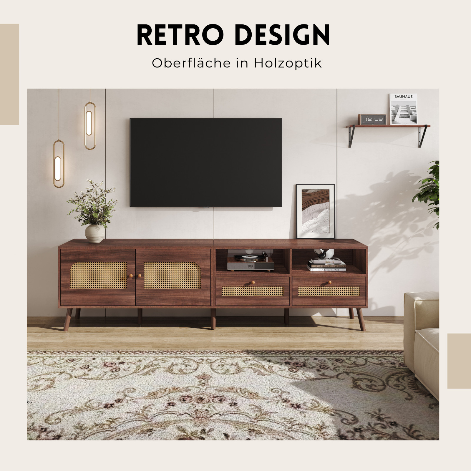 Dieses TV-Lowboard vereint natürliche Materialien mit durchdachter Funktionalität – perfekt für Ihr stilvolles Wohnzimmer. Die Fronten aus atmungsaktivem Rattan bringen Wärme und Leichtigkeit in Ihre Einrichtung, während zwei offene Fächer mit integrierter Kabeldurchführung ideal für Ihre Elektronikgeräte konzipiert sind. Hinter zwei Scharniertüren und in zwei Schubladen finden Sie zusätzlichen Stauraum für alles, was Sie gerne ordentlich verstauen möchten. Die acht stabilen Füße sorgen für einen sicheren Stand und erleichtern zugleich die Reinigung des Bodens. Ob als Medienzentrum oder stilvolles Sideboard – dieses Möbelstück bietet die perfekte Mischung aus Form und Funktion.