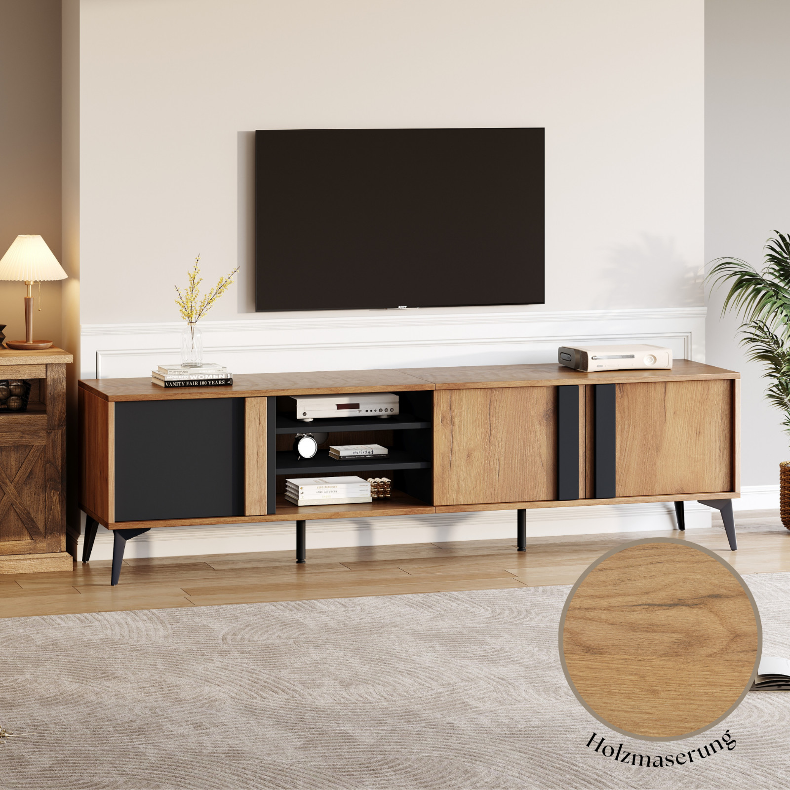 Kombination aus Braun und Schwarz mit Holzmaserung: Der Schrank bietet eine elegante Farbpalette und natürliche Holzmaserung, die perfekt in moderne Wohnzimmer passen.