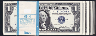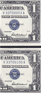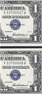 These crisp, new, gem-quality, uncirculated silver certificates were purchased as a sequentially serial numbered group of 100 from an original genuine BEP pack. They are being sold in pairs of two with sequential serial numbers. The serial # range is V33700003A-V33700100A. The two notes you will receive will fall within this range of serial numbers.