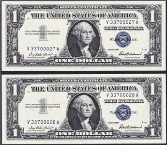 USPC TWO (X2) Fr. 1619 $1 1957 SILVER CERTIFICATES, GEM UNC with Consecutive Serial#’s. These truly are uncirculated notes that are GEM-like new notes. These are crisp, beautiful and PRETTY MUCH flawless notes.