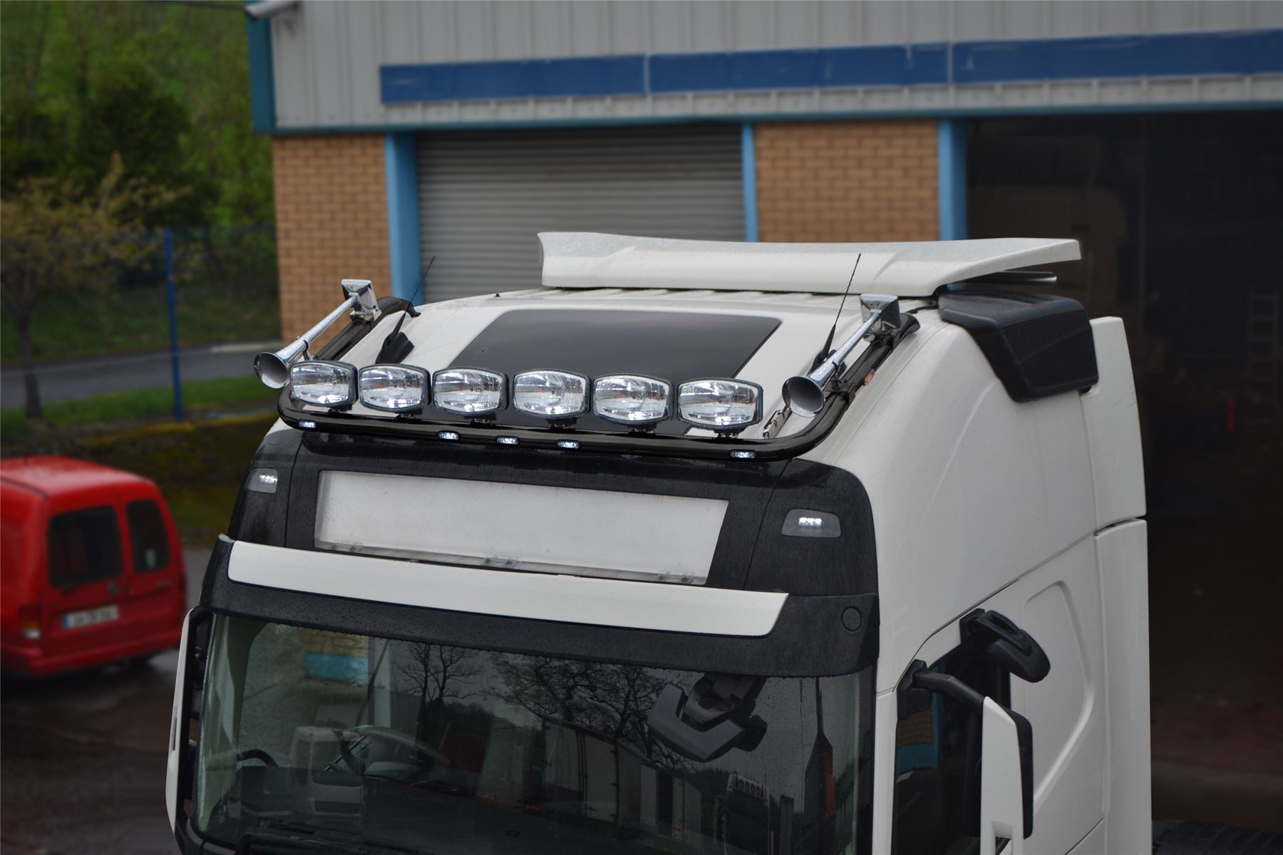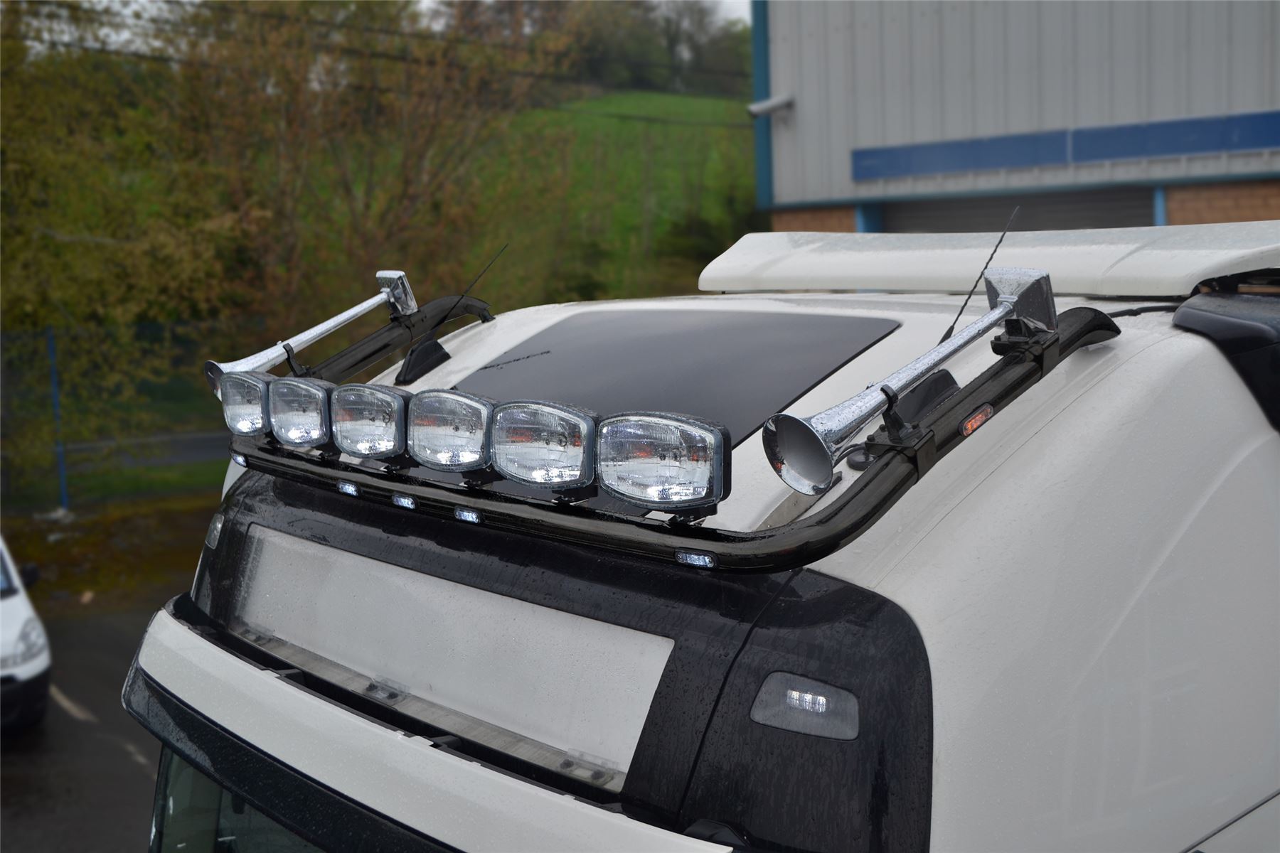 Haute qualité Pièces LED en acier inoxydable en revêtement en poudre noire barre de toit claire avec LED à chasse d'eau blanc x5 , ambre des LED à chasse d'eau X2 et Jumbo LED Spots x6 pour Volvo FH5 Globetrotter XL (2021 - modèles présents). Veuillez consulter d'autres articles si votre camion est la version standard Globetrotter .