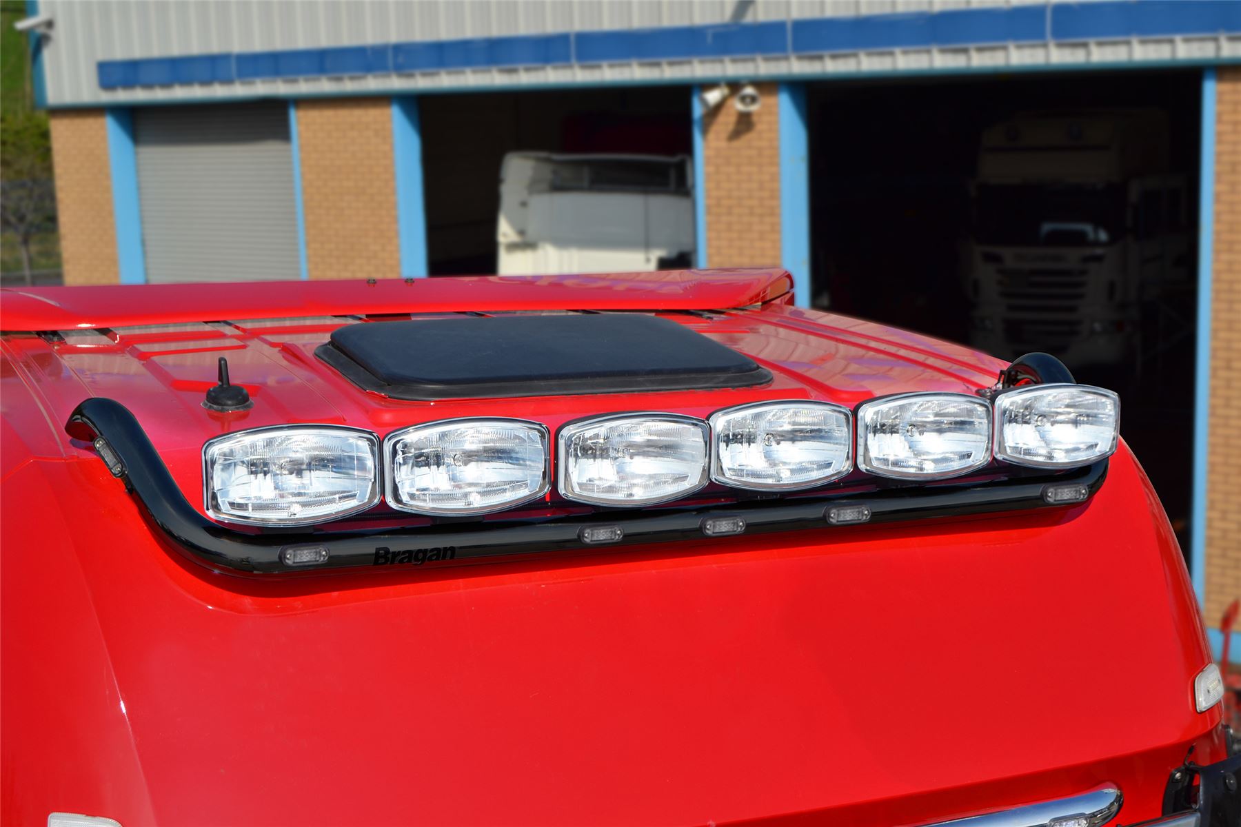 High quality Black Powder Coated Stainless Steel Spot Light Roof Bar + Jumbo Spots x6 + White Flush LEDs x5 and Amber Flush LEDs x2 for Mercedes Arocs Big Space Cab. LED will be spaced as in above pictures and coloured white in front and amber in sides unless otherwise specified- all colours available.
