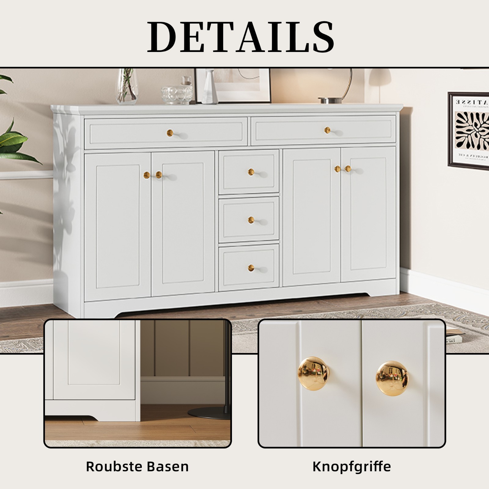 Dieses elegante Sideboard vereint Funktionalität und Stil. Mit zwei großen und drei kleinen Schubladen sowie vier Schranktüren bietet es reichlich Stauraum für Haushaltsgegenstände, Dekoration oder persönliche Dinge. Zwei verstellbare Einlegeböden sorgen für flexible Nutzungsmöglichkeiten, während die hochwertigen Knopfgriffe und die stabile bodenstehende Konstruktion das Design abrunden. Ideal für Wohn- oder Esszimmer, überzeugt dieses Möbelstück durch seine Kombination aus Praktikabilität, Ordnung und zeitloser Eleganz.