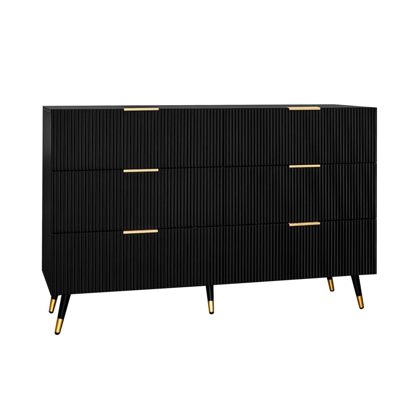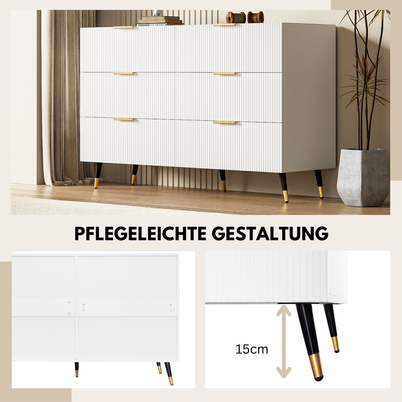 Die SeedWave Kommode vereint modernes Luxusdesign und Funktionalität mit sechs großzügigen Schubladen und 294L Stauraum. Das elegante Wellenmuster und goldene Akzente verleihen jedem Raum eine edle Note. Mit 15 cm Bodenfreiheit und Anti-Kipp-Design ist sie pflegeleicht und vielseitig einsetzbar. Ideal für Schlafzimmer, Wohnzimmer oder Büro.