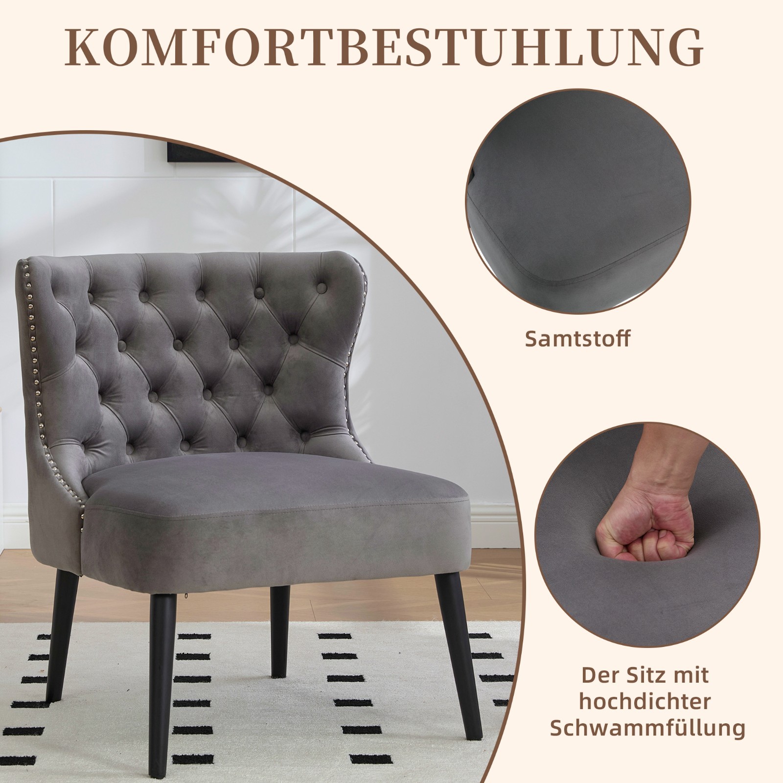 Dieser elegante Sessel verbindet stilvolles Design mit hohem Sitzkomfort und wird schnell zum Lieblingsstück in Ihrem Zuhause. Der weiche Samtbezug sorgt für ein luxuriöses Erscheinungsbild, während die geschwungene Rückenlehne mit klassischem Knopfdesign zeitlose Eleganz versprüht. Dekorative Metallnieten verleihen dem Möbelstück einen raffinierten Akzent und machen es zu einem echten Highlight in Ihrem Wohn- oder Schlafzimmer. Die Sitzfläche mit hochwertiger High-Density-Schaumfüllung bietet optimalen Komfort und langlebige Formstabilität. Abgerundet wird der Sessel durch robuste Massivholzfüße mit höhenverstellbaren Stützschrauben, die für Stabilität, Rutschfestigkeit und Anpassungsfähigkeit auf jedem Boden sorgen.