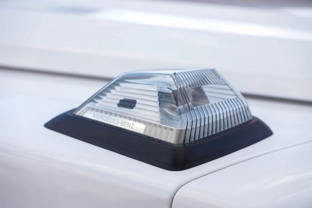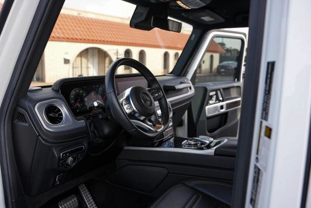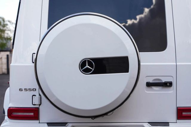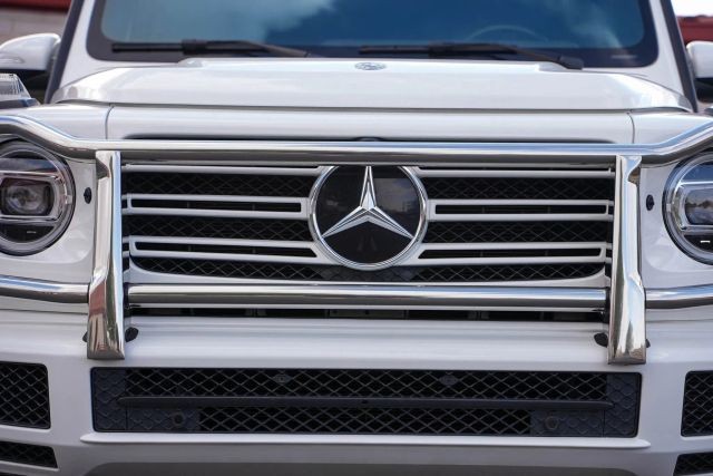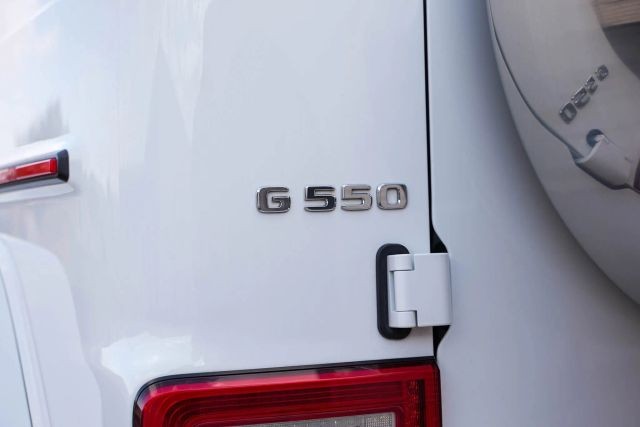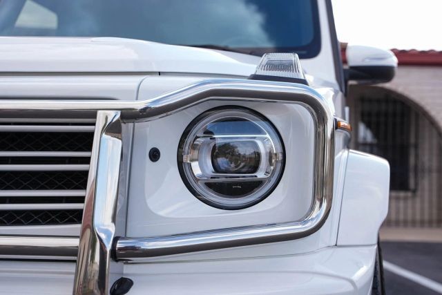 The Mercedes-Benz G-Class is easily identifiable and commands attention regardless of its configuration. Our test car, in Polar White, stands out with its sleek and sophisticated paint finish. This 2019 Mercedes-Benz G550 boasts the AMG-Line trim with 20-inch AMG multi-spoke wheels and Michelin tires. The brake calipers bear the Mercedes-Benz logo, and the flared wheel arches keep the large wheels in line. The SUV is adorned with a chrome brush guard, silver side strips, and an AMG Sport Exhaust at the rear. The interior, trimmed in Charcoal Leather, features brown accents on the seats and Brown Ash wood details. Infotainment and car settings are easily accessible through a 12.3-inch widescreen cluster, and an AMG steering wheel and floor mats complete the luxurious look.
