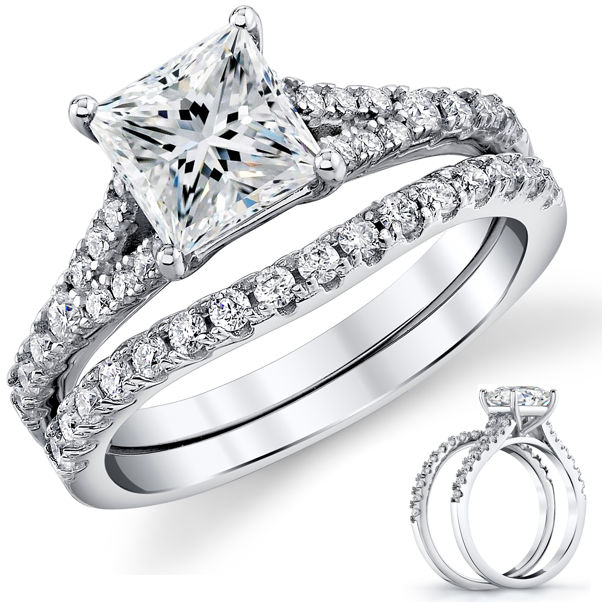 2.3Ct Princess-Cut Moissanite Catherdral Wedding Ring Band Bridal Set 18K White Gold over Silver