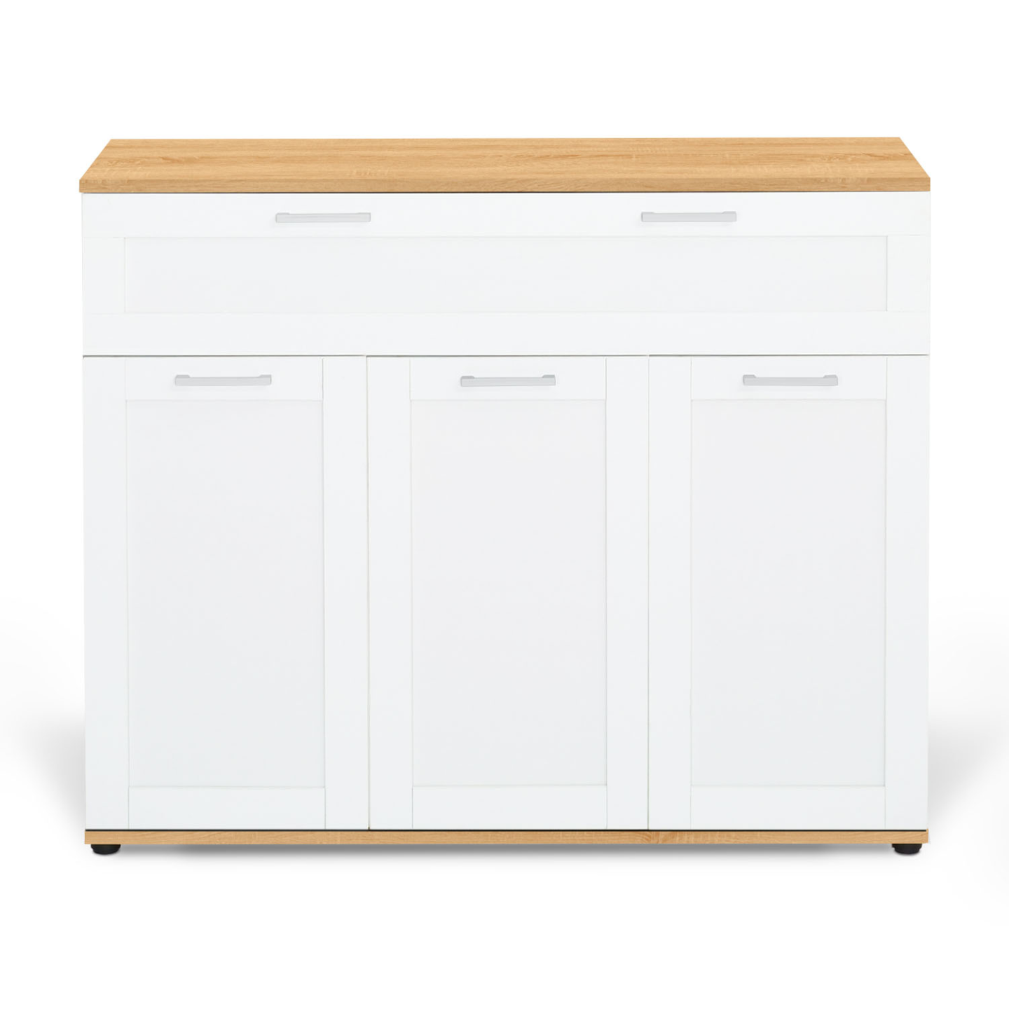 Pour une pièce de vie rangée et savamment décorée, choisissez le buffet salon VITO au coloris blanc et plateau façon bois !Le look tendance style campagne chic de ce buffet bas, son design massif mais élégant et ses couleurs sobres et naturelles se marieront parfaitement avec votre décoration intérieure !Son format pratique combinant des dimensions compactes et de nombreux rangements sera parfait pour optimiser et structurer votre espace, sans encombrer la pièce.Les 3 placards dotés chacun d'une étagère vous offriront l'espace nécessaire pour ranger vaisselle légère, petit électroménager ou encore livres de cuisine. Quant à son grand tiroir de 92,5 cm de longueur, il sera idéal pour vos couverts, ustensiles de cuisine, sets de table ou pourquoi pas pour dissimuler quelques papiers, pour un intérieur net et rangé !Le joli plateau bois façon hêtre mettra en valeur objets de déco ou plantes d'ornement ! Le rappel du coloris bois à la base du meuble en souligne le design et y ajoute une touche de légèreté.La structure en panneaux de particules de ce buffet salle à manger enfilade est stable et robuste.Un grand buffet bas qui ne laissera pas vos invités indifférents !Dimensions du buffet 3 portes VITO 100 cmDimensions globales : Longueur 100 cm x largeur 34 cm x Hauteur 80 cmDimensions intérieures du tiroir : L. 92,5 x pr. 29 x H. 16,5 cmDimensions intérieures des placards : L. 31,5 x pr. 30,5 x H. 55,5 cmHauteur de l'étagère intérieure dans les placards : 27,3 cmLongueur des poignées : 11 cmLargeur de l'encadrement des portes : 5 cmStructure en panneaux de particules 1,5 et 1,2 cmÀ monter soi-mêmeRetrouvez l'ensemble de notre collection de meubles modernes sur notre boutique en ligne !