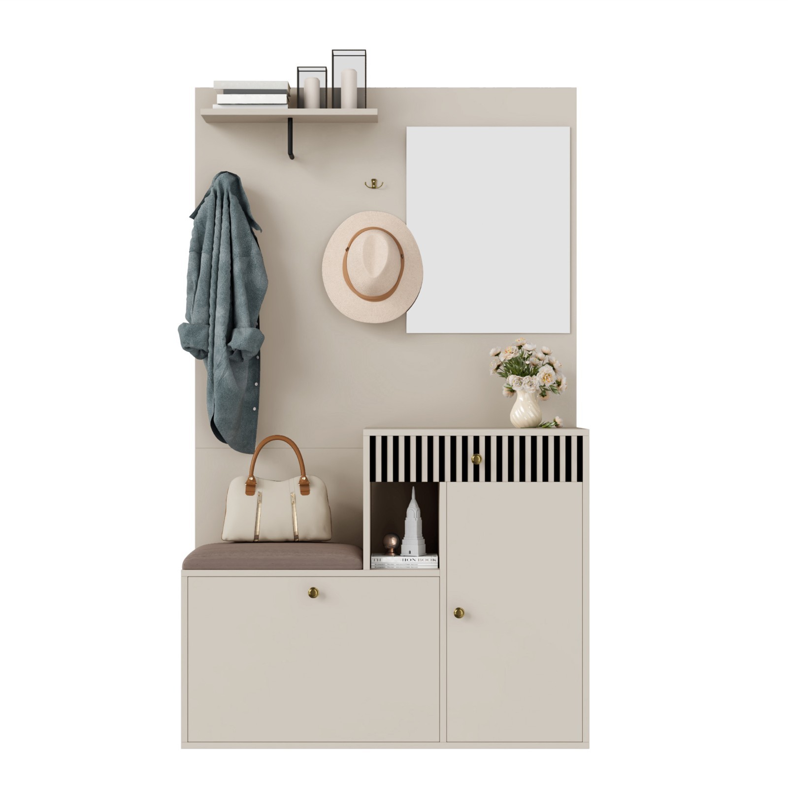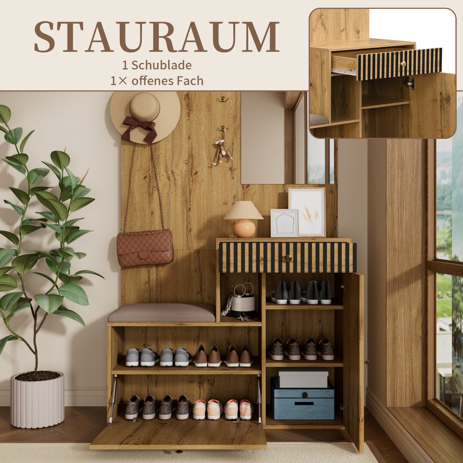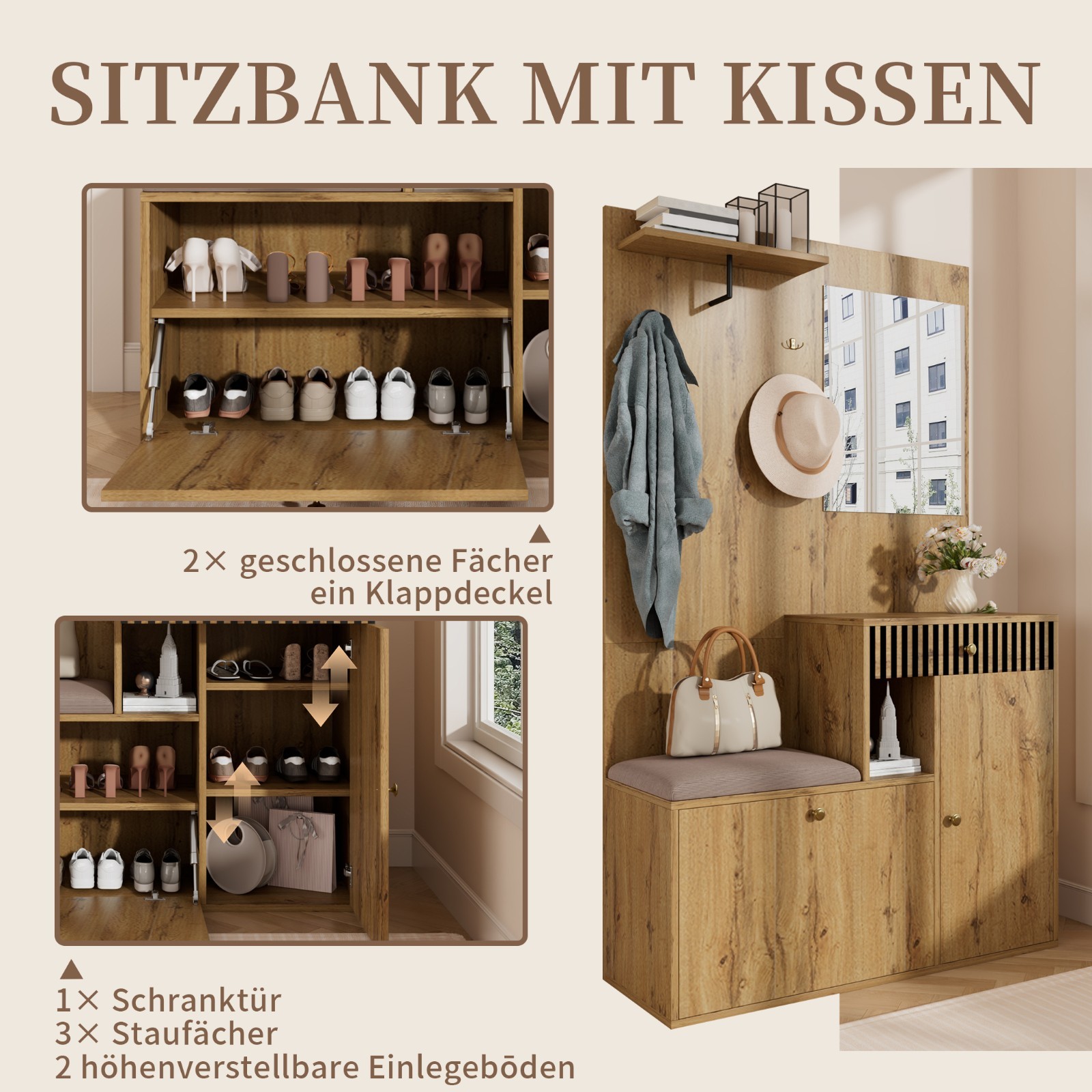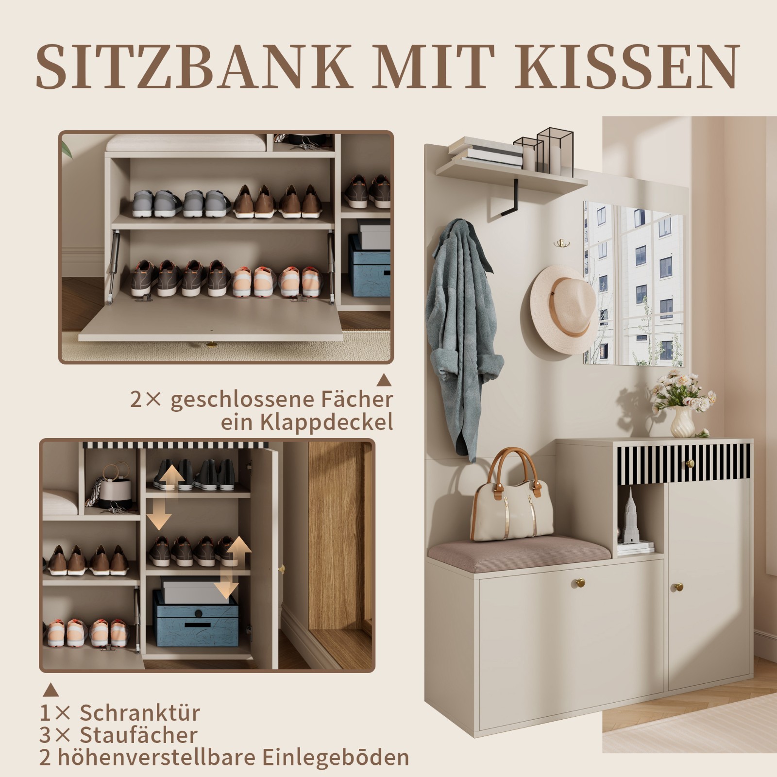 Praktische Sitzbank mit Kissen: Die integrierte Sitzbank sorgt für Komfort beim An- und Ausziehen von Schuhen. Das weiche Kissen ist abnehmbar und passt sich Ihrem Komfortbedarf an, während die Sitzbank gleichzeitig zusätzlichen Stauraum darunter bietet.