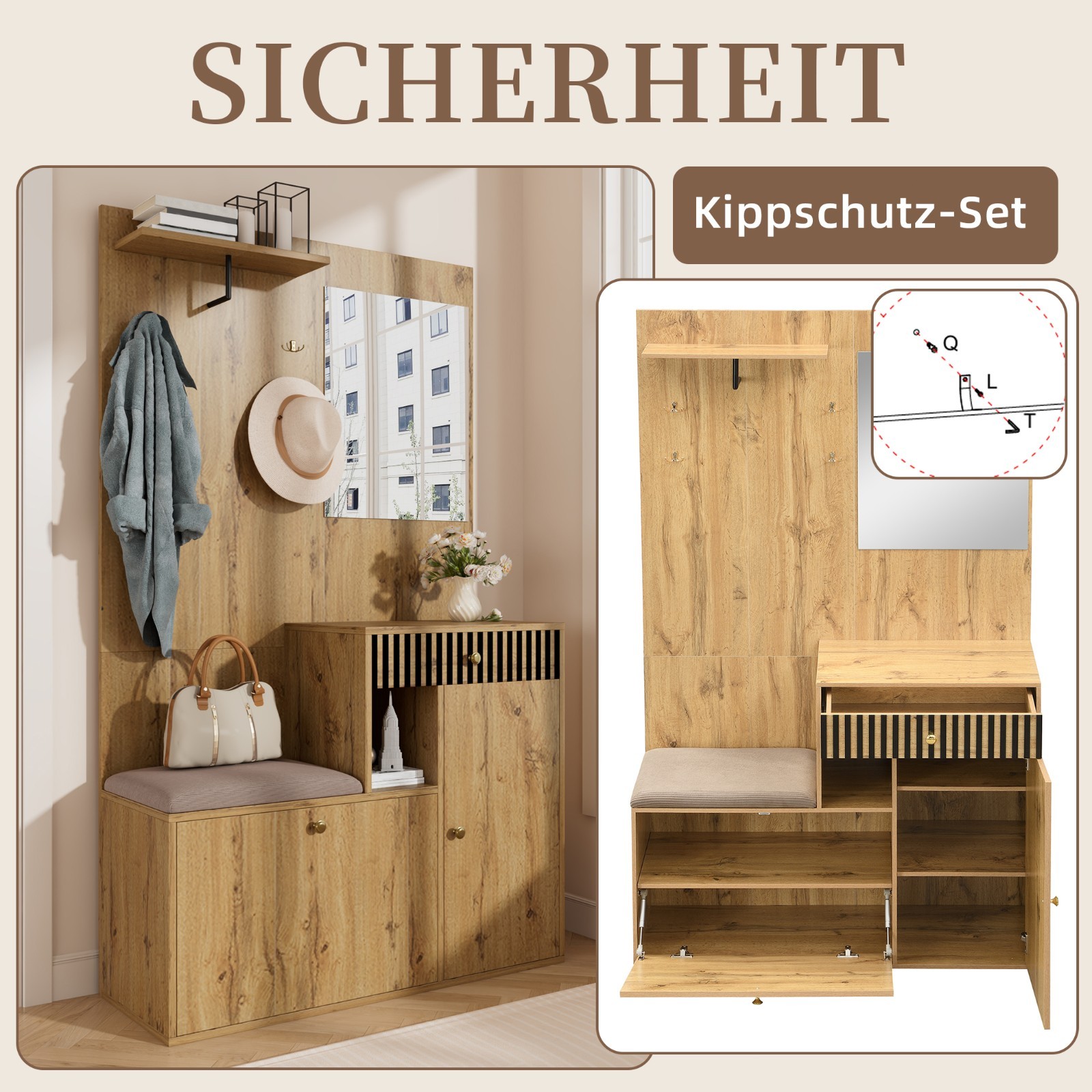 Diese moderne Garderobe vereint Stil, Komfort und Funktionalität in einem Möbelstück. Mit einer Kombination aus Hängeregal, Spiegel, Schubladen, offenen und geschlossenen Fächern bietet sie reichlich Stauraum für Jacken, Schuhe, Taschen und Accessoires. Die integrierte Sitzbank mit weichem Kissen macht das An- und Ausziehen von Schuhen besonders bequem, während die kontrastfarbenen Schubladenfronten ein optisches Highlight setzen. Vier Doppelhaken sorgen für Ordnung, der große Spiegel erweitert den Raum optisch. Für zusätzliche Sicherheit wird die Garderobe mit einem Kippschutz-Set geliefert, das eine stabile Befestigung an der Wand ermöglicht. Ideal für Flur, Diele oder Eingangsbereich – funktional, praktisch und stilvoll zugleich.