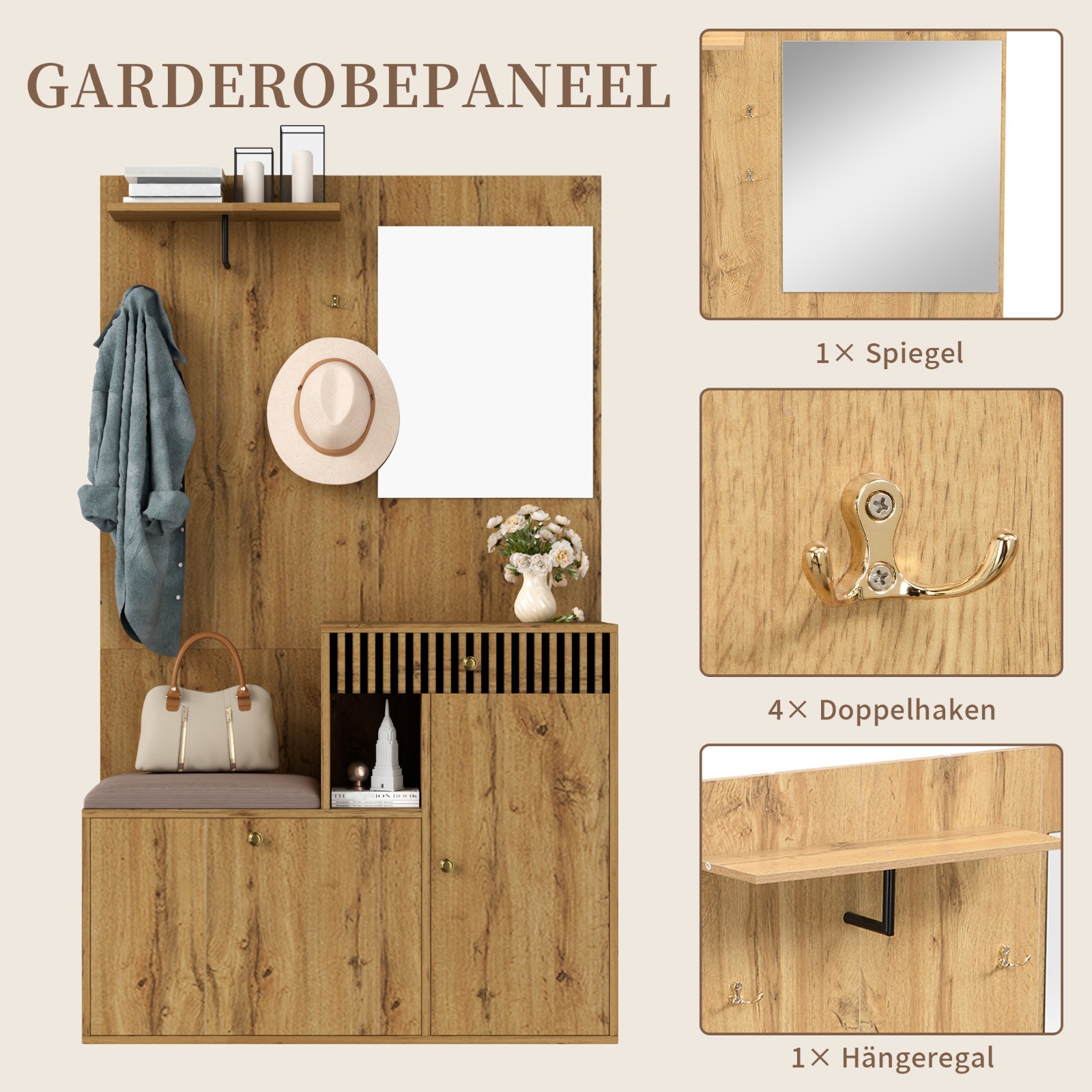 Funktionale Haken und Spiegel: Vier Doppelhaken ermöglichen das einfache Aufhängen von Jacken, Taschen oder Schals. Der angebrachte Spiegel bietet zusätzlichen Komfort und erweitert optisch den Raum.