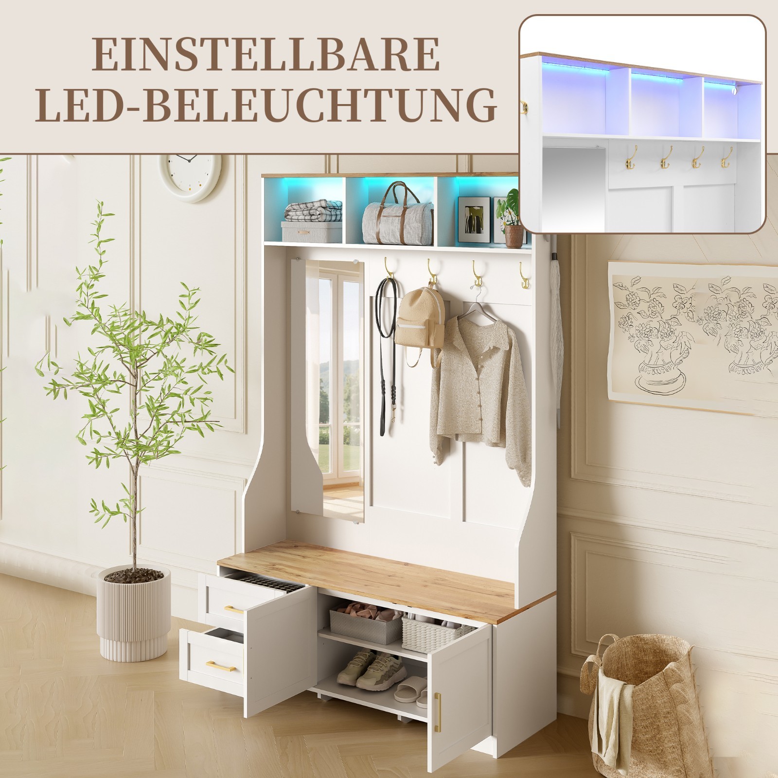 Garderobepaneel mit Spiegel und Haken: Das integrierte Garderobepaneel verfügt über einen großen Spiegel und vier stabile Doppelhaken, ideal für Jacken, Mäntel oder Taschen. Zusätzlich bieten jeweils zwei Doppelhaken an beiden Seiten weitere praktische Aufhängemöglichkeiten für Kleidung oder Accessoires, damit alles übersichtlich bleibt.