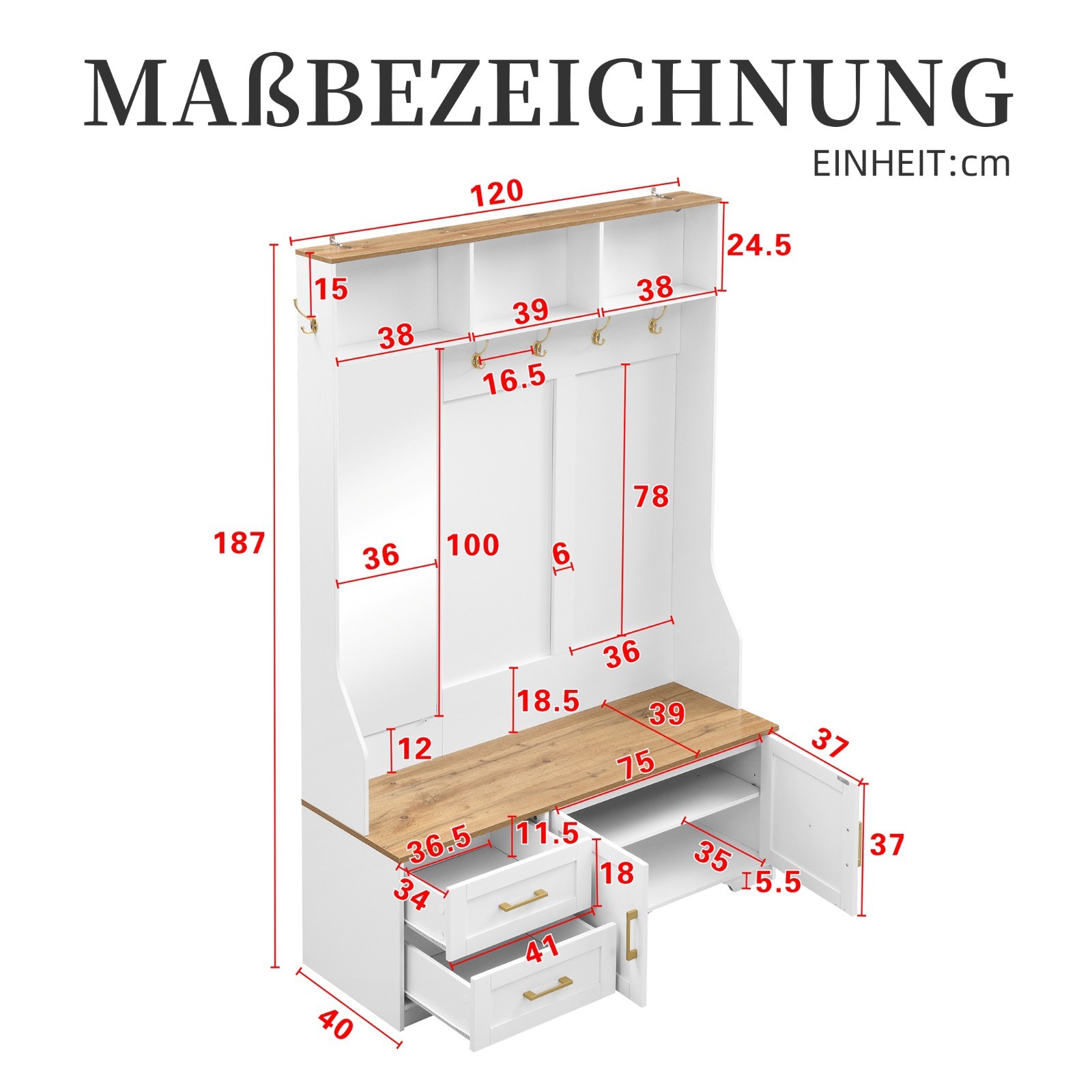 Maße: 120 (L) × 40 (B) x 187 (H) cm