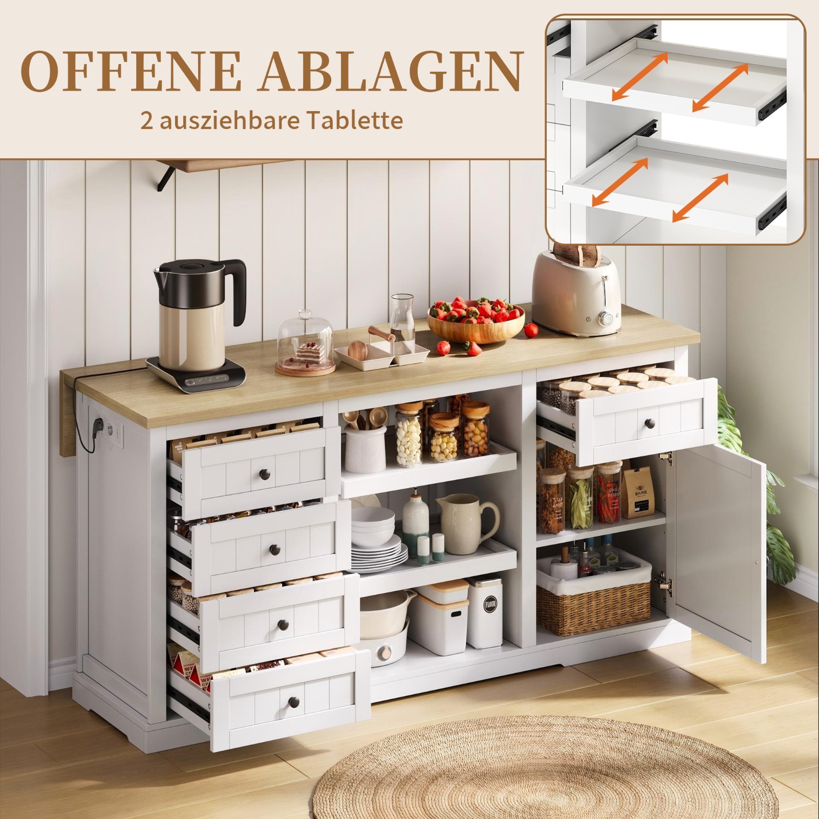 Funktionale Mittelzone mit ausziehbaren Ablageflächen: In der offenen Mittelpartie sorgen drei Ablageflächen für zusätzlichen Stauraum. Zwei davon sind ausziehbar und lassen sich als Serviertabletts oder zusätzliche Arbeitsfläche nutzen – ideal für Küche, Esszimmer oder Homeoffice. Die offene Struktur ermöglicht zugleich einen schnellen Zugriff auf häufig genutzte Utensilien.