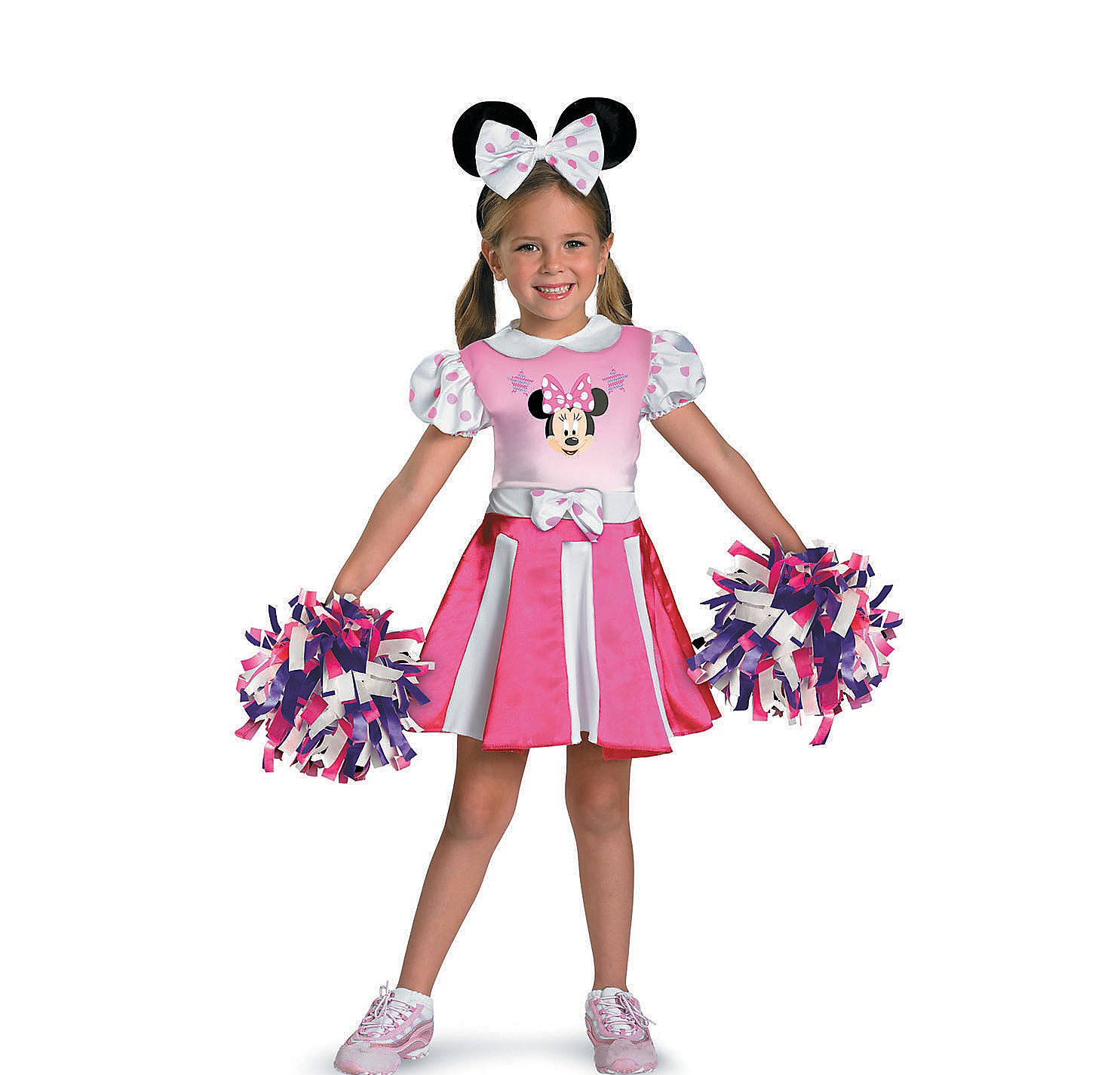Many little girls love Minnie Mouse. Now they can dress up with her on Halloween in this Minnie Mouse Cheerleader Costume for Toddler Girls. This costume for girls includes a pink dress with ruffled sleeves. The sleeves are white with pink polka dots. The top of the dress has a picture of Minny Mouse. This Halloween costume includes a pair of pom poms to help the little girl feel the spirit.