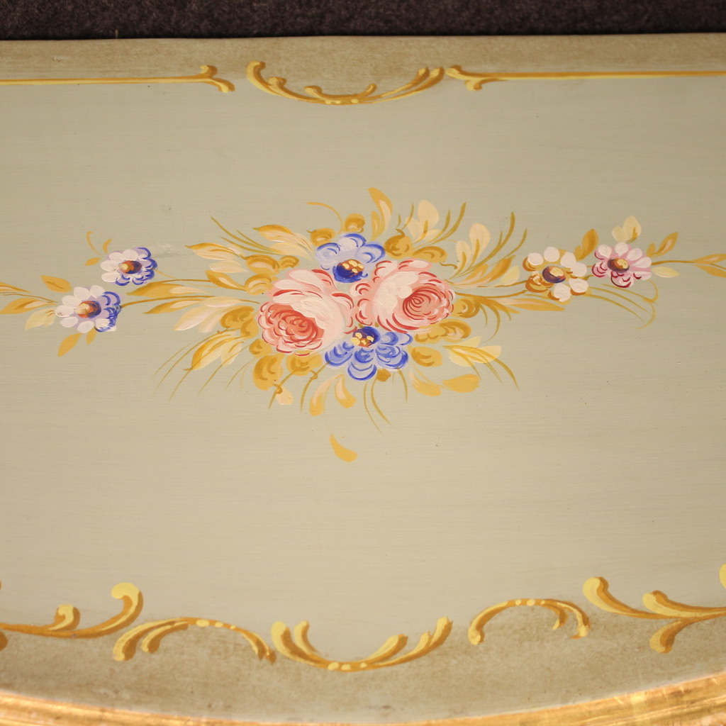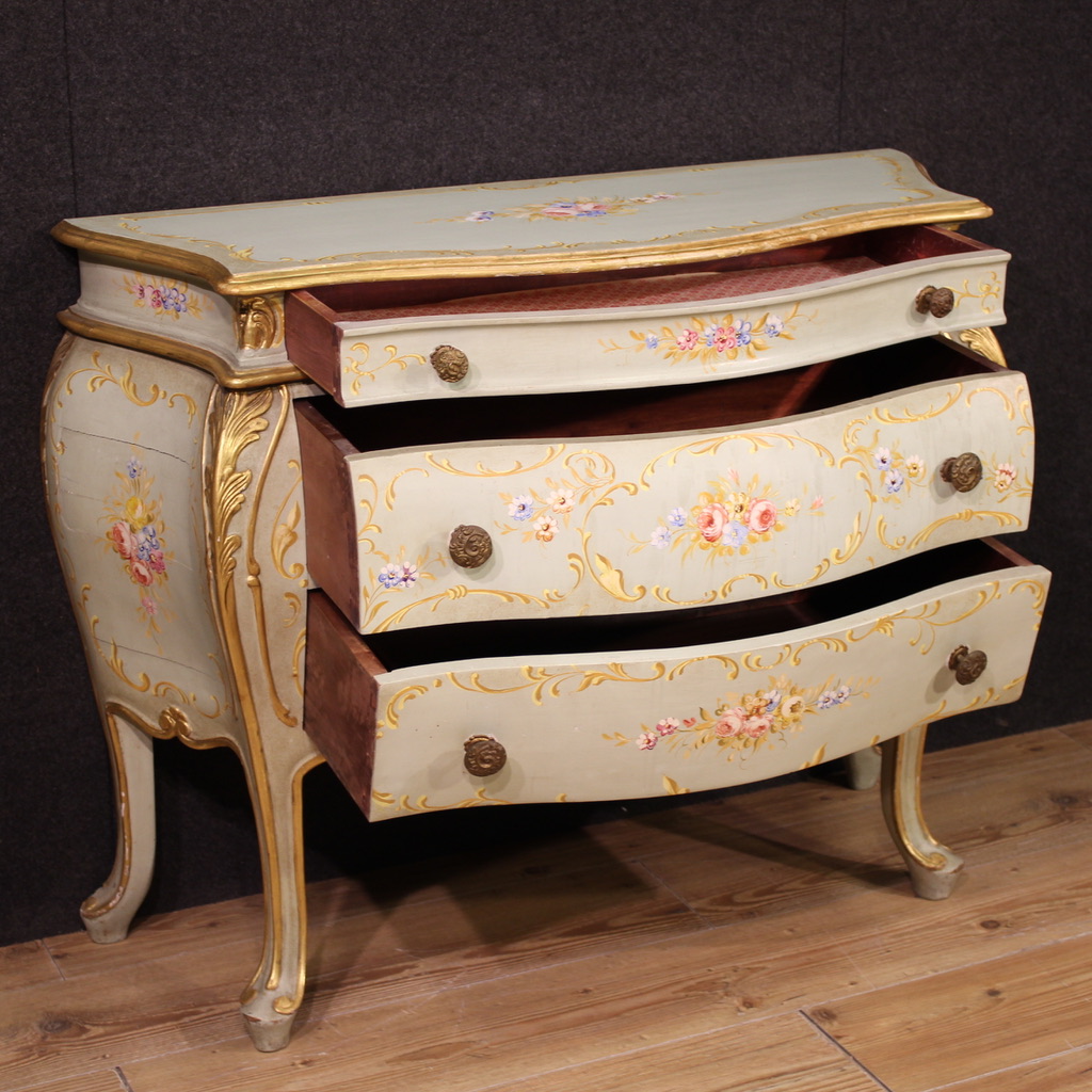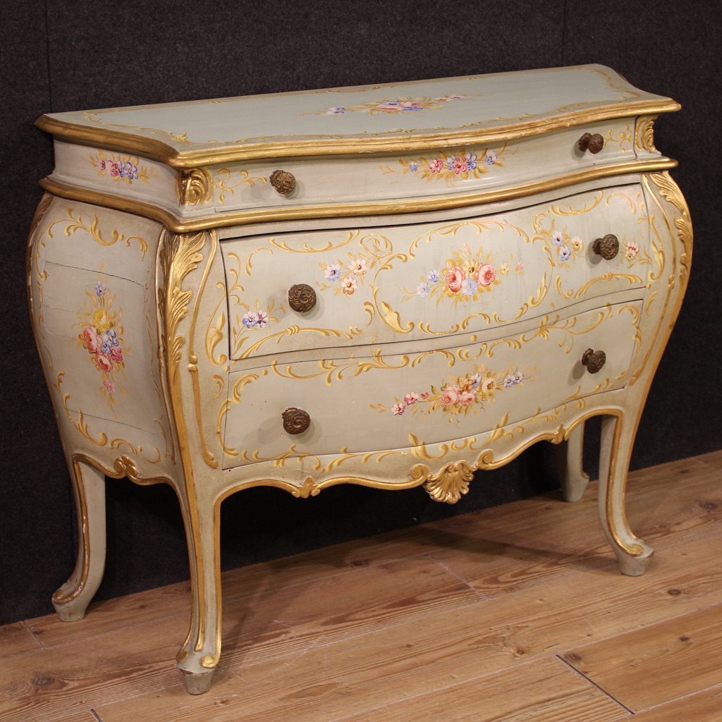 Elegante comò veneziano della metà del XX secolo. Mobile mosso e bombato finemente scolpito, laccato, dorato e dipinto con decori floreali di grande piacevolezza. Comò munito di tre cassetti e piano superiore ligneo in carattere, di buona misura e servizio. Mobile da camera o salotto, di ottima proporzione, per antiquari e arredatori.